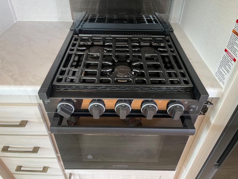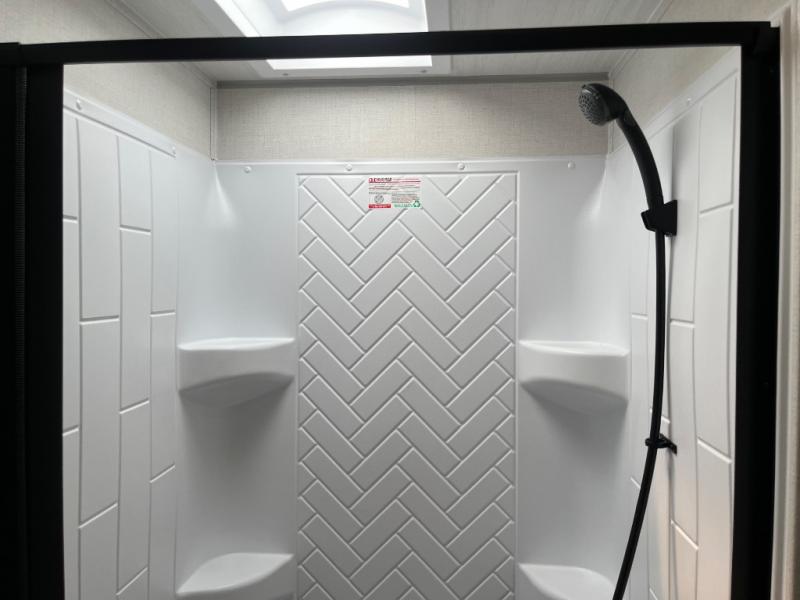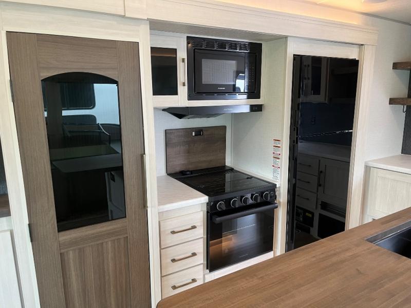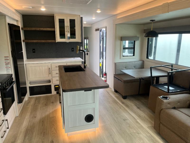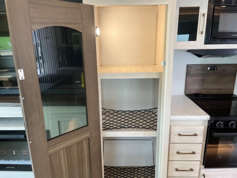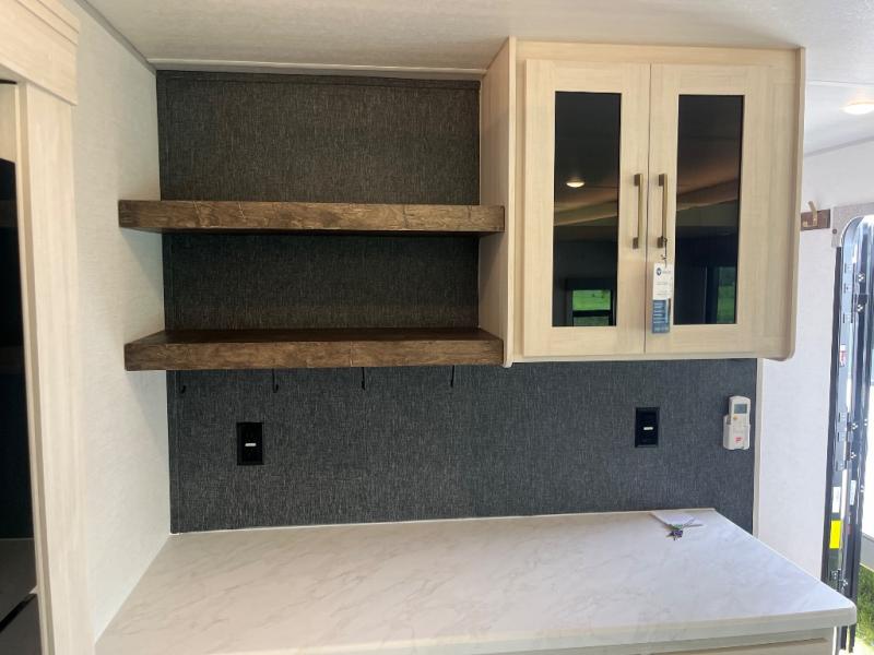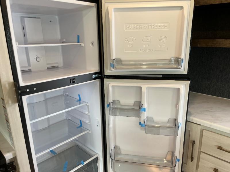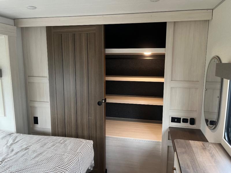 If luxury is what you're looking for, you won't have to search far with this travel trailer! There are triple slides, with dual opposing slides in the main living area for maximum space. The kitchen island gives a more residential feel to this space, plus there is a pantry, a hutch with shelves, a 10 cu. ft. 12V black glass refrigerator, and more kitchen features you are sure to love. The rear living area includes a tri-fold sofa to provide sleeping space for two overnight guests, and there is a theater seat across from the fireplace and HD TV. You'll also enjoy dining at the free-standing dinette with a multi-purpose ottoman! When it's time to call it a night, you can clean up in the spacious full bath, then head to the front master bedroom to retire. There is a custom king bed slide out here, along with a full-wall wardrobe in front, a dresser, a closet with washer and dryer prep, plus a bedroom fireplace!