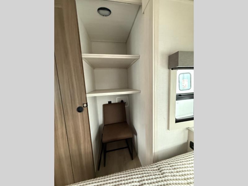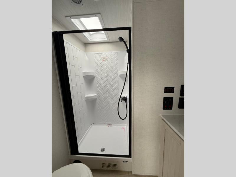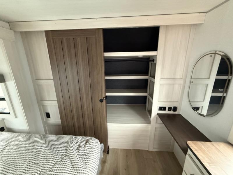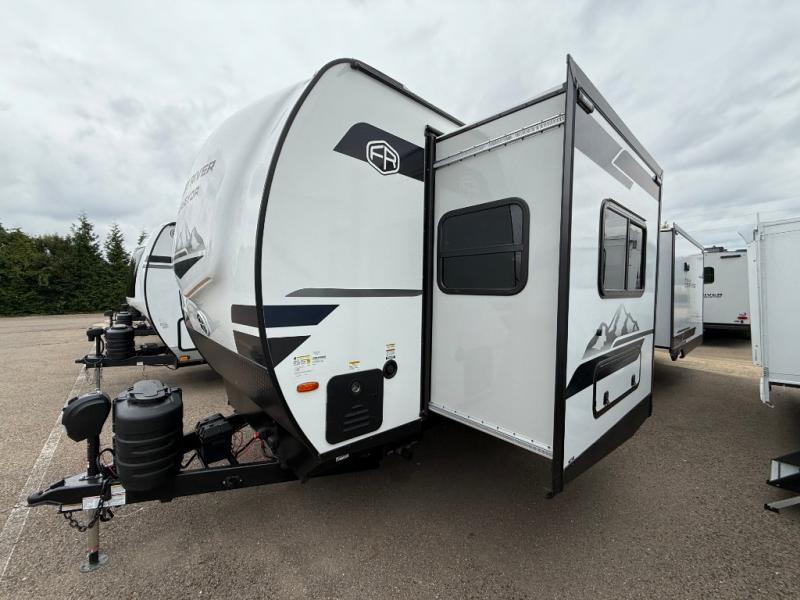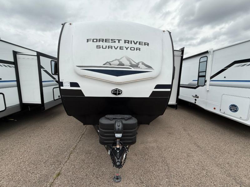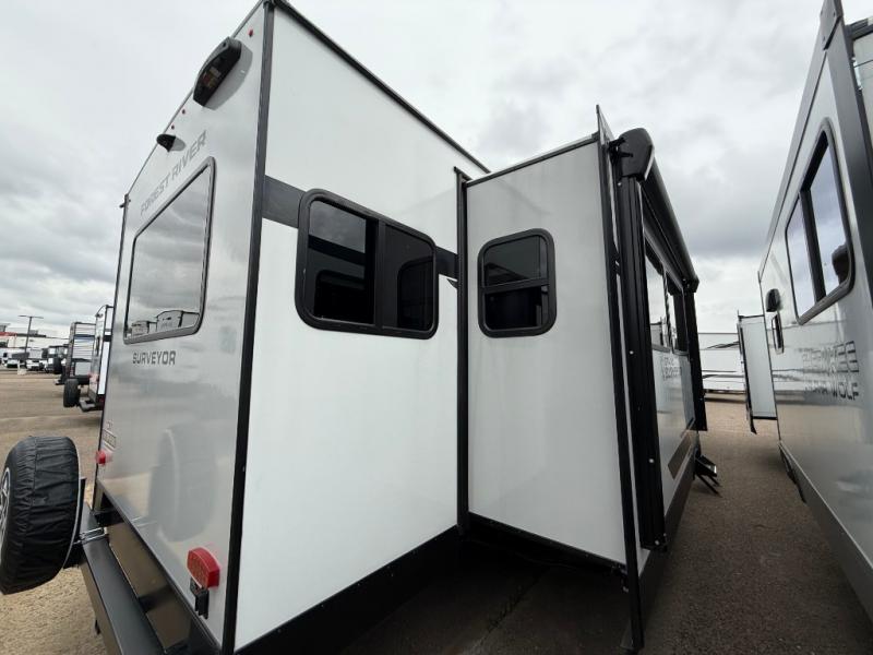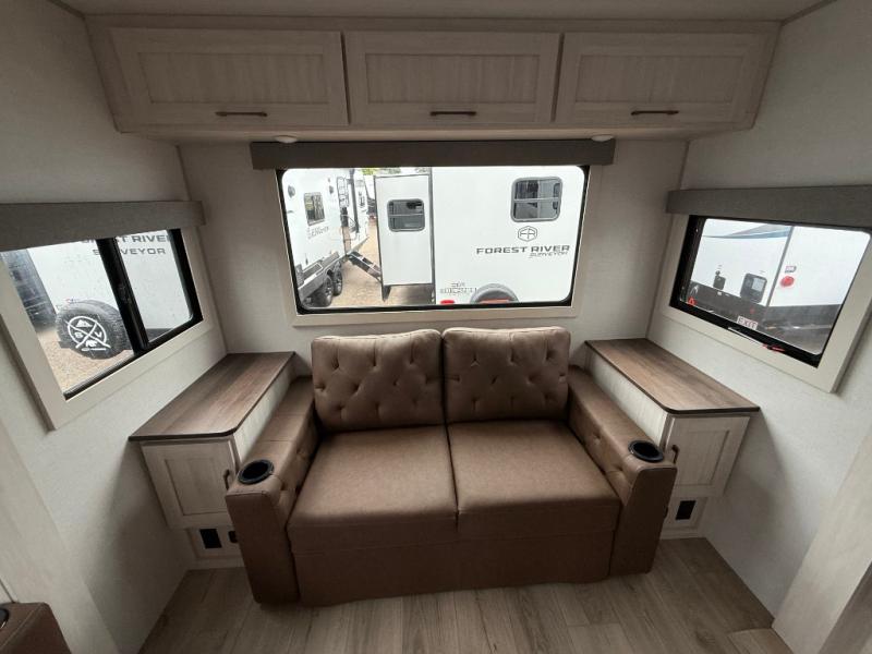 With any Grand Surveyor travel trailer by Forest River you will enjoy turn-key ready-to-go features and quality construction! Each model includes Azdel composite walls and a gel coated fiberglass front cap with an automotive style tinted windshield for a sleek look. There are friction hinge black glass entry door(s), an adjustable platform step with a night light, plus Goodyear tires and a power tongue jack for easy towing. The interior will have you feeling right at home with roller shades, residential faucets, sinks, and bathroom vanity, plus Surf(x) seamless countertops throughout. You can also plan for adventure with a 2" rear accessory and exterior spray port, and there are slam latch exterior baggage doors throughout to keep all your gear secure. Other stand-out features include a central vacuum system, a 200 watt solar panel with a 30 amp controller, a tankless water heater, carpet-free interiors, and the list goes on!