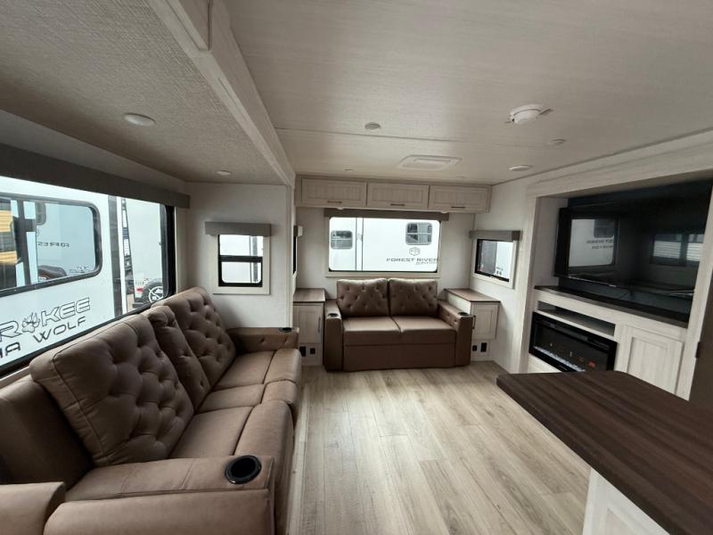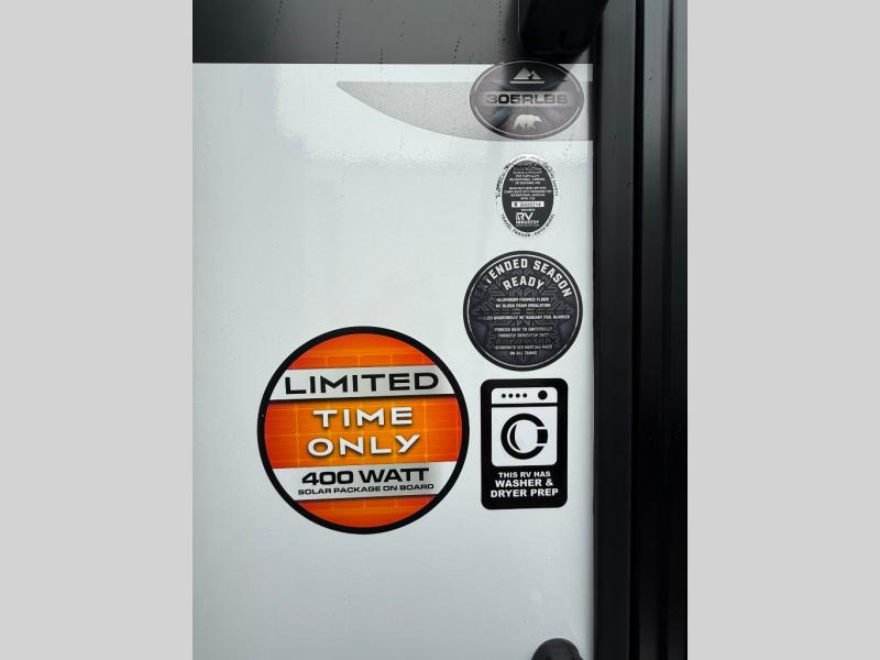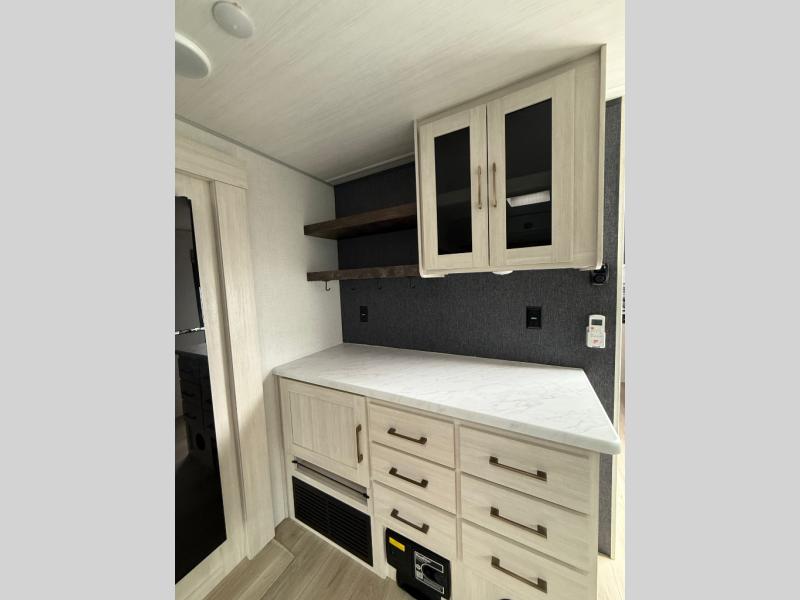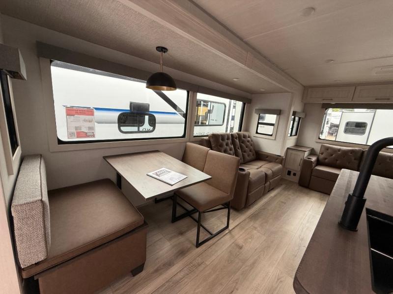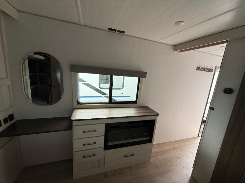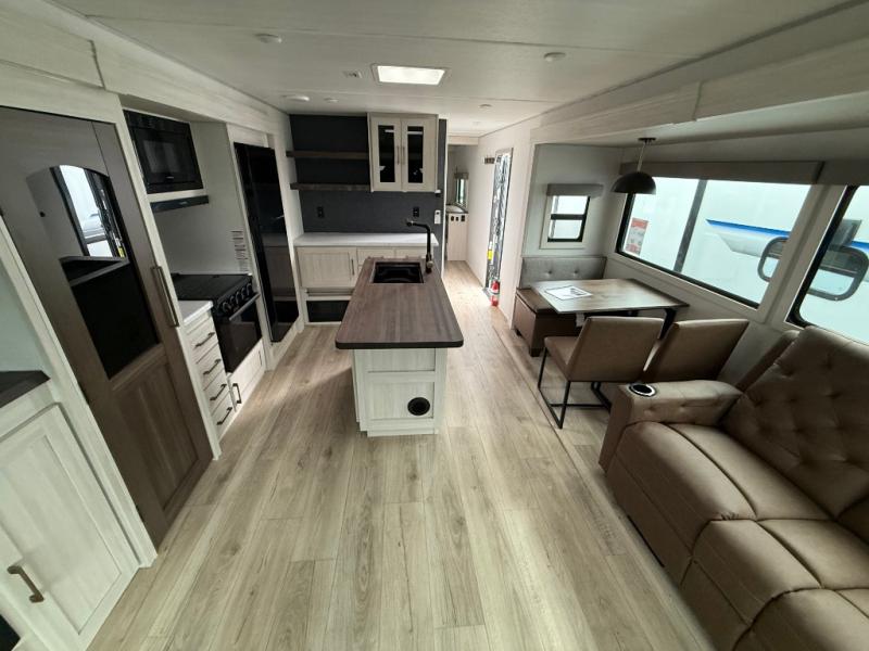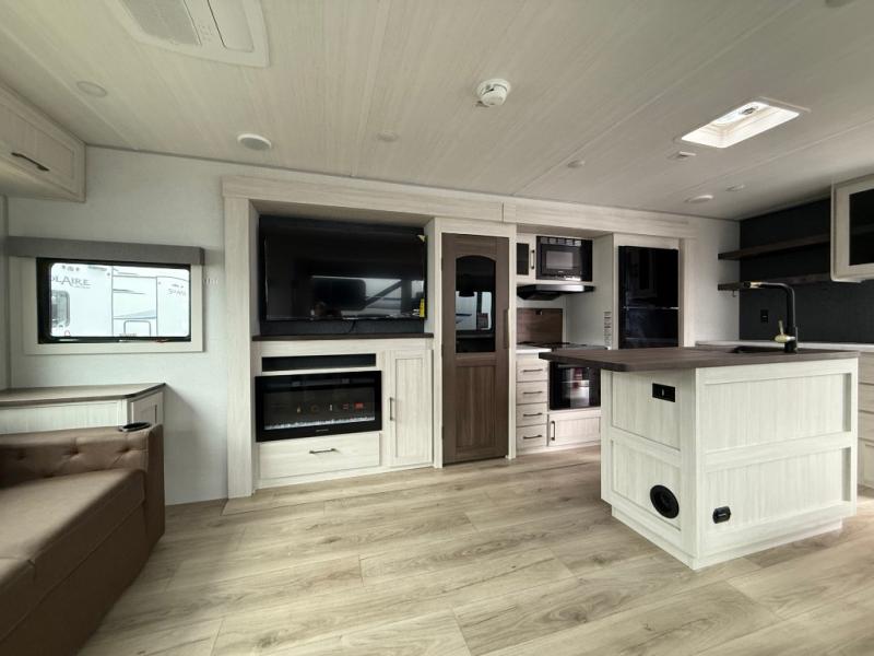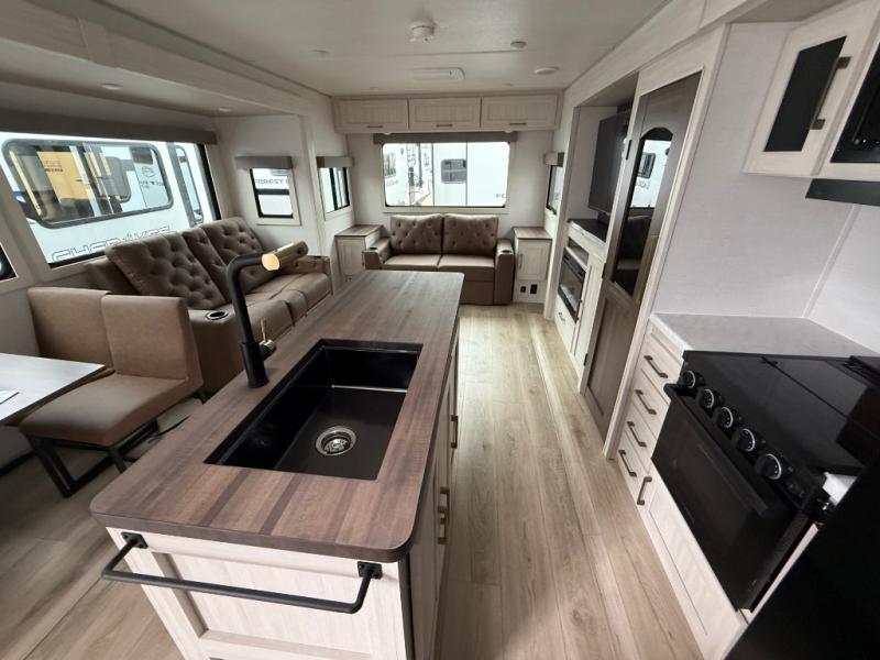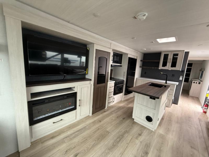 If luxury is what you're looking for, you won't have to search far with this travel trailer! There are triple slides, with dual opposing slides in the main living area for maximum space. The kitchen island gives a more residential feel to this space, plus there is a pantry, a hutch with shelves, a 10 cu. ft. 12V black glass refrigerator, and more kitchen features you are sure to love. The rear living area includes a tri-fold sofa to provide sleeping space for two overnight guests, and there is a theater seat across from the fireplace and HD TV. You'll also enjoy dining at the free-standing dinette with a multi-purpose ottoman! When it's time to call it a night, you can clean up in the spacious full bath, then head to the front master bedroom to retire. There is a custom king bed slide out here, along with a full-wall wardrobe in front, a dresser, a closet with washer and dryer prep, plus a bedroom fireplace!