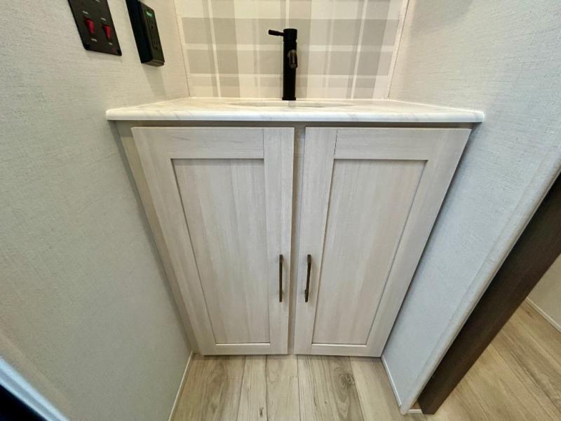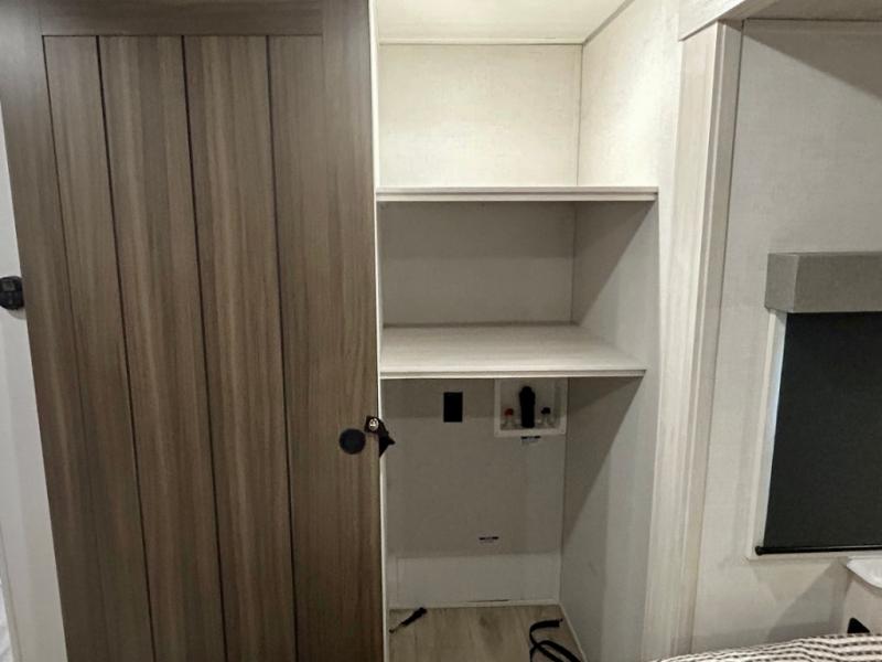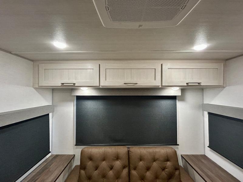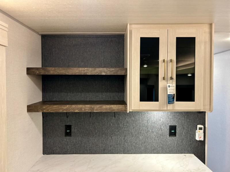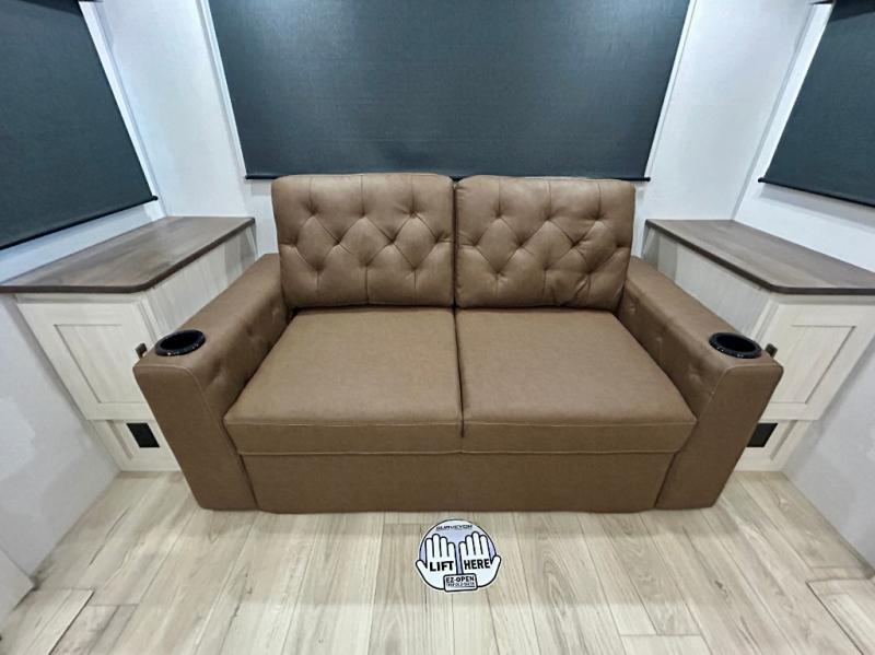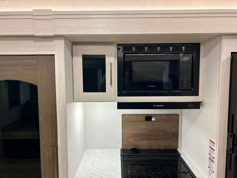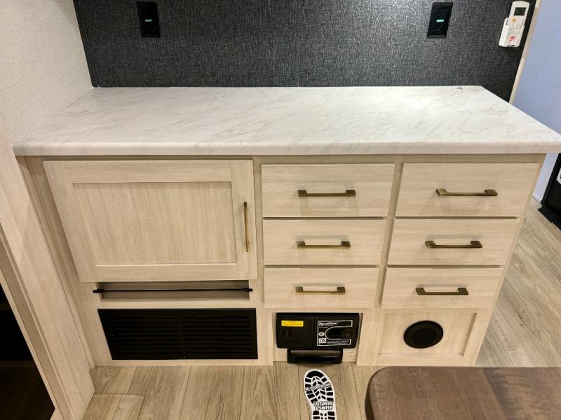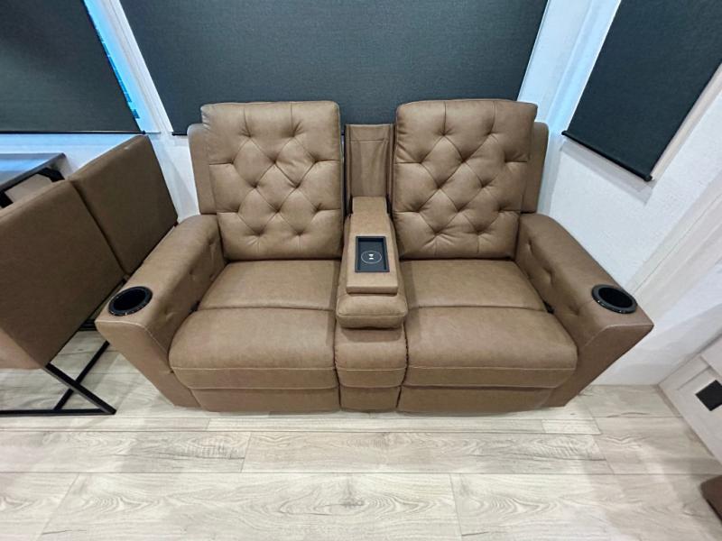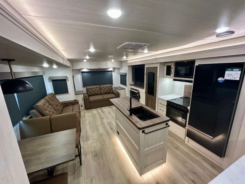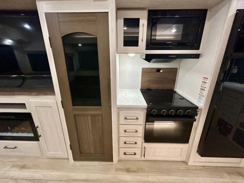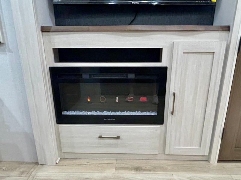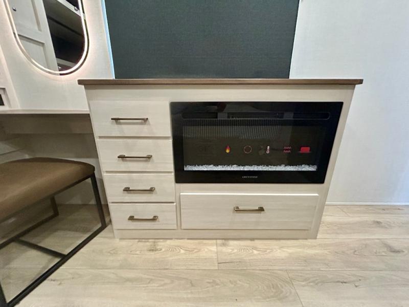If luxury is what you're looking for, you won't have to search far with this travel trailer! There are triple slides, with dual opposing slides in the main living area for maximum space. The kitchen island gives a more residential feel to this space, plus there is a pantry, a hutch with shelves, a 10 cu. ft. 12V black glass refrigerator, and more kitchen features you are sure to love. The rear living area includes a tri-fold sofa to provide sleeping space for two overnight guests, and there is a theater seat across from the fireplace and HD TV. You'll also enjoy dining at the free-standing dinette with a multi-purpose ottoman! When it's time to call it a night, you can clean up in the spacious full bath, then head to the front master bedroom to retire. There is a custom king bed slide out here, along with a full-wall wardrobe in front, a dresser, a closet with washer and dryer prep, plus a bedroom fireplace!