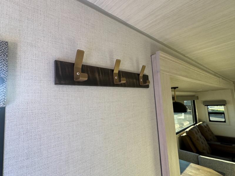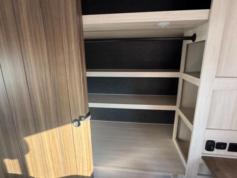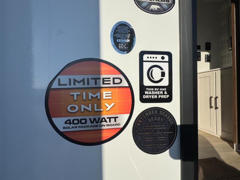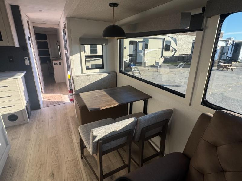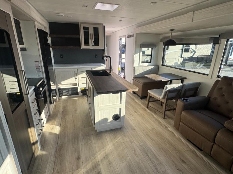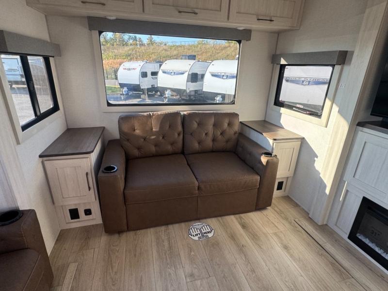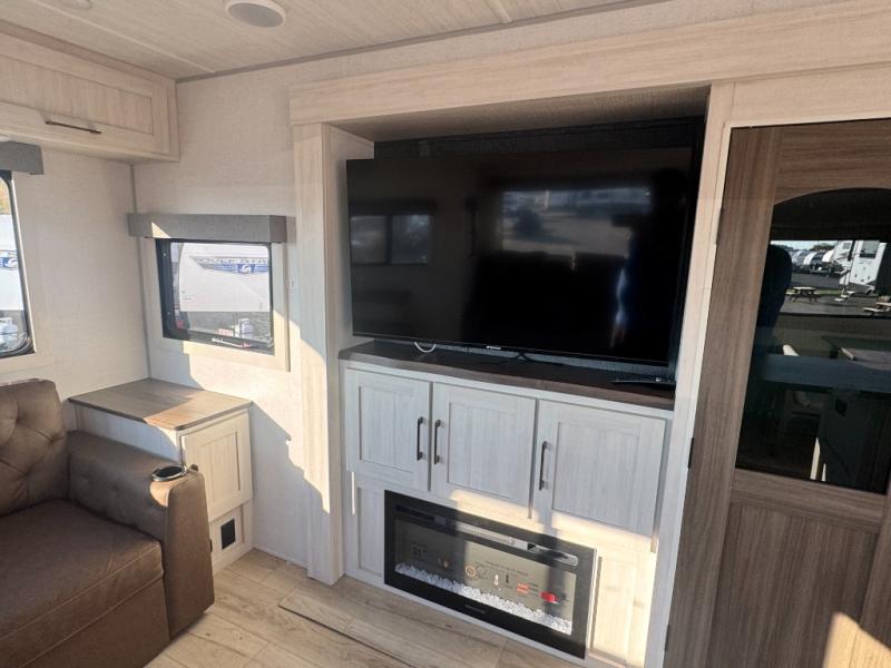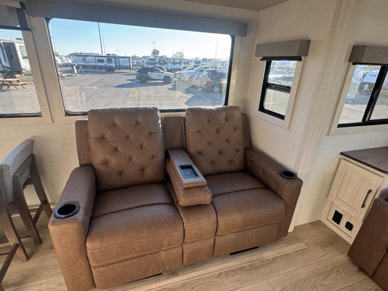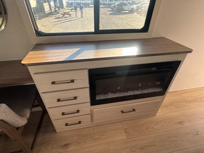 If luxury is what you're looking for, you won't have to search far with this travel trailer! There are triple slides, with dual opposing slides in the main living area for maximum space. The kitchen island gives a more residential feel to this space, plus there is a pantry, a hutch with shelves, a 10 cu. ft. 12V black glass refrigerator, and more kitchen features you are sure to love. The rear living area includes a tri-fold sofa to provide sleeping space for two overnight guests, and there is a theater seat across from the fireplace and HD TV. You'll also enjoy dining at the free-standing dinette with a multi-purpose ottoman! When it's time to call it a night, you can clean up in the spacious full bath, then head to the front master bedroom to retire. There is a custom king bed slide out here, along with a full-wall wardrobe in front, a dresser, a closet with washer and dryer prep, plus a bedroom fireplace!