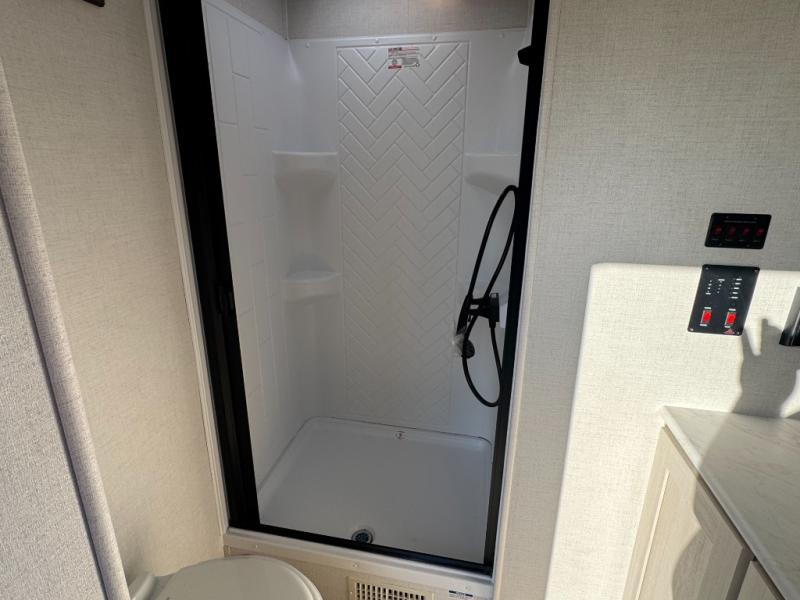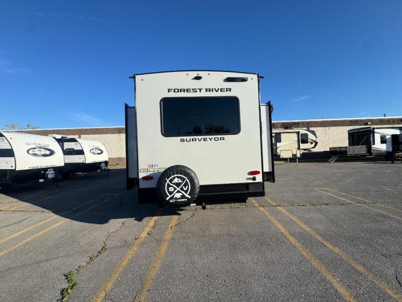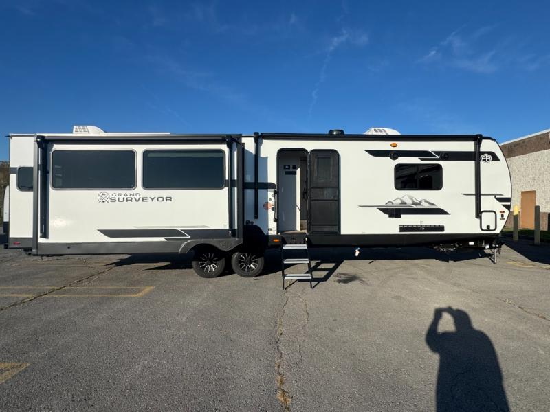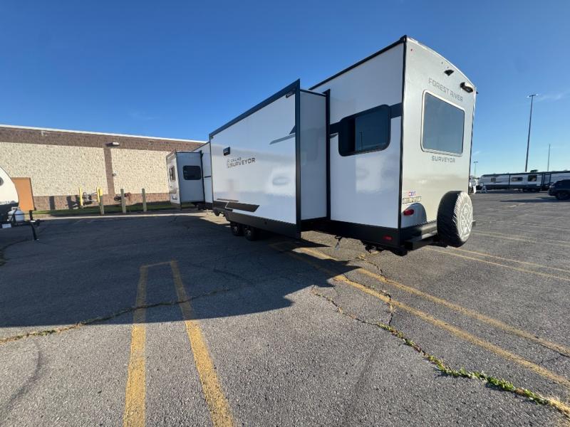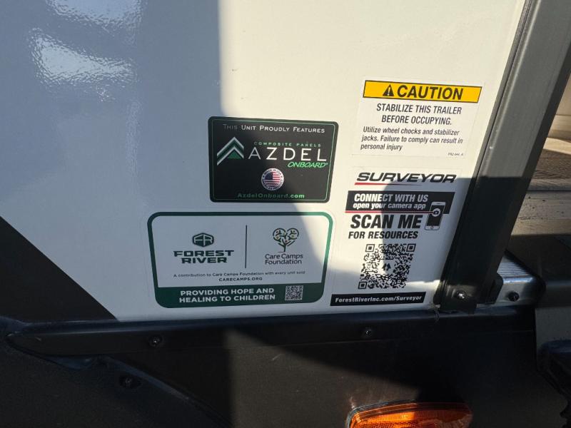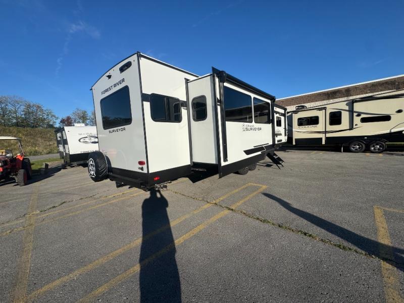 With any Grand Surveyor travel trailer by Forest River you will enjoy turn-key ready-to-go features and quality construction! Each model includes Azdel composite walls and a gel coated fiberglass front cap with an automotive style tinted windshield for a sleek look. There are friction hinge black glass entry door(s), an adjustable platform step with a night light, plus Goodyear tires and a power tongue jack for easy towing. The interior will have you feeling right at home with roller shades, residential faucets, sinks, and bathroom vanity, plus Surf(x) seamless countertops throughout. You can also plan for adventure with a 2" rear accessory and exterior spray port, and there are slam latch exterior baggage doors throughout to keep all your gear secure. Other stand-out features include a central vacuum system, a 200 watt solar panel with a 30 amp controller, a tankless water heater, carpet-free interiors, and the list goes on!