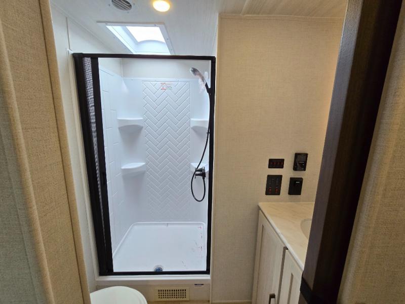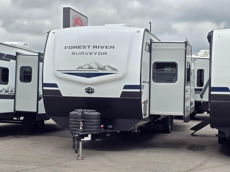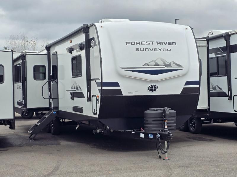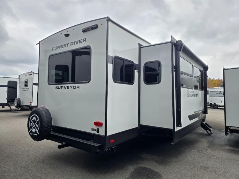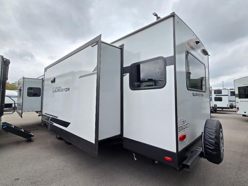 With any Grand Surveyor travel trailer by Forest River you will enjoy turn-key ready-to-go features and quality construction! Each model includes Azdel composite walls and a gel coated fiberglass front cap with an automotive style tinted windshield for a sleek look. There are friction hinge black glass entry door(s), an adjustable platform step with a night light, plus Goodyear tires and a power tongue jack for easy towing. The interior will have you feeling right at home with roller shades, residential faucets, sinks, and bathroom vanity, plus Surf(x) seamless countertops throughout. You can also plan for adventure with a 2" rear accessory and exterior spray port, and there are slam latch exterior baggage doors throughout to keep all your gear secure. Other stand-out features include a central vacuum system, a 200 watt solar panel with a 30 amp controller, a tankless water heater, carpet-free interiors, and the list goes on!