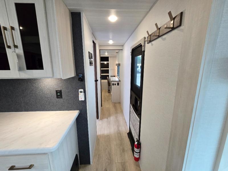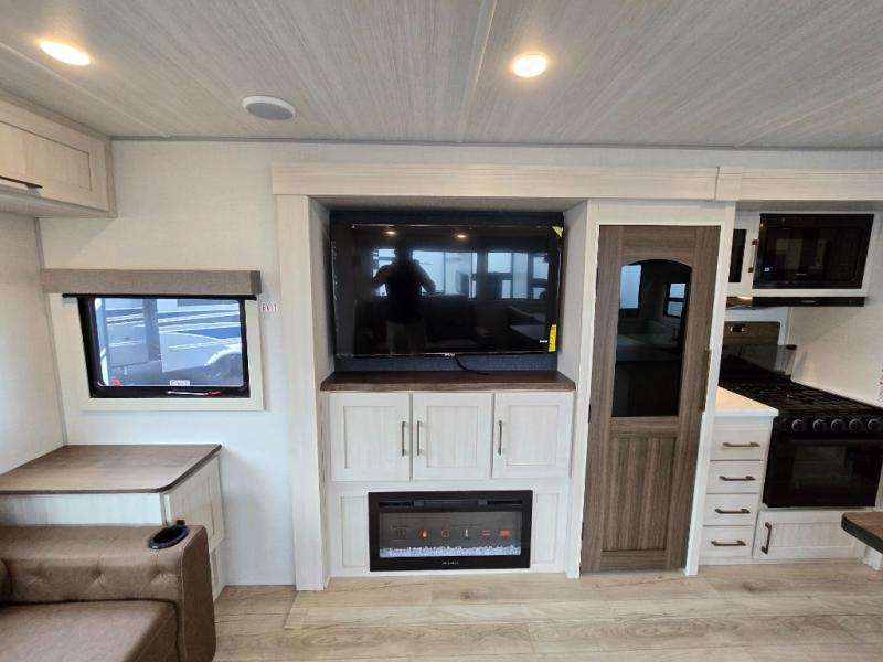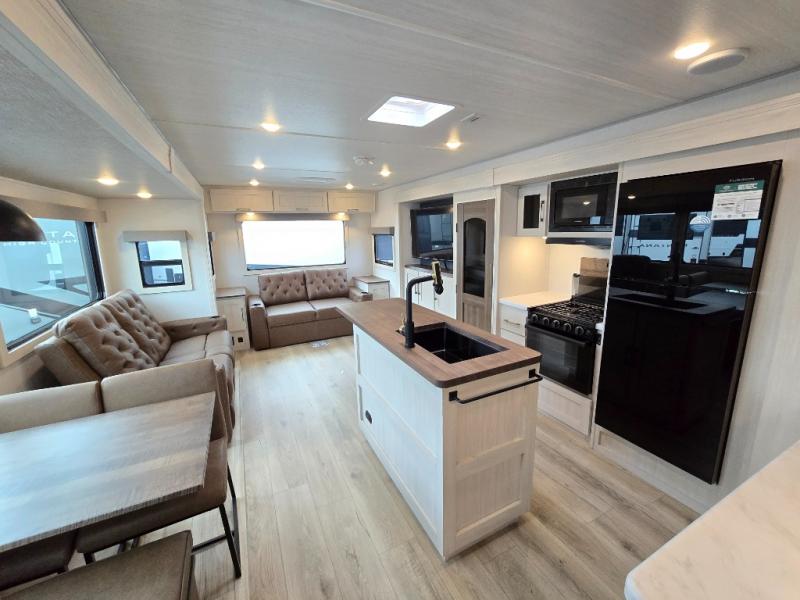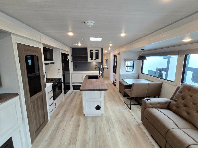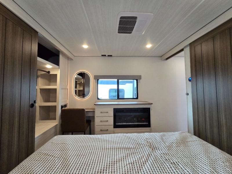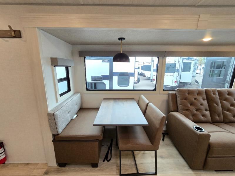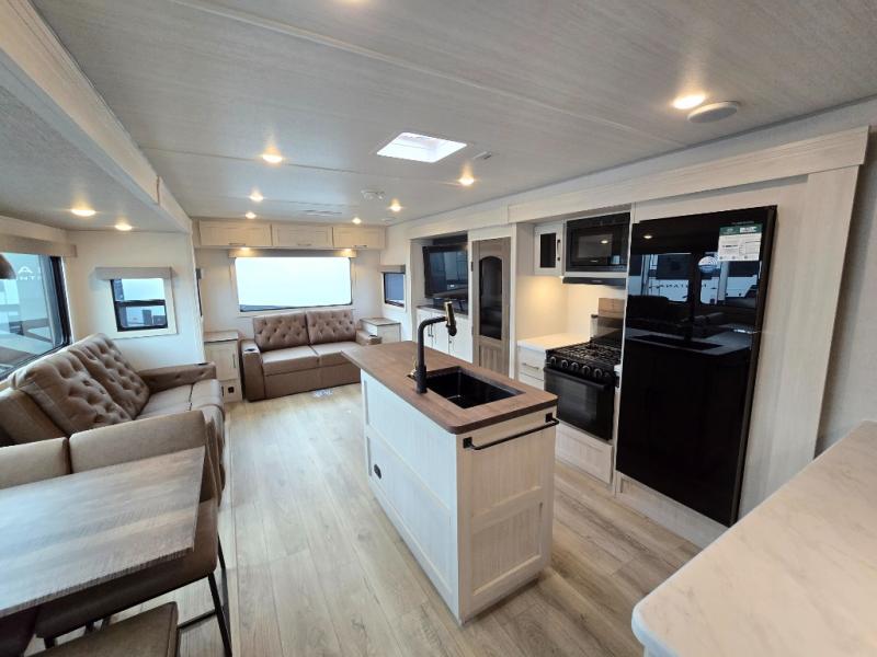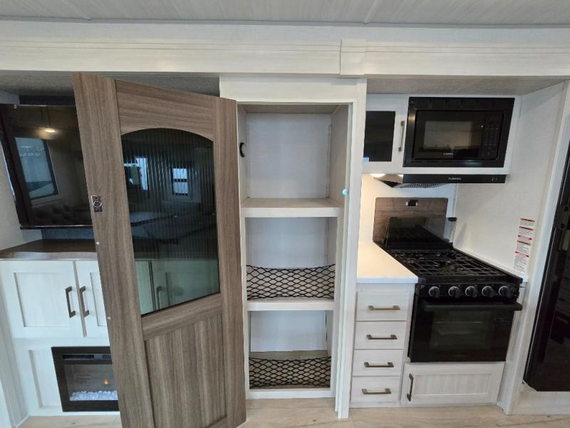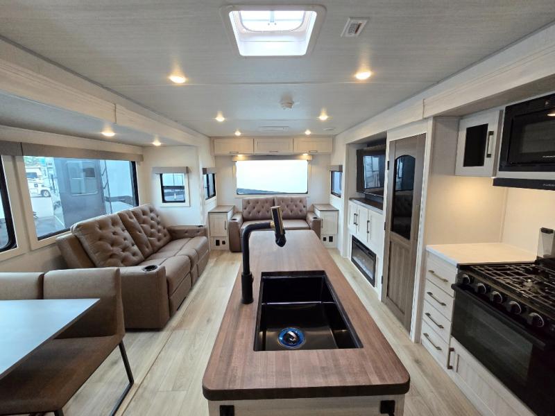 If luxury is what you're looking for, you won't have to search far with this travel trailer! There are triple slides, with dual opposing slides in the main living area for maximum space. The kitchen island gives a more residential feel to this space, plus there is a pantry, a hutch with shelves, a 10 cu. ft. 12V black glass refrigerator, and more kitchen features you are sure to love. The rear living area includes a tri-fold sofa to provide sleeping space for two overnight guests, and there is a theater seat across from the fireplace and HD TV. You'll also enjoy dining at the free-standing dinette with a multi-purpose ottoman! When it's time to call it a night, you can clean up in the spacious full bath, then head to the front master bedroom to retire. There is a custom king bed slide out here, along with a full-wall wardrobe in front, a dresser, a closet with washer and dryer prep, plus a bedroom fireplace!