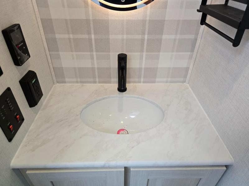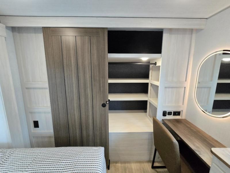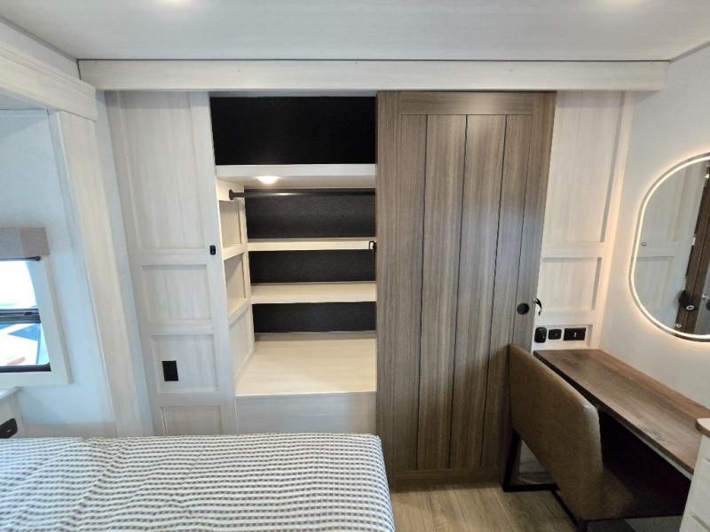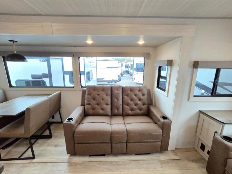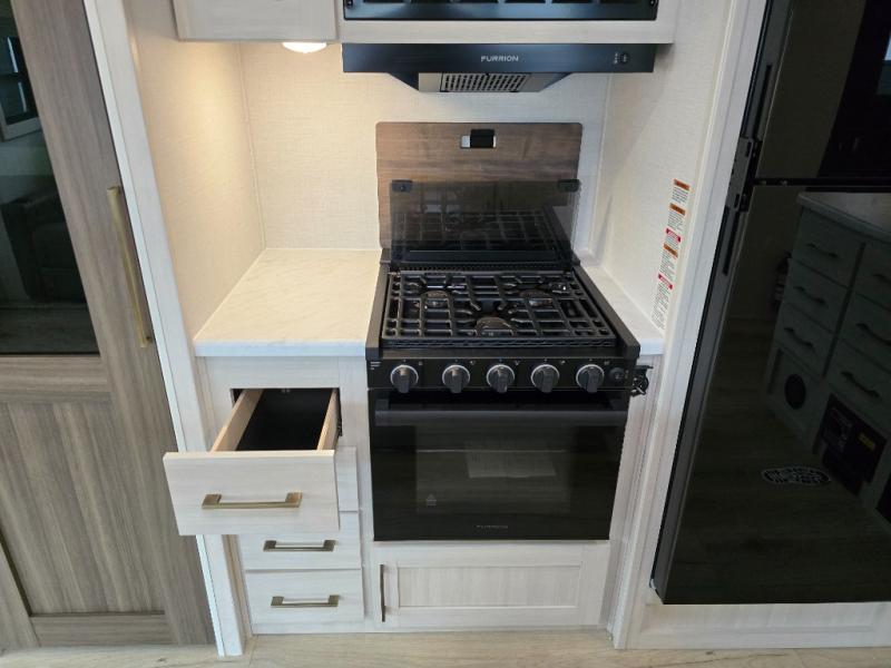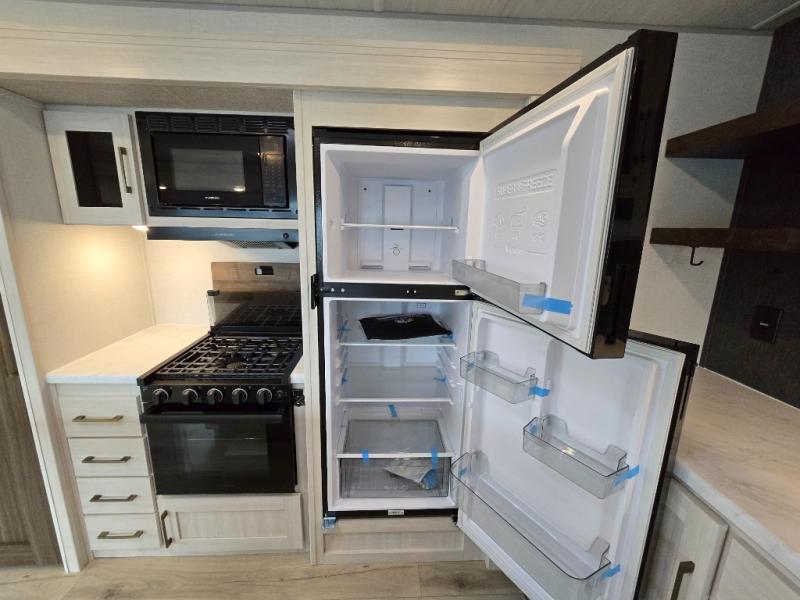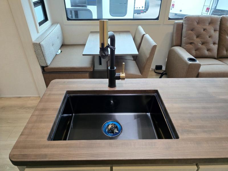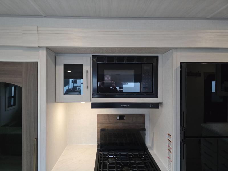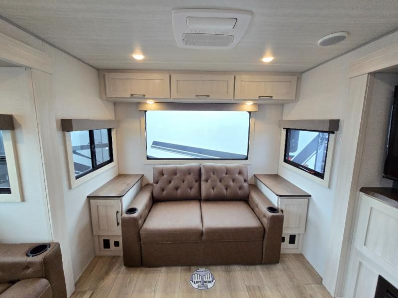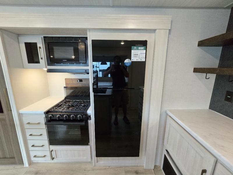 If luxury is what you're looking for, you won't have to search far with this travel trailer! There are triple slides, with dual opposing slides in the main living area for maximum space. The kitchen island gives a more residential feel to this space, plus there is a pantry, a hutch with shelves, a 10 cu. ft. 12V black glass refrigerator, and more kitchen features you are sure to love. The rear living area includes a tri-fold sofa to provide sleeping space for two overnight guests, and there is a theater seat across from the fireplace and HD TV. You'll also enjoy dining at the free-standing dinette with a multi-purpose ottoman! When it's time to call it a night, you can clean up in the spacious full bath, then head to the front master bedroom to retire. There is a custom king bed slide out here, along with a full-wall wardrobe in front, a dresser, a closet with washer and dryer prep, plus a bedroom fireplace!
