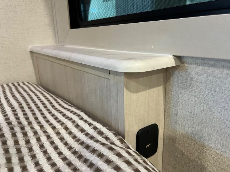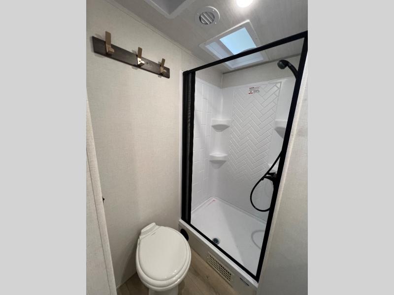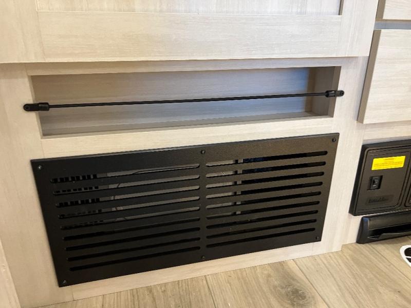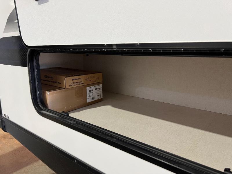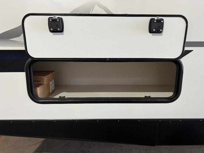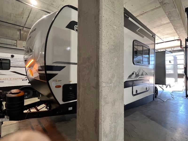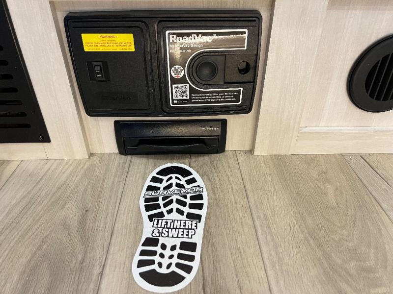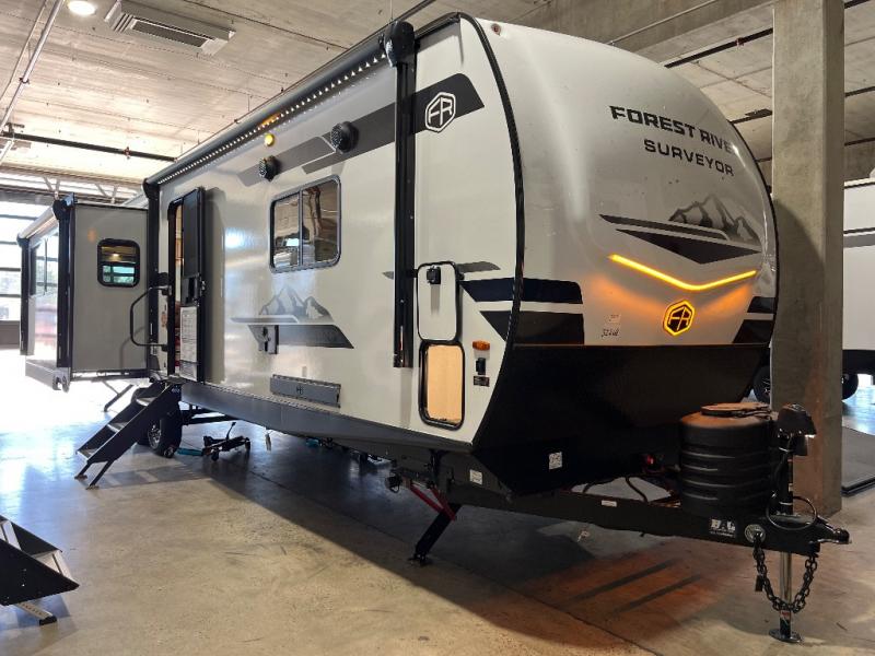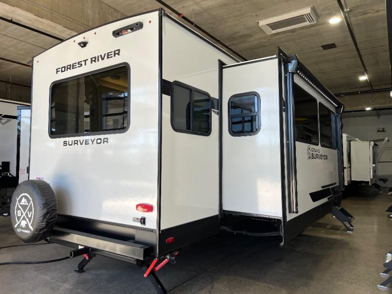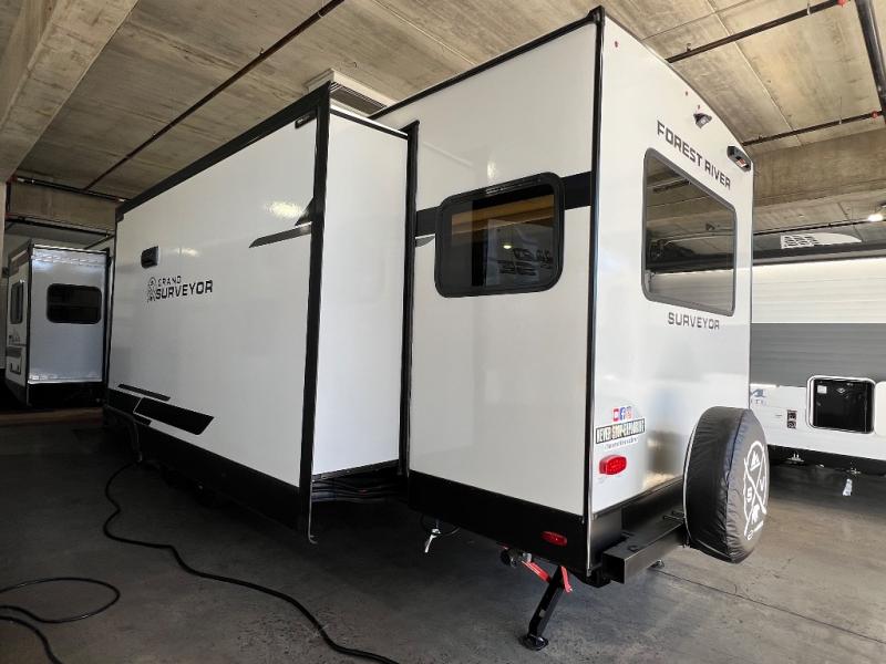 With any Grand Surveyor travel trailer by Forest River you will enjoy turn-key ready-to-go features and quality construction! Each model includes Azdel composite walls and a gel coated fiberglass front cap with an automotive style tinted windshield for a sleek look. There are friction hinge black glass entry door(s), an adjustable platform step with a night light, plus Goodyear tires and a power tongue jack for easy towing. The interior will have you feeling right at home with roller shades, residential faucets, sinks, and bathroom vanity, plus Surf(x) seamless countertops throughout. You can also plan for adventure with a 2" rear accessory and exterior spray port, and there are slam latch exterior baggage doors throughout to keep all your gear secure. Other stand-out features include a central vacuum system, a 200 watt solar panel with a 30 amp controller, a tankless water heater, carpet-free interiors, and the list goes on!