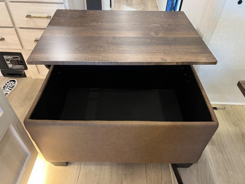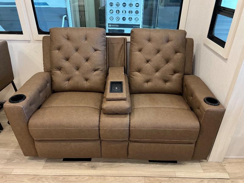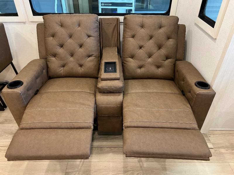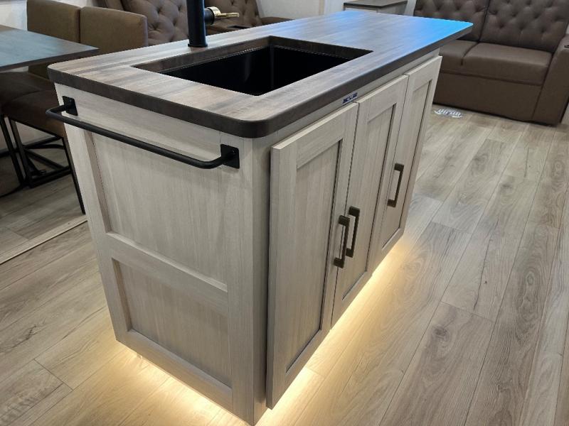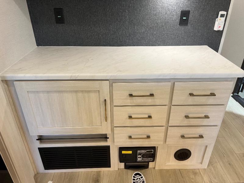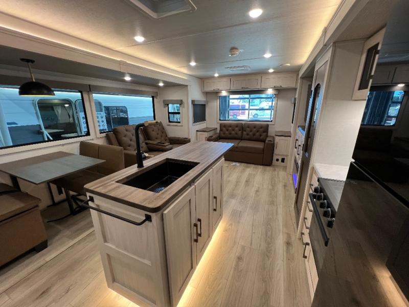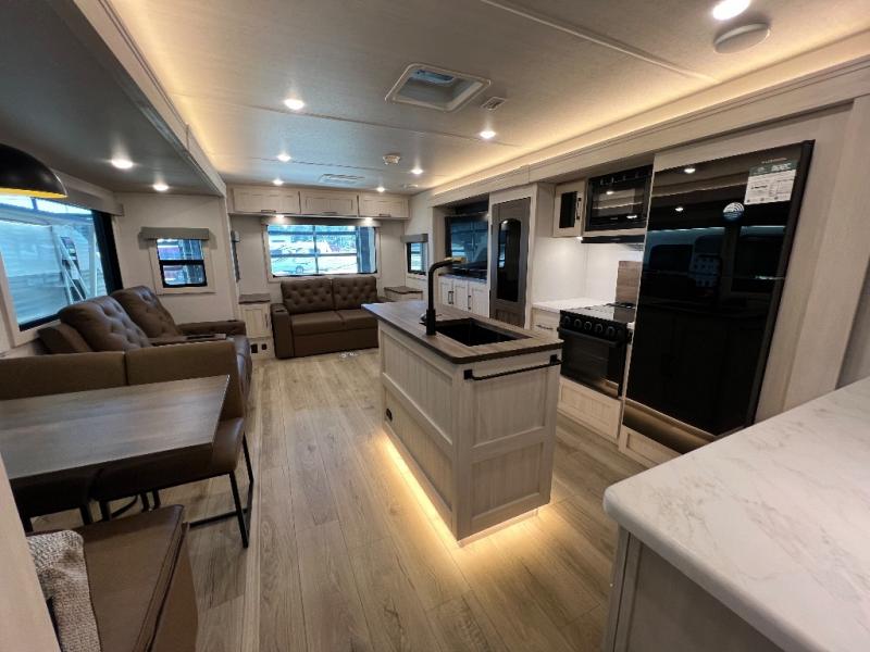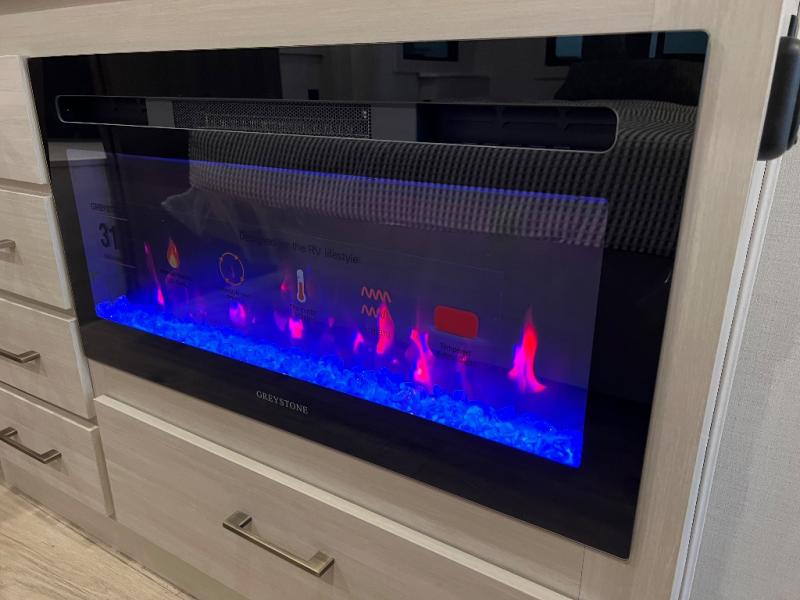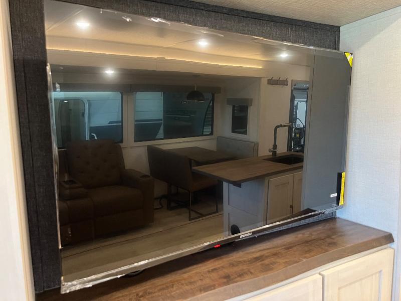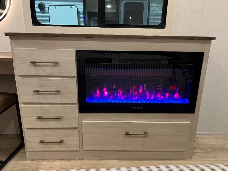 If luxury is what you're looking for, you won't have to search far with this travel trailer! There are triple slides, with dual opposing slides in the main living area for maximum space. The kitchen island gives a more residential feel to this space, plus there is a pantry, a hutch with shelves, a 10 cu. ft. 12V black glass refrigerator, and more kitchen features you are sure to love. The rear living area includes a tri-fold sofa to provide sleeping space for two overnight guests, and there is a theater seat across from the fireplace and HD TV. You'll also enjoy dining at the free-standing dinette with a multi-purpose ottoman! When it's time to call it a night, you can clean up in the spacious full bath, then head to the front master bedroom to retire. There is a custom king bed slide out here, along with a full-wall wardrobe in front, a dresser, a closet with washer and dryer prep, plus a bedroom fireplace!