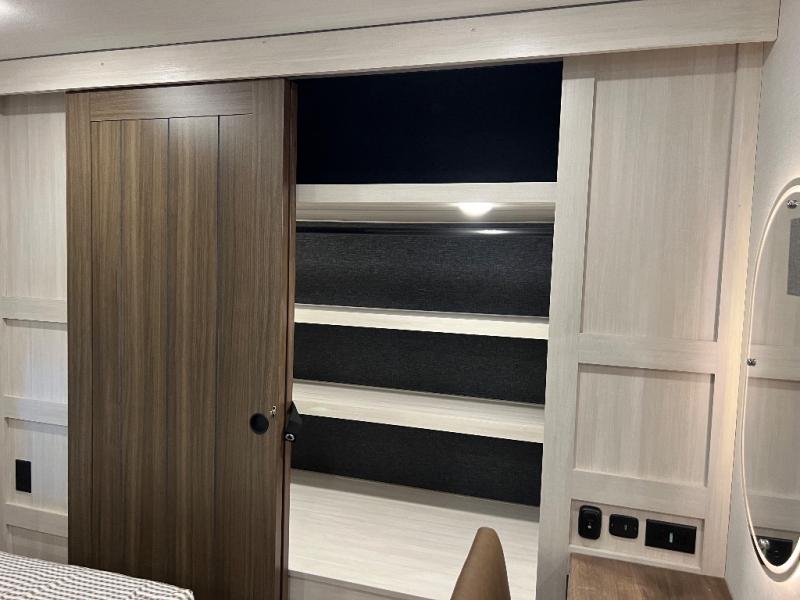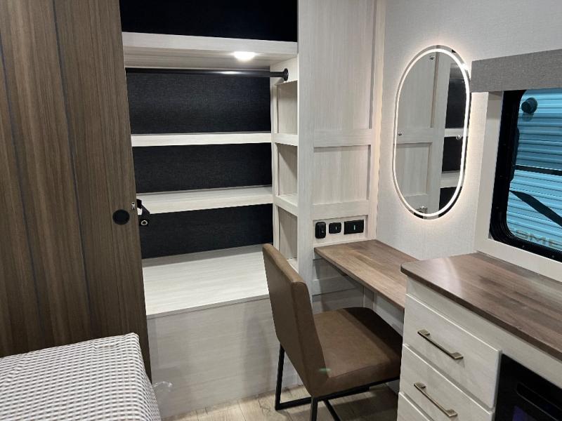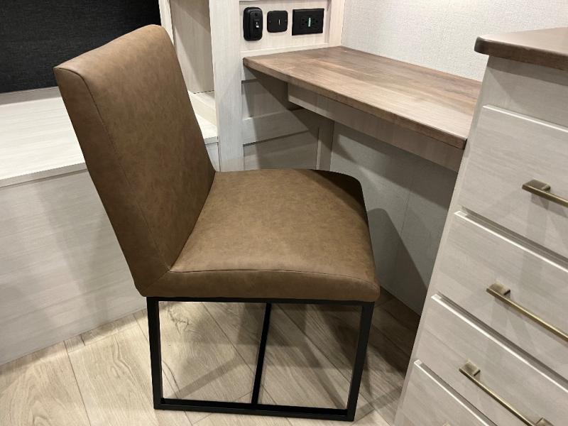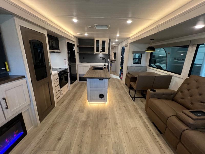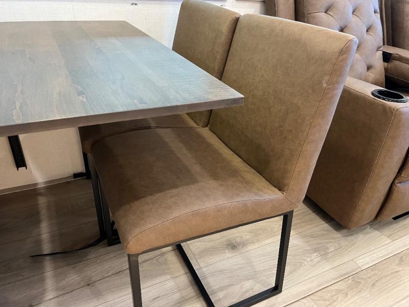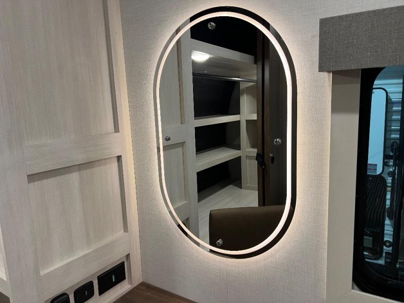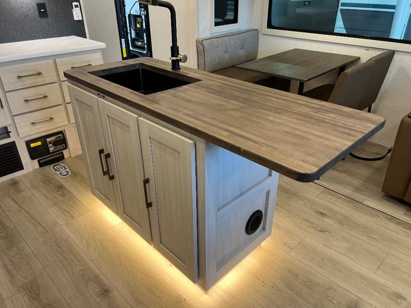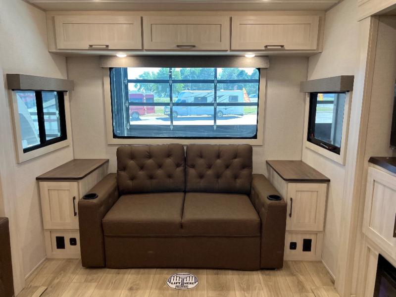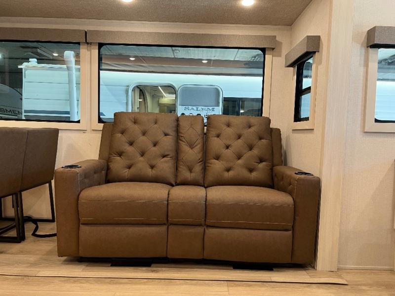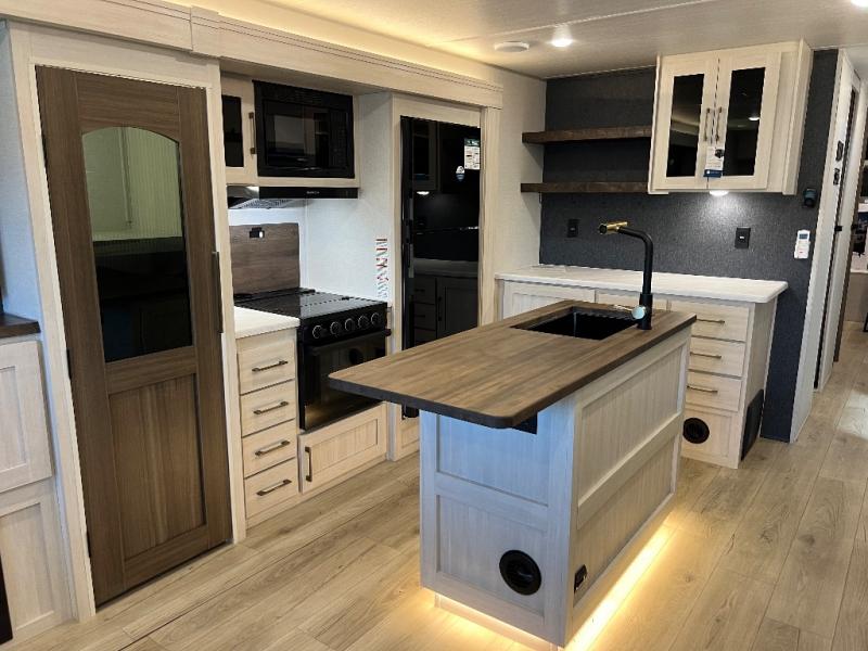 If luxury is what you're looking for, you won't have to search far with this travel trailer! There are triple slides, with dual opposing slides in the main living area for maximum space. The kitchen island gives a more residential feel to this space, plus there is a pantry, a hutch with shelves, a 10 cu. ft. 12V black glass refrigerator, and more kitchen features you are sure to love. The rear living area includes a tri-fold sofa to provide sleeping space for two overnight guests, and there is a theater seat across from the fireplace and HD TV. You'll also enjoy dining at the free-standing dinette with a multi-purpose ottoman! When it's time to call it a night, you can clean up in the spacious full bath, then head to the front master bedroom to retire. There is a custom king bed slide out here, along with a full-wall wardrobe in front, a dresser, a closet with washer and dryer prep, plus a bedroom fireplace!