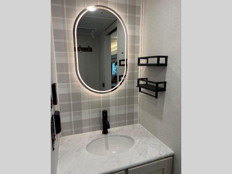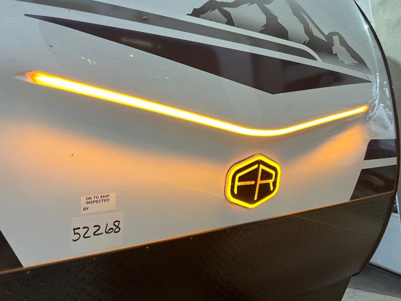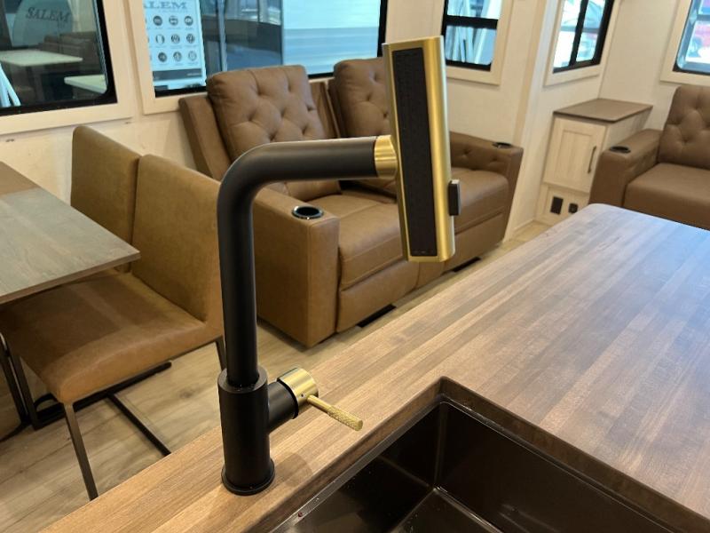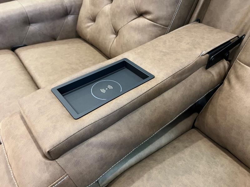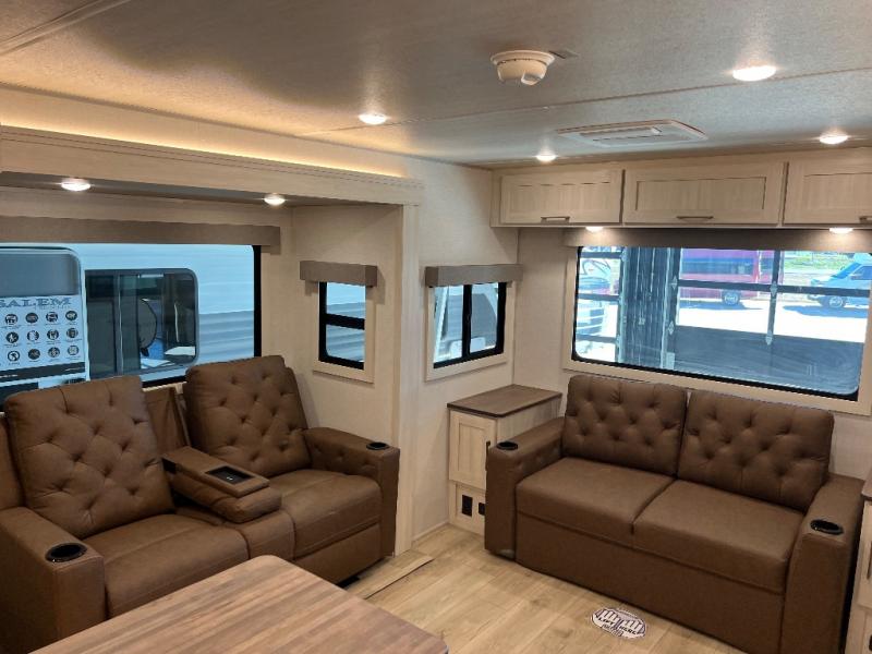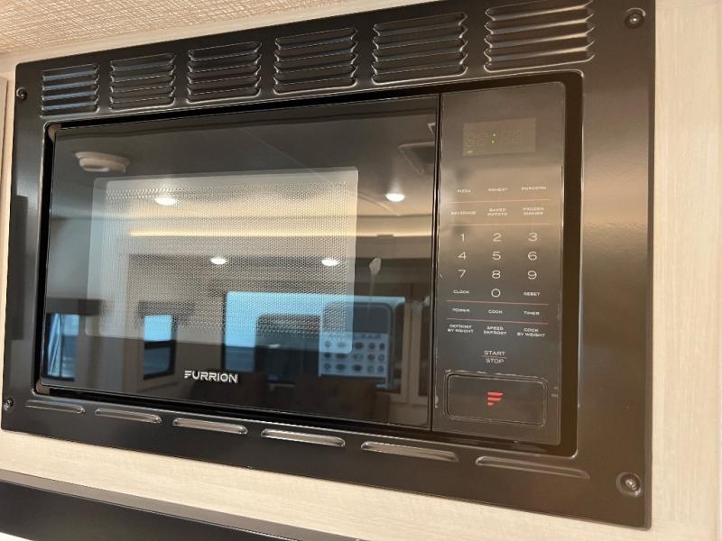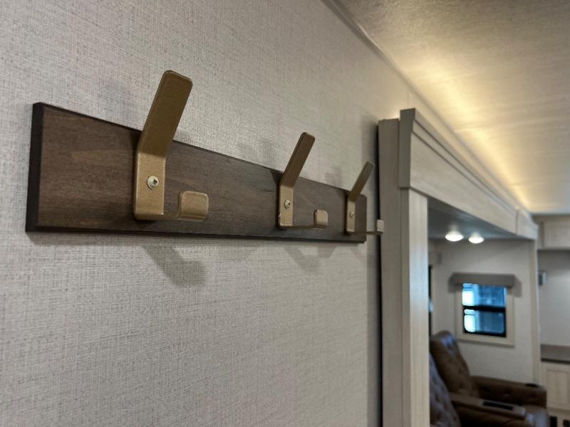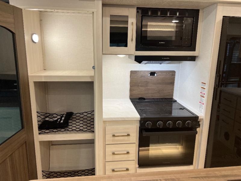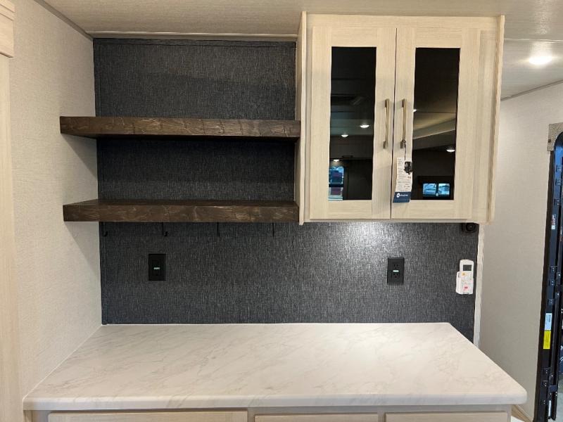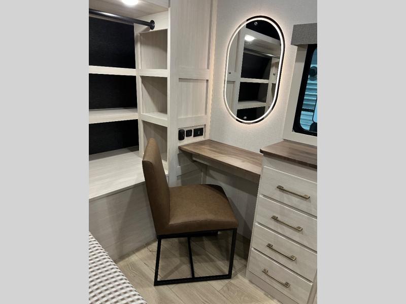 If luxury is what you're looking for, you won't have to search far with this travel trailer! There are triple slides, with dual opposing slides in the main living area for maximum space. The kitchen island gives a more residential feel to this space, plus there is a pantry, a hutch with shelves, a 10 cu. ft. 12V black glass refrigerator, and more kitchen features you are sure to love. The rear living area includes a tri-fold sofa to provide sleeping space for two overnight guests, and there is a theater seat across from the fireplace and HD TV. You'll also enjoy dining at the free-standing dinette with a multi-purpose ottoman! When it's time to call it a night, you can clean up in the spacious full bath, then head to the front master bedroom to retire. There is a custom king bed slide out here, along with a full-wall wardrobe in front, a dresser, a closet with washer and dryer prep, plus a bedroom fireplace!
