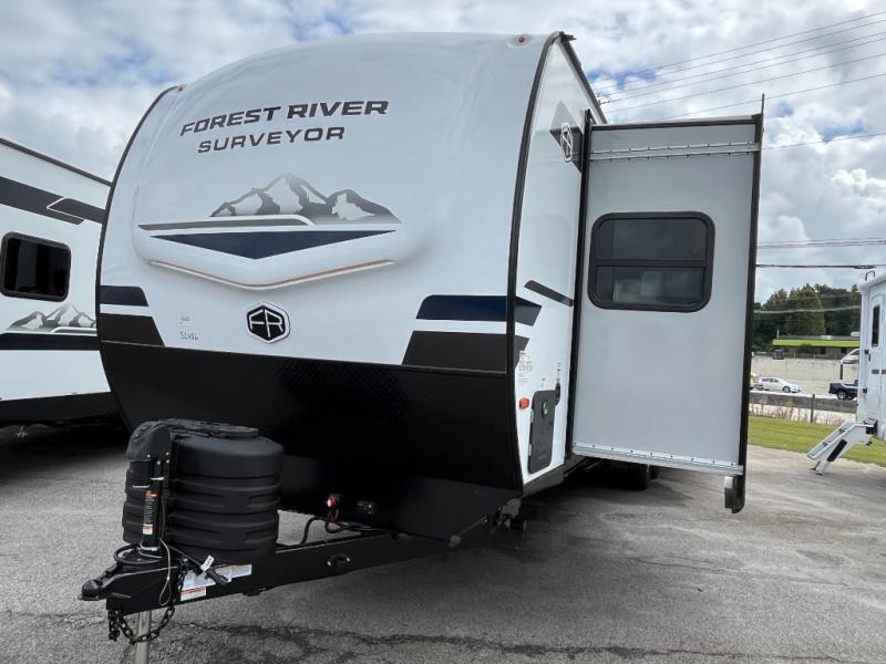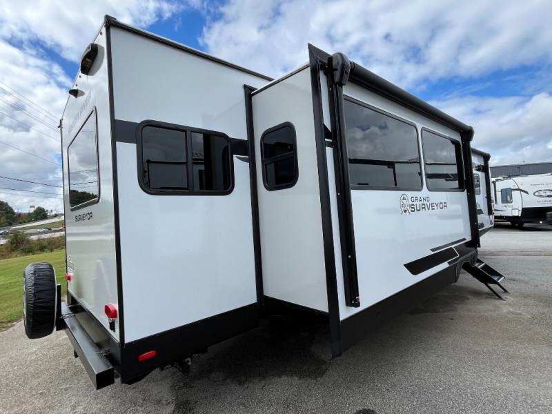 With any Grand Surveyor travel trailer by Forest River you will enjoy turn-key ready-to-go features and quality construction! Each model includes Azdel composite walls and a gel coated fiberglass front cap with an automotive style tinted windshield for a sleek look. There are friction hinge black glass entry door(s), an adjustable platform step with a night light, plus Goodyear tires and a power tongue jack for easy towing. The interior will have you feeling right at home with roller shades, residential faucets, sinks, and bathroom vanity, plus Surf(x) seamless countertops throughout. You can also plan for adventure with a 2" rear accessory and exterior spray port, and there are slam latch exterior baggage doors throughout to keep all your gear secure. Other stand-out features include a central vacuum system, a 200 watt solar panel with a 30 amp controller, a tankless water heater, carpet-free interiors, and the list goes on!
