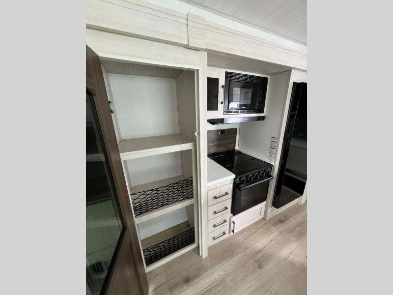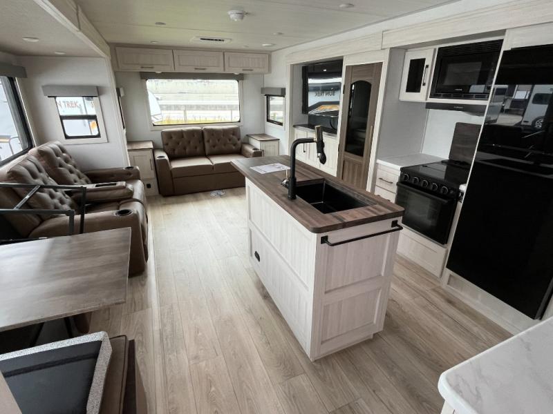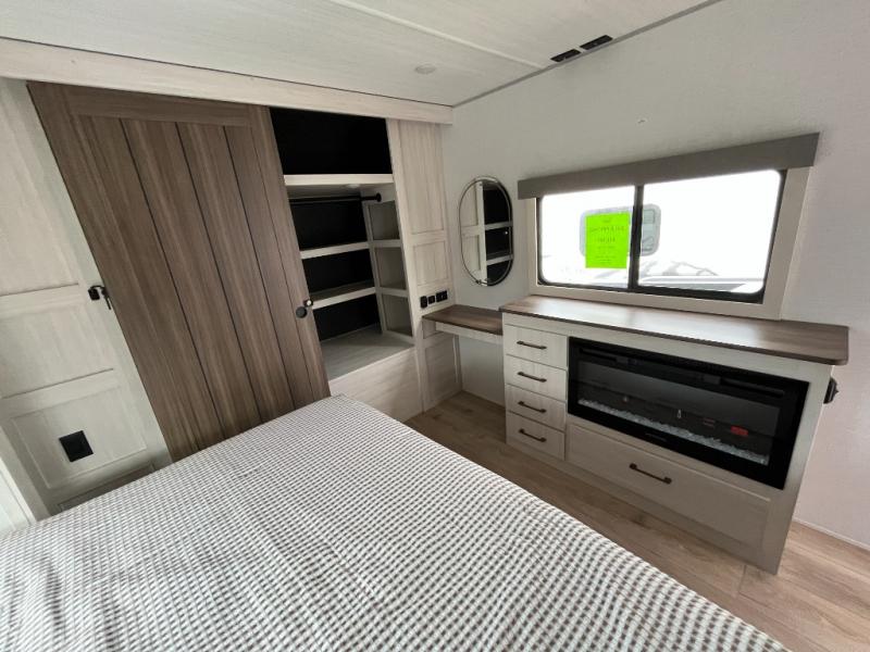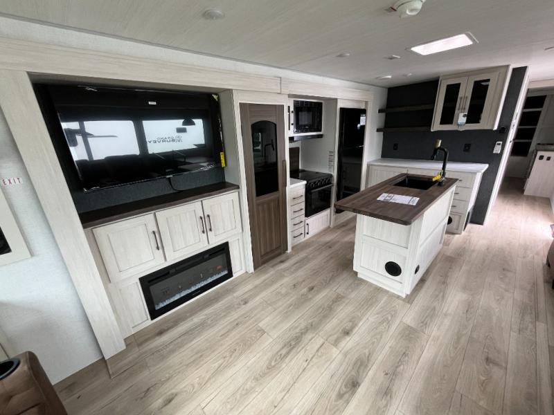 If luxury is what you're looking for, you won't have to search far with this travel trailer! There are triple slides, with dual opposing slides in the main living area for maximum space. The kitchen island gives a more residential feel to this space, plus there is a pantry, a hutch with shelves, a 10 cu. ft. 12V black glass refrigerator, and more kitchen features you are sure to love. The rear living area includes a tri-fold sofa to provide sleeping space for two overnight guests, and there is a theater seat across from the fireplace and HD TV. You'll also enjoy dining at the free-standing dinette with a multi-purpose ottoman! When it's time to call it a night, you can clean up in the spacious full bath, then head to the front master bedroom to retire. There is a custom king bed slide out here, along with a full-wall wardrobe in front, a dresser, a closet with washer and dryer prep, plus a bedroom fireplace!