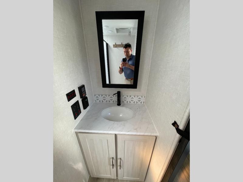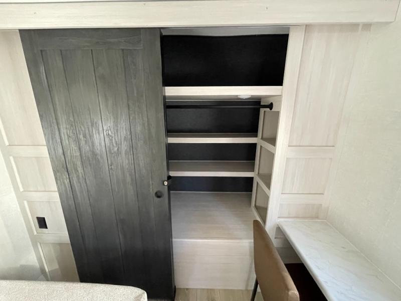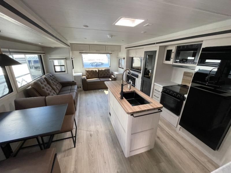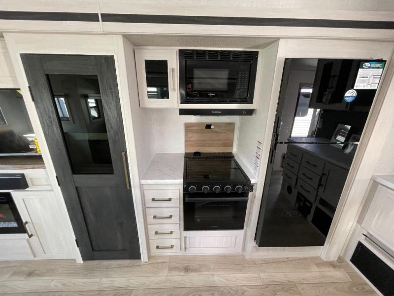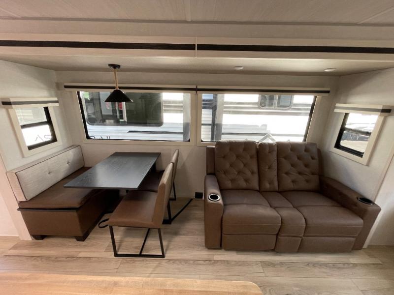 If luxury is what you're looking for, you won't have to search far with this travel trailer! There are triple slides, with dual opposing slides in the main living area for maximum space. The kitchen island gives a more residential feel to this space, plus there is a pantry, a hutch with shelves, a 10 cu. ft. 12V black glass refrigerator, and more kitchen features you are sure to love. The rear living area includes a EZ-out sofa to provide sleeping space for two overnight guests, and there is a theater seat across from the fireplace and HD TV. You'll also enjoy dining at the free-standing dinette with a multi-purpose ottoman! When it's time to call it a night, you can clean up in the spacious full bath, then head to the front master bedroom to retire. There is a custom king bed slide out here, along with a full-wall wardrobe in front, a dresser, a closet with washer and dryer prep, plus a bedroom fireplace!