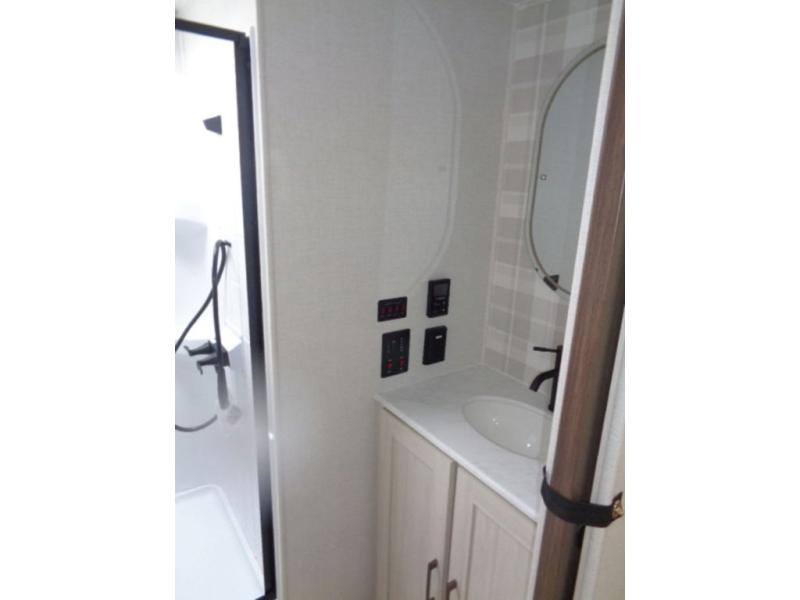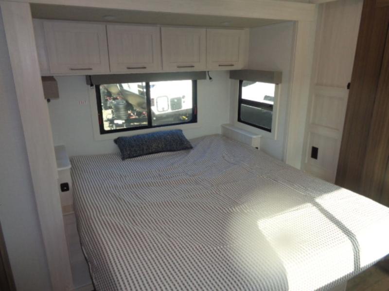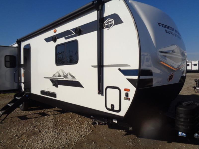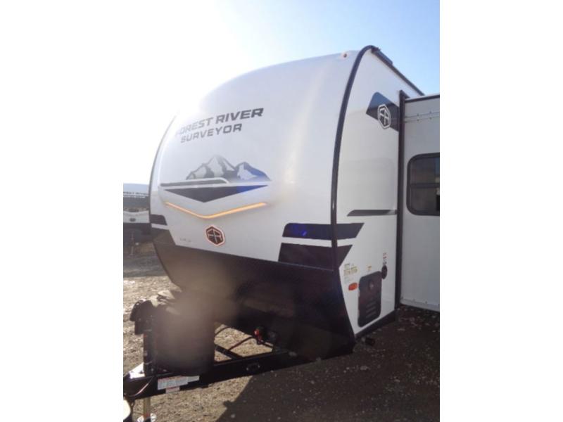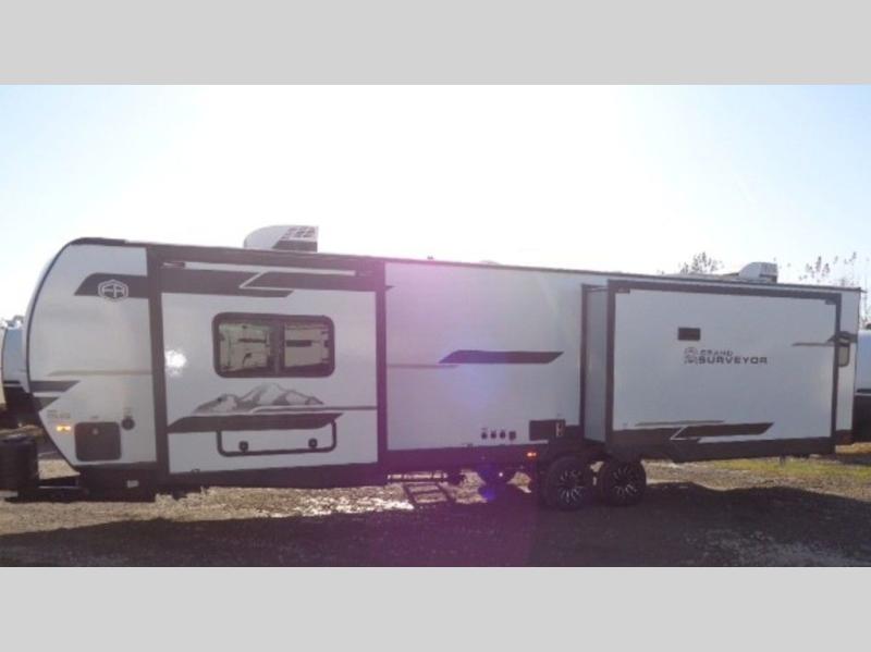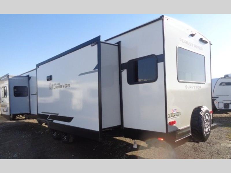 With any Grand Surveyor travel trailer by Forest River you will enjoy turn-key ready-to-go features and quality construction! Each model includes Azdel composite walls and a gel coated fiberglass front cap with an automotive style tinted windshield for a sleek look. There are friction hinge black glass entry door(s), an adjustable platform step with a night light, plus Goodyear tires and a power tongue jack for easy towing. The interior will have you feeling right at home with roller shades, residential faucets, sinks, and bathroom vanity, plus Surf(x) seamless countertops throughout. You can also plan for adventure with a 2" rear accessory and exterior spray port, and there are slam latch exterior baggage doors throughout to keep all your gear secure. Other stand-out features include a central vacuum system, a 200 watt solar panel with a 30 amp controller, a tankless water heater, carpet-free interiors, and the list goes on!