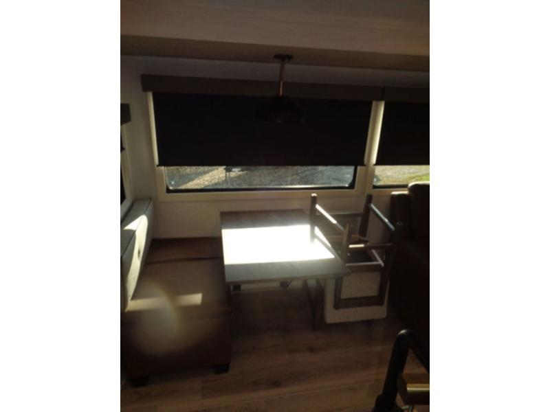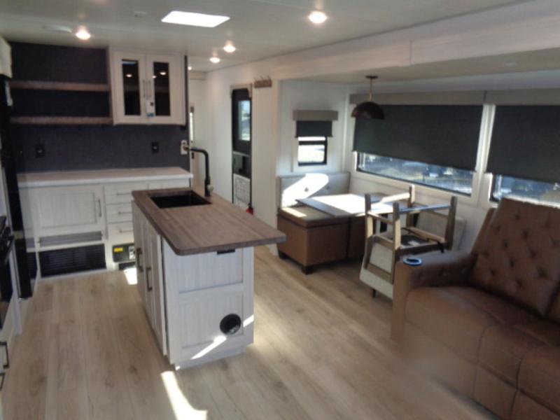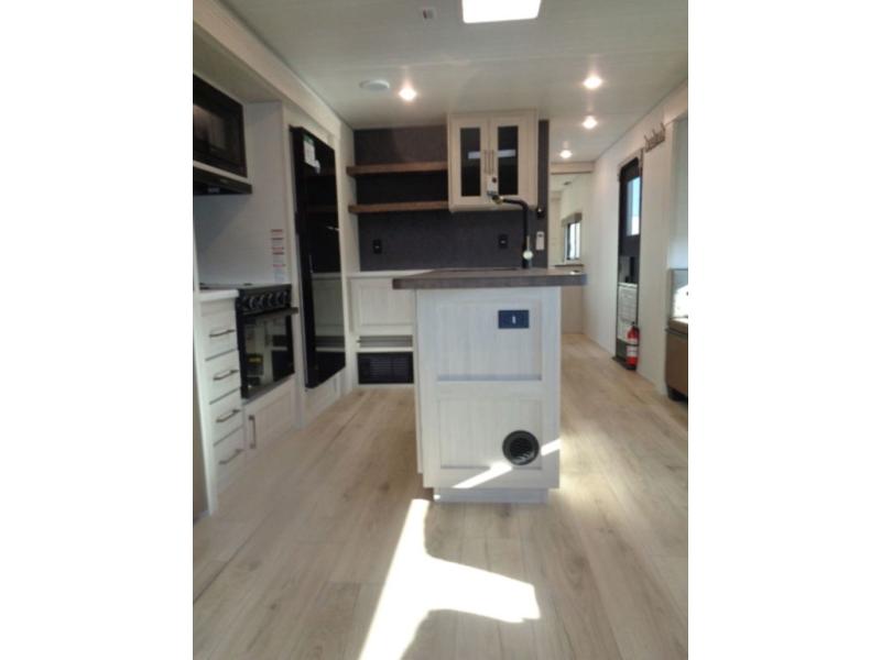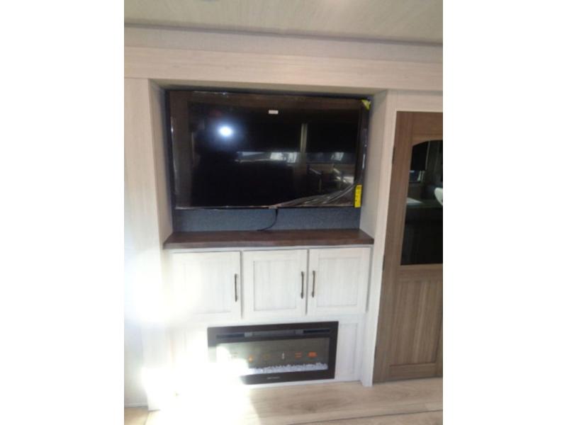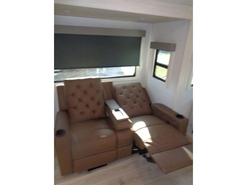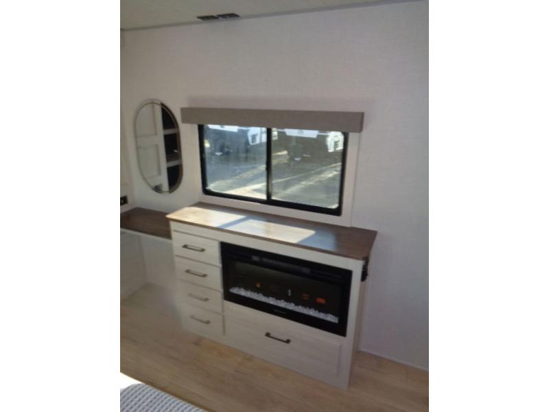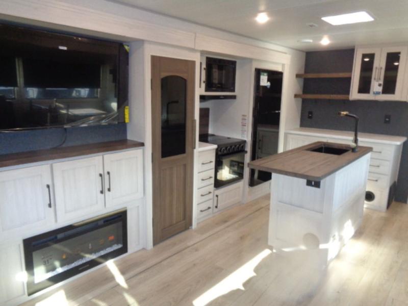 If luxury is what you're looking for, you won't have to search far with this travel trailer! There are triple slides, with dual opposing slides in the main living area for maximum space. The kitchen island gives a more residential feel to this space, plus there is a pantry, a hutch with shelves, a 10 cu. ft. 12V black glass refrigerator, and more kitchen features you are sure to love. The rear living area includes a EZ-out sofa to provide sleeping space for two overnight guests, and there is a theater seat across from the fireplace and HD TV. You'll also enjoy dining at the free-standing dinette with a multi-purpose ottoman! When it's time to call it a night, you can clean up in the spacious full bath, then head to the front master bedroom to retire. There is a custom king bed slide out here, along with a full-wall wardrobe in front, a dresser, a closet with washer and dryer prep, plus a bedroom fireplace!