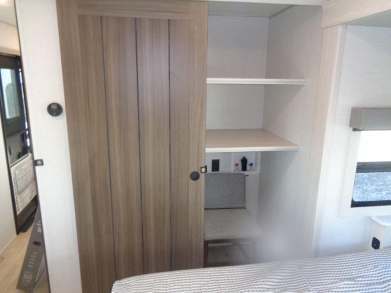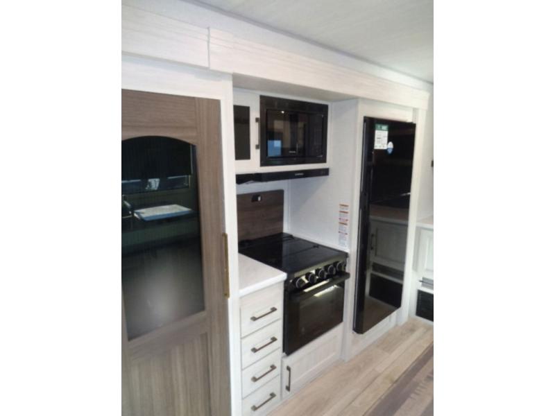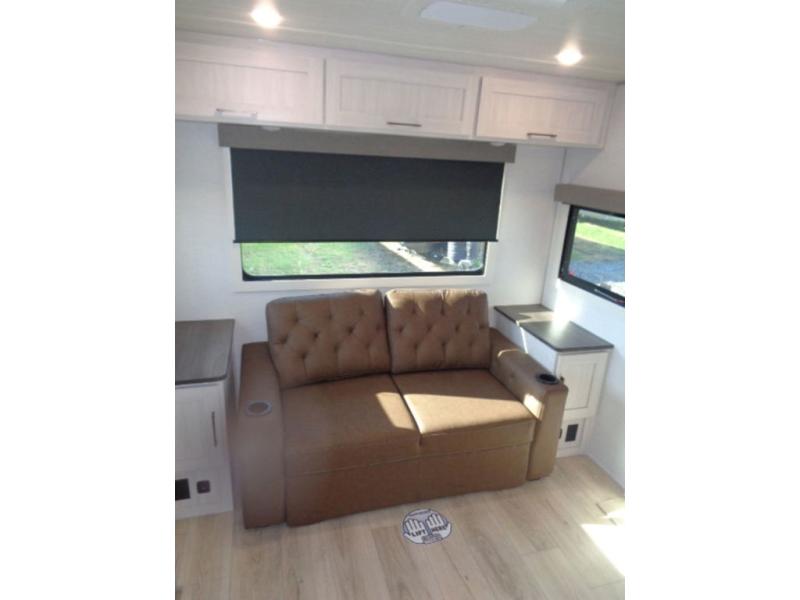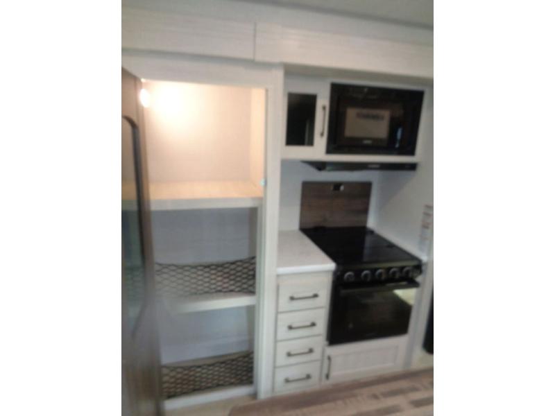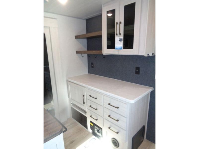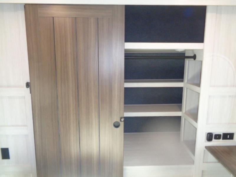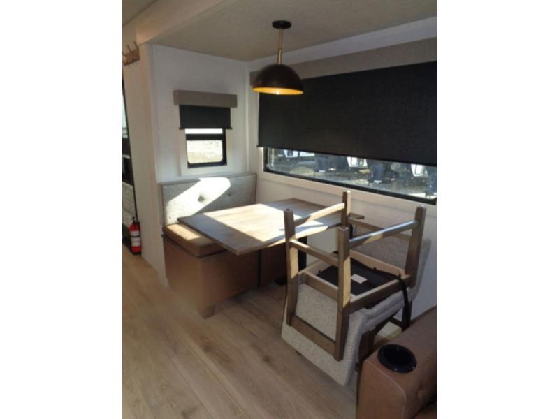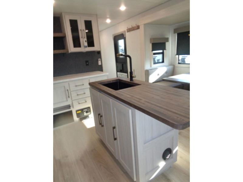 If luxury is what you're looking for, you won't have to search far with this travel trailer! There are triple slides, with dual opposing slides in the main living area for maximum space. The kitchen island gives a more residential feel to this space, plus there is a pantry, a hutch with shelves, a 10 cu. ft. 12V black glass refrigerator, and more kitchen features you are sure to love. The rear living area includes a EZ-out sofa to provide sleeping space for two overnight guests, and there is a theater seat across from the fireplace and HD TV. You'll also enjoy dining at the free-standing dinette with a multi-purpose ottoman! When it's time to call it a night, you can clean up in the spacious full bath, then head to the front master bedroom to retire. There is a custom king bed slide out here, along with a full-wall wardrobe in front, a dresser, a closet with washer and dryer prep, plus a bedroom fireplace!