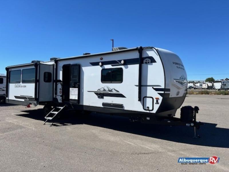 With any Grand Surveyor travel trailer by Forest River you will enjoy turn-key ready-to-go features and quality construction! Each model includes Azdel composite walls and a gel coated fiberglass front cap with an automotive style tinted windshield for a sleek look. There are friction hinge black glass entry door(s), an adjustable platform step with a night light, plus Goodyear tires and a power tongue jack for easy towing. The interior will have you feeling right at home with roller shades, residential faucets, sinks, and bathroom vanity, plus Surf(x) seamless countertops throughout. You can also plan for adventure with a 2" rear accessory and exterior spray port, and there are slam latch exterior baggage doors throughout to keep all your gear secure. Other stand-out features include a central vacuum system, a 200 watt solar panel with a 30 amp controller, a tankless water heater, carpet-free interiors, and the list goes on!