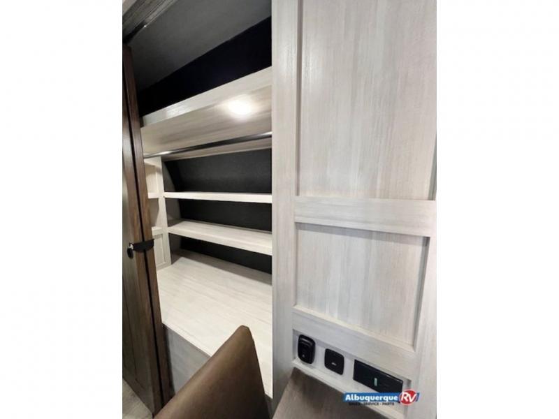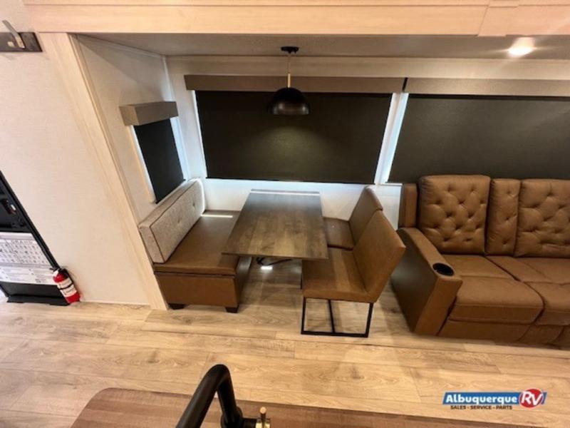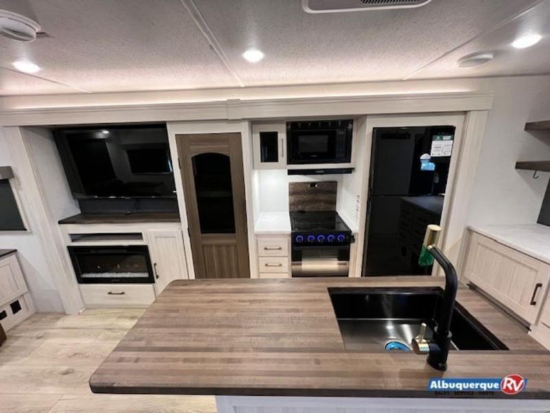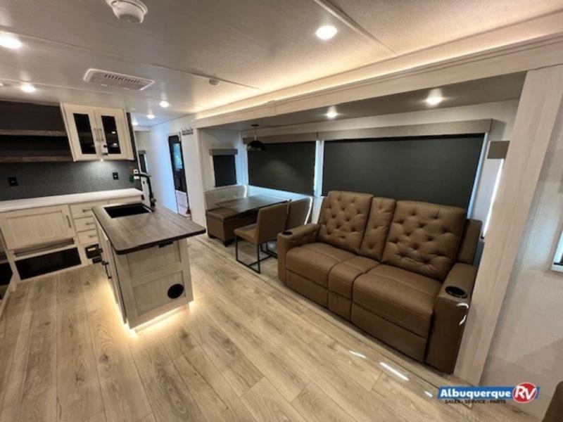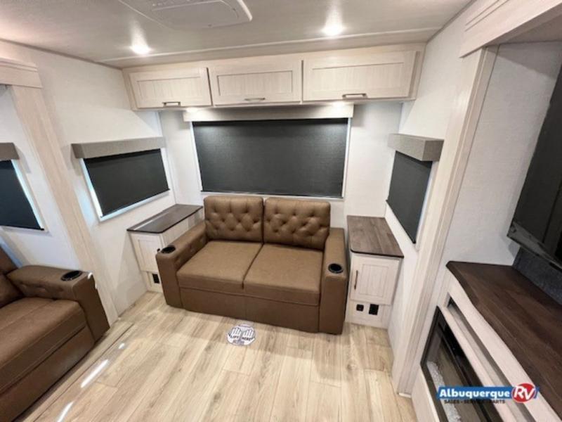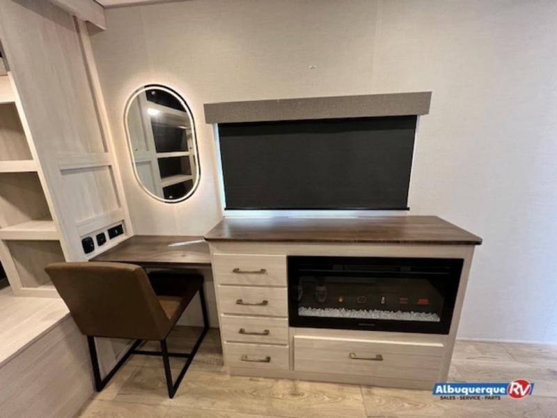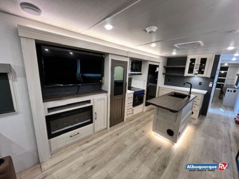 If luxury is what you're looking for, you won't have to search far with this travel trailer! There are triple slides, with dual opposing slides in the main living area for maximum space. The kitchen island gives a more residential feel to this space, plus there is a pantry, a hutch with shelves, a 10 cu. ft. 12V black glass refrigerator, and more kitchen features you are sure to love. The rear living area includes a EZ-out sofa to provide sleeping space for two overnight guests, and there is a theater seat across from the fireplace and HD TV. You'll also enjoy dining at the free-standing dinette with a multi-purpose ottoman! When it's time to call it a night, you can clean up in the spacious full bath, then head to the front master bedroom to retire. There is a custom king bed slide out here, along with a full-wall wardrobe in front, a dresser, a closet with washer and dryer prep, plus a bedroom fireplace!