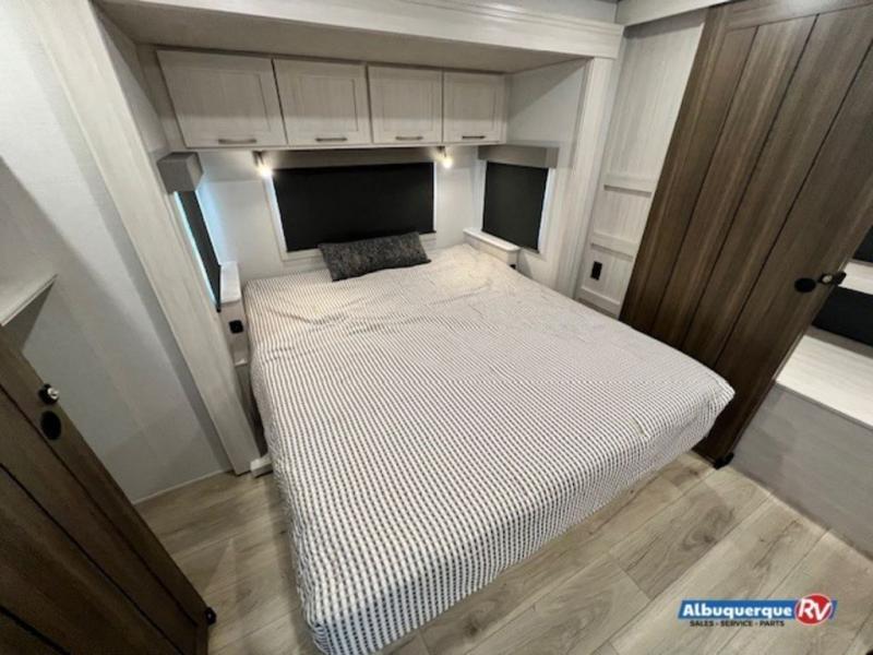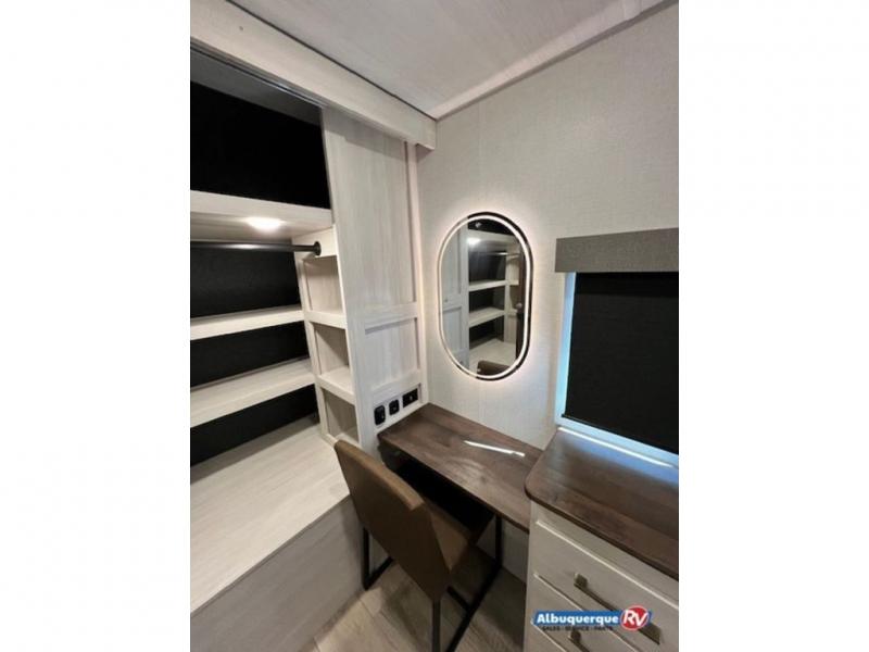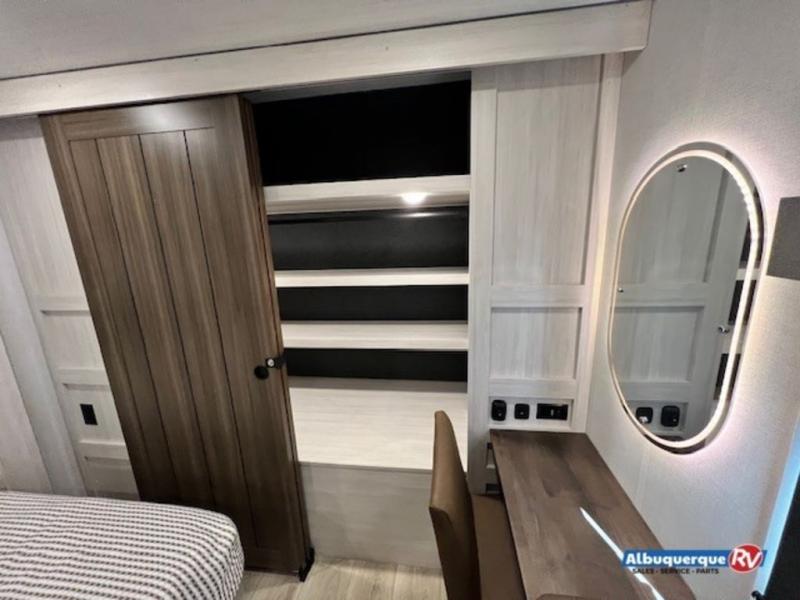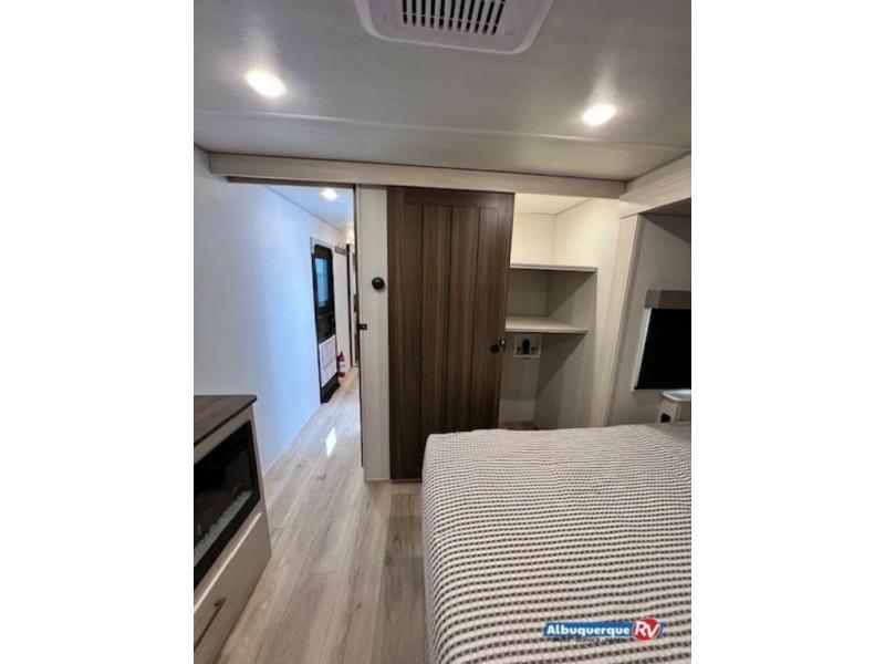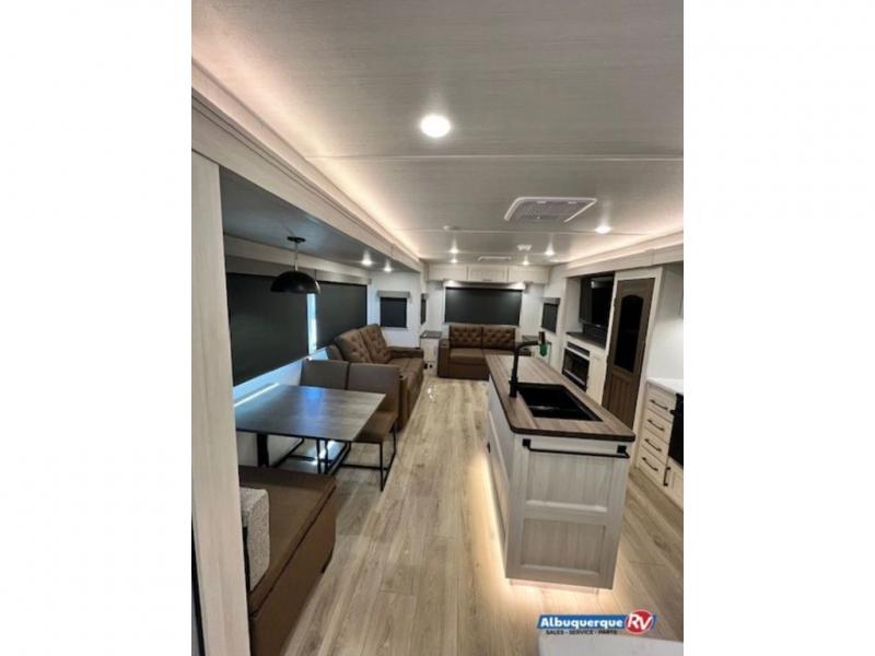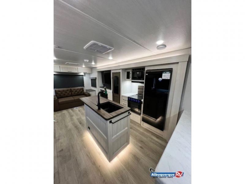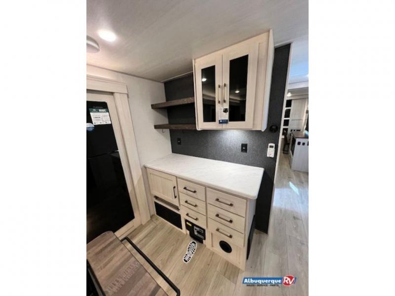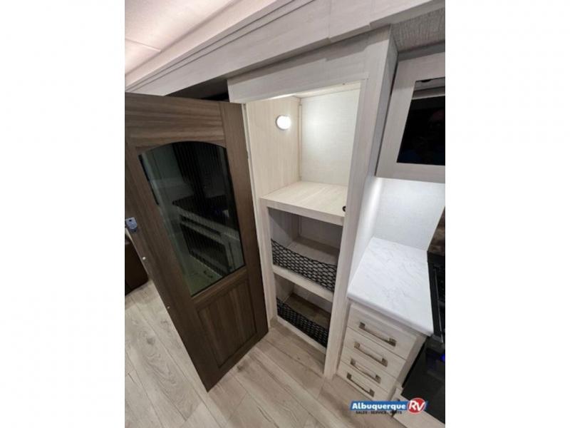 If luxury is what you're looking for, you won't have to search far with this travel trailer! There are triple slides, with dual opposing slides in the main living area for maximum space. The kitchen island gives a more residential feel to this space, plus there is a pantry, a hutch with shelves, a 10 cu. ft. 12V black glass refrigerator, and more kitchen features you are sure to love. The rear living area includes a EZ-out sofa to provide sleeping space for two overnight guests, and there is a theater seat across from the fireplace and HD TV. You'll also enjoy dining at the free-standing dinette with a multi-purpose ottoman! When it's time to call it a night, you can clean up in the spacious full bath, then head to the front master bedroom to retire. There is a custom king bed slide out here, along with a full-wall wardrobe in front, a dresser, a closet with washer and dryer prep, plus a bedroom fireplace!