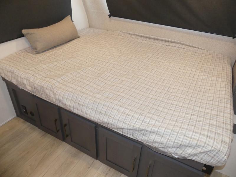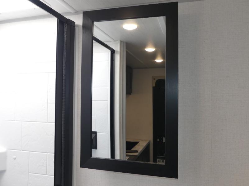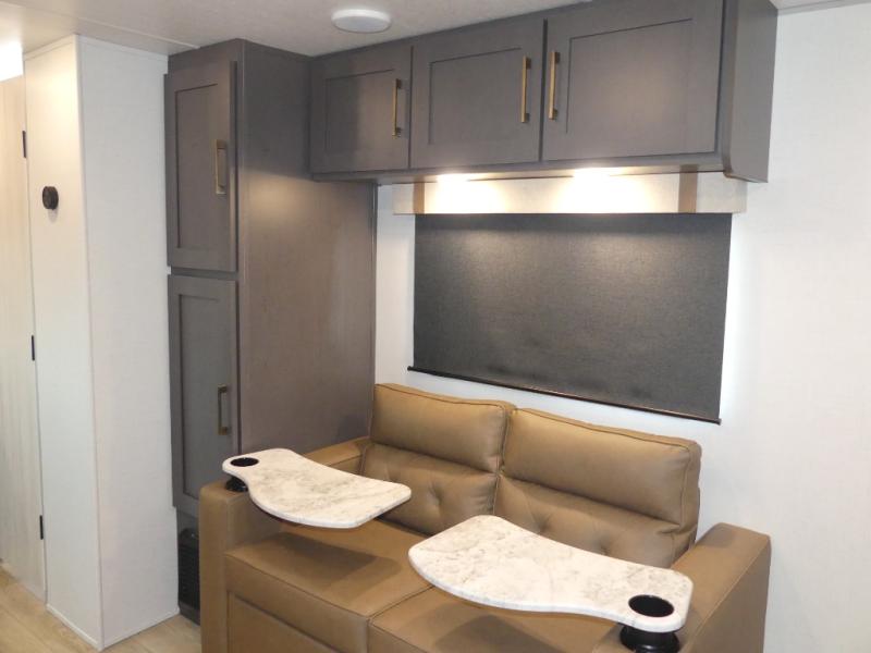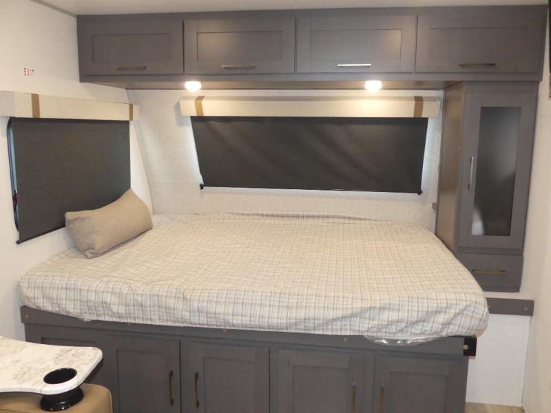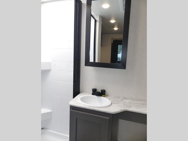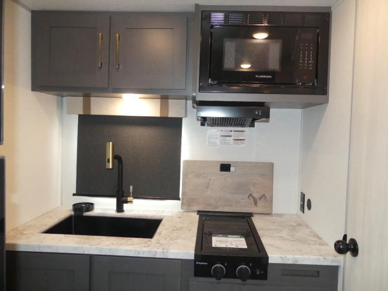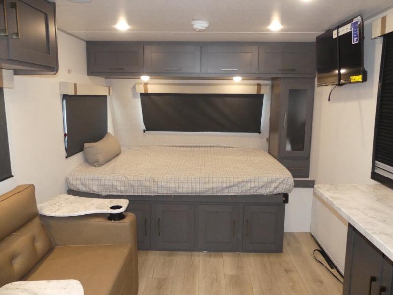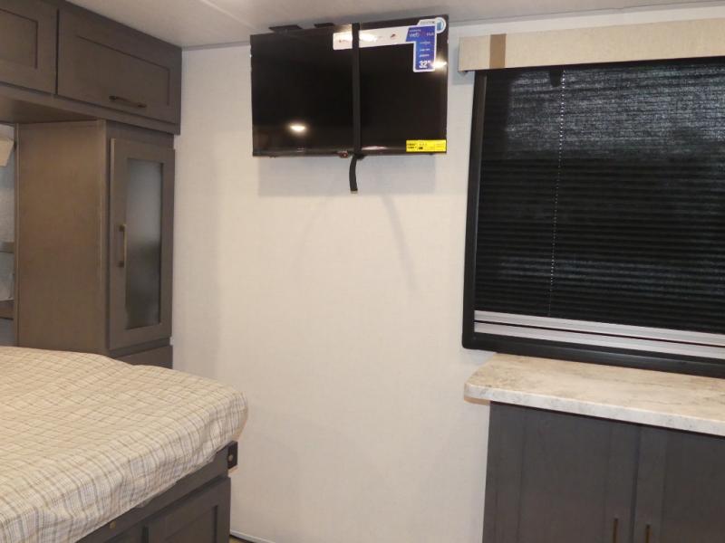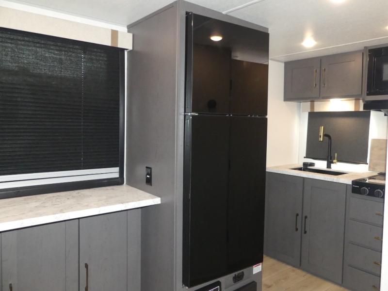 Grab your hiking gear and hit the road in this no-slide travel trailer! The front queen bed will provide a comfortable place to rest your head each night, and the rear corner full bath will let you freshen up without having to use the camp's facilities. The full kitchen includes an all-in-one microwave and air fryer plus a refrigerator to keep food stocked. You'll find comfortable seating space on the jackknife sofa, and you can enjoy your morning coffee at the counter with two stools and a flip-up window! This unit also includes an outside kitchen with a grill to keep the fish fry odors outside!
