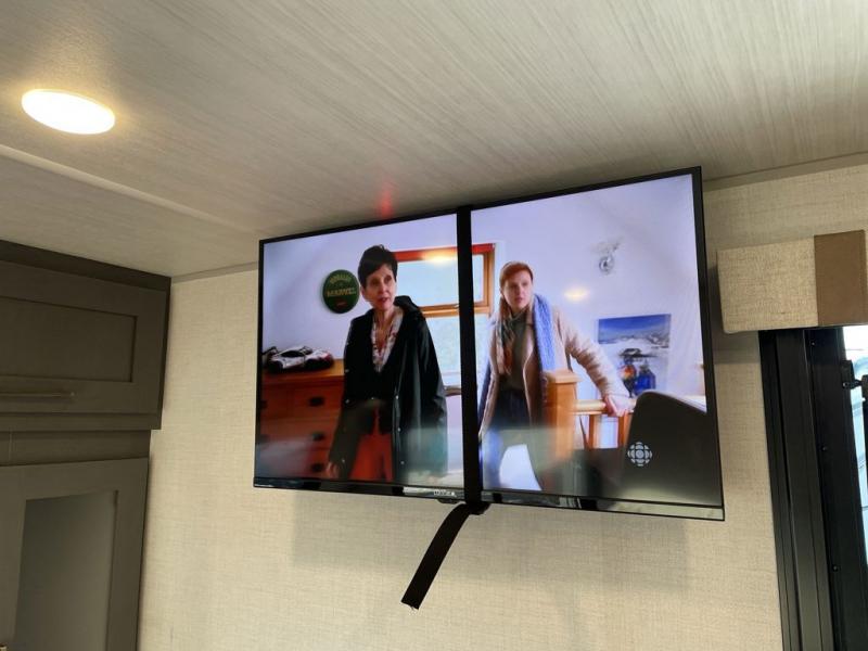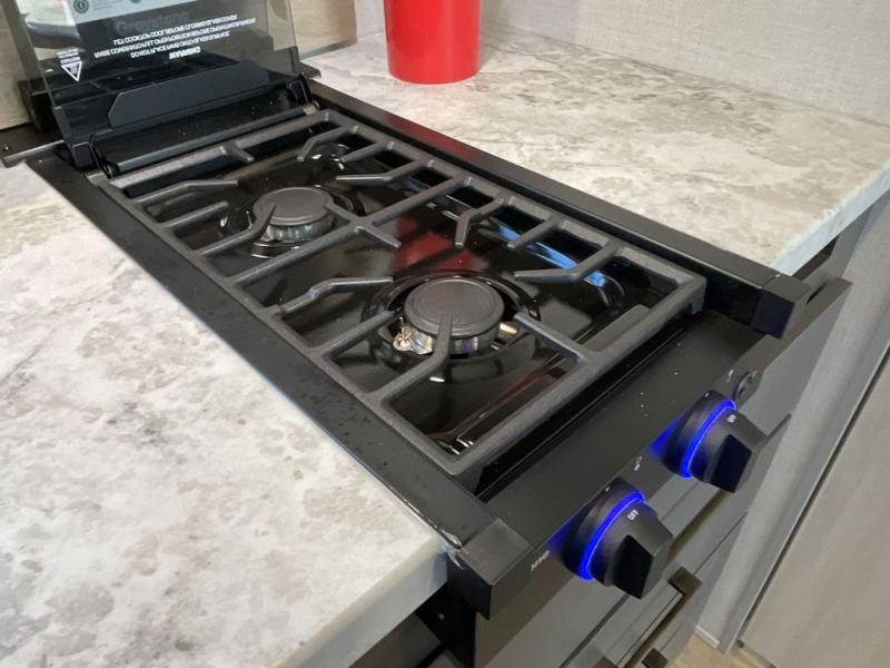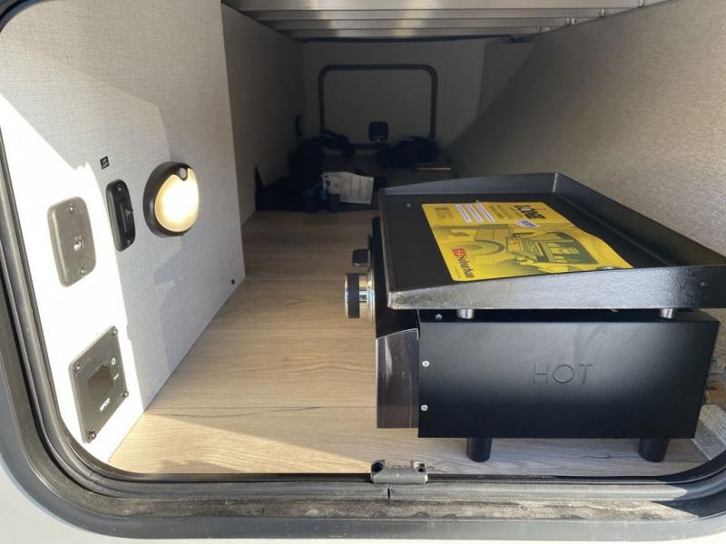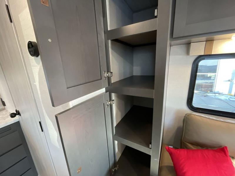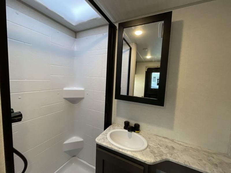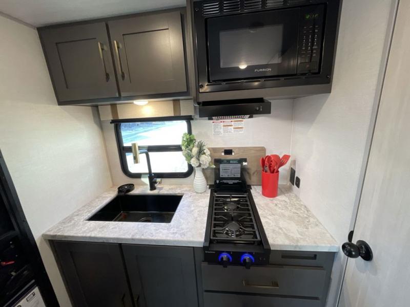 Grab your hiking gear and hit the road in this no-slide travel trailer! The front queen bed will provide a comfortable place to rest your head each night, and the rear corner full bath will let you freshen up without having to use the camp's facilities. The full kitchen includes an all-in-one microwave and air fryer plus a refrigerator to keep food stocked. You'll find comfortable seating space on the jackknife sofa, and you can enjoy your morning coffee at the counter with two stools and a flip-up window! This unit also includes an outside kitchen with a grill to keep the fish fry odors outside!