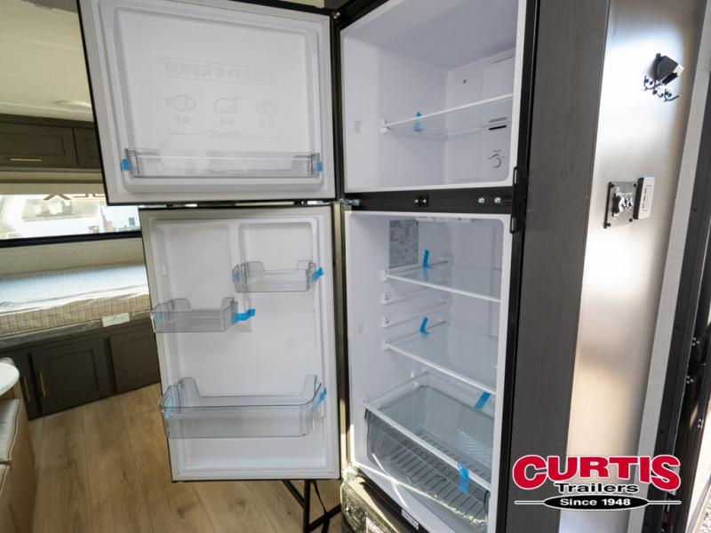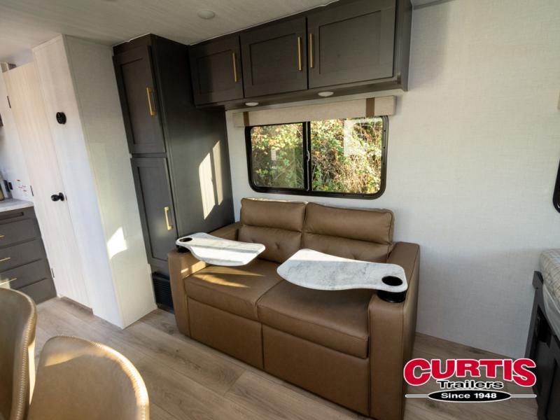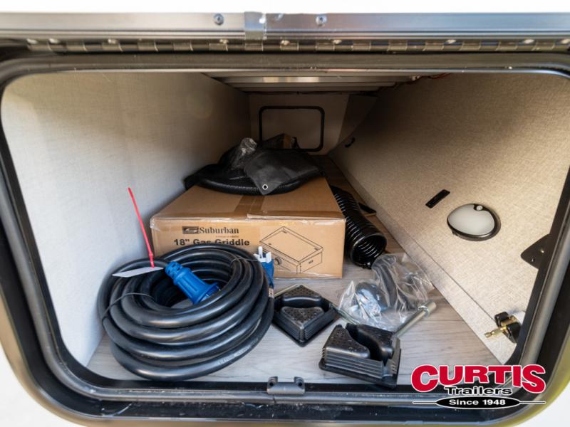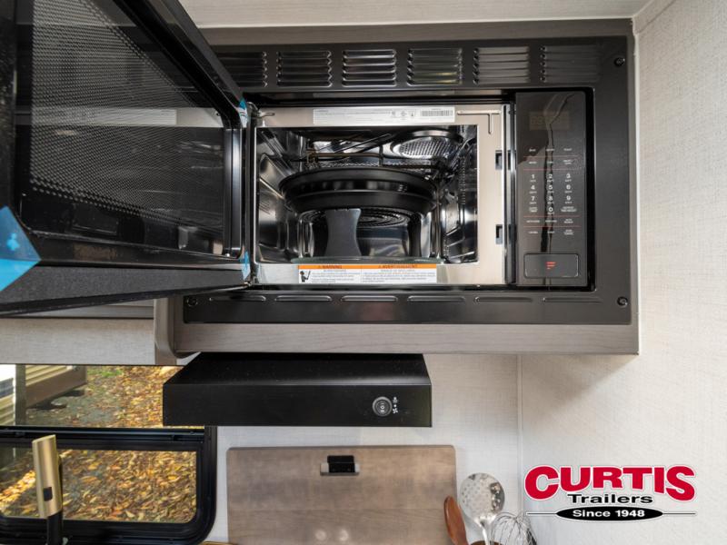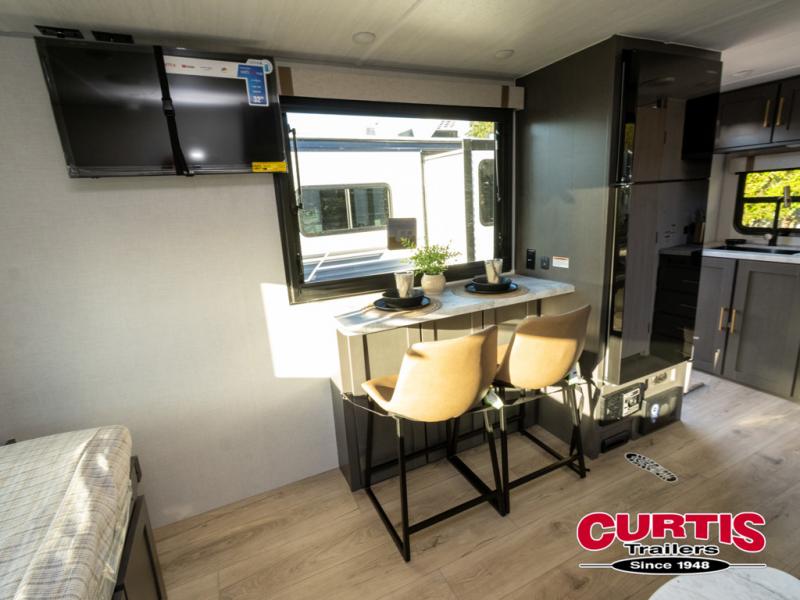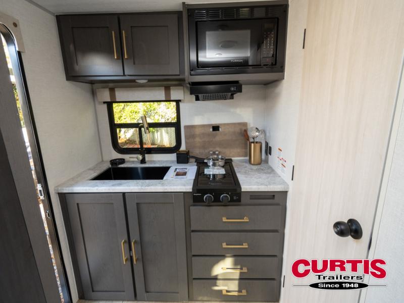 Grab your hiking gear and hit the road in this no-slide travel trailer! The front queen bed will provide a comfortable place to rest your head each night, and the rear corner full bath will let you freshen up without having to use the camp's facilities. The full kitchen includes an all-in-one microwave and air fryer plus a refrigerator to keep food stocked. You'll find comfortable seating space on the jackknife sofa, and you can enjoy your morning coffee at the counter with two stools and a flip-up window! This unit also includes an outside kitchen with a grill to keep the fish fry odors outside!