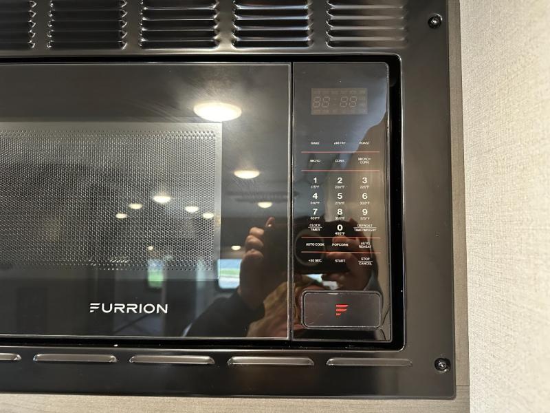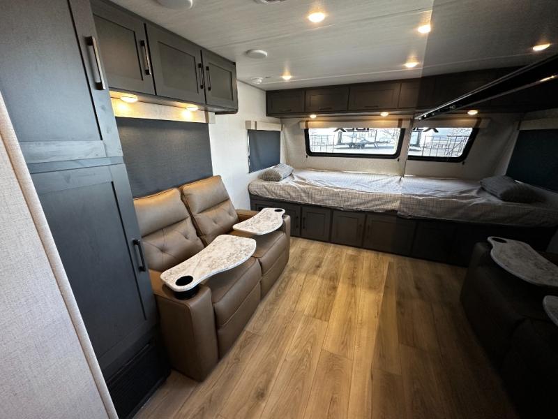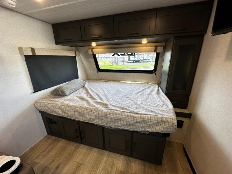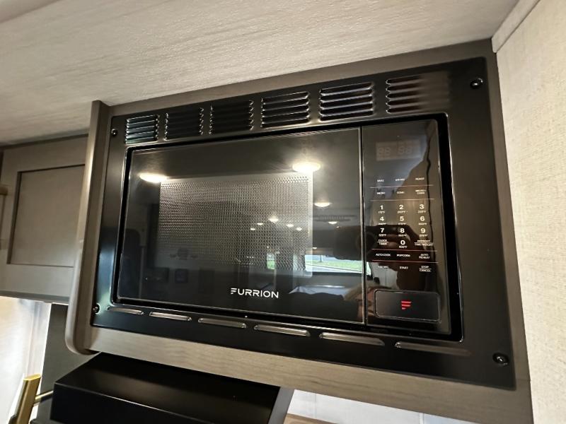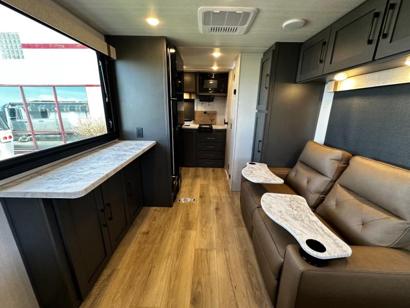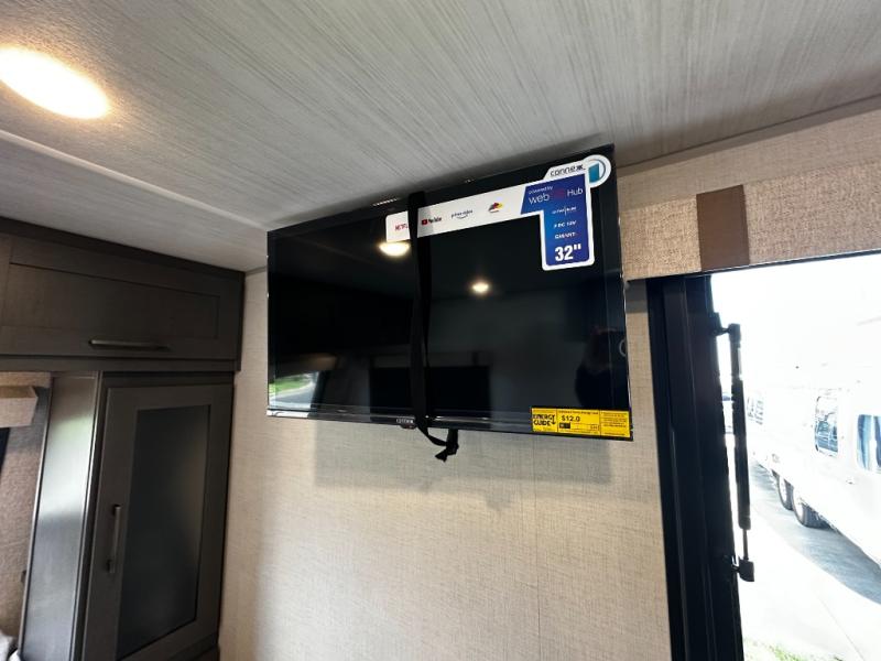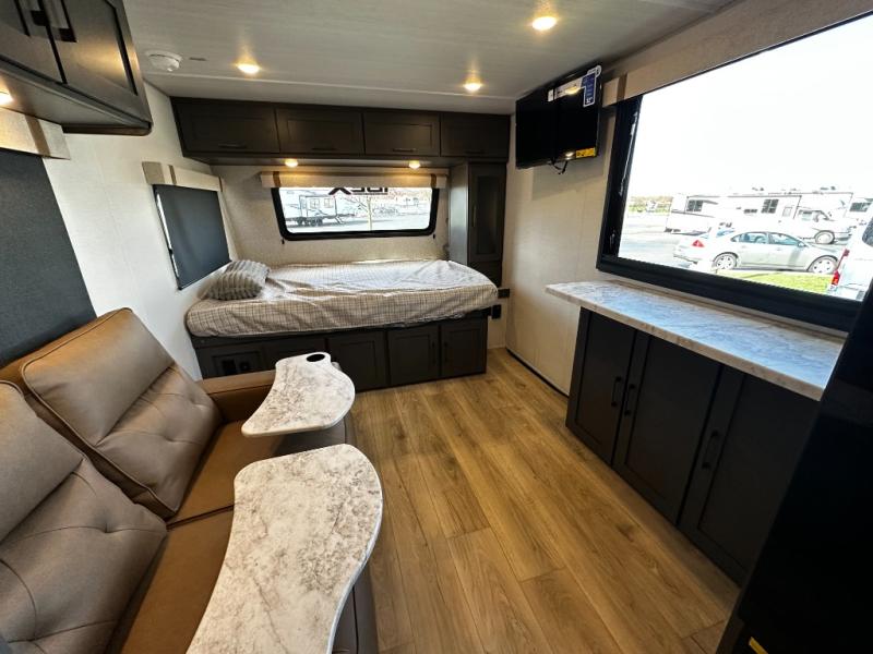 Inside, the 16MBJ balances smart use of space with thoughtful amenities. The efficient floorplan includes a comfortable sleeping area, a flexible dinette that converts for extra sleep space, and panoramic windows that bring the outdoors in. Natural light fills the interior, creating an open and uplifting feel even in tight spaces.