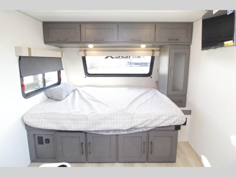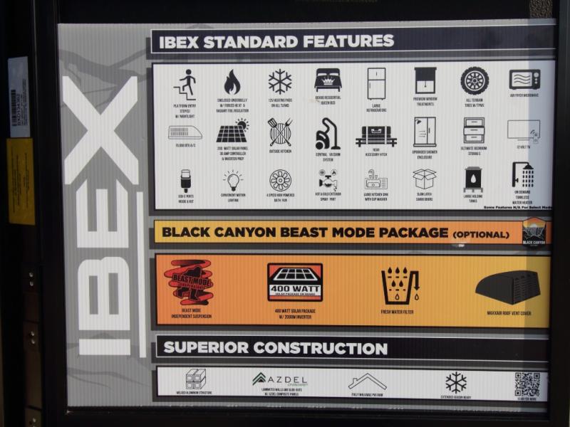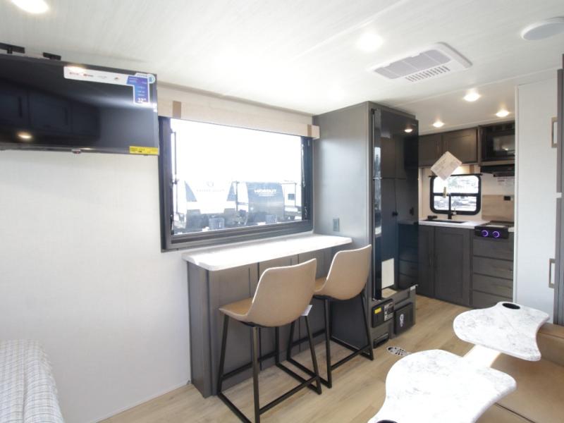 This comfortable 2026 Ibex 16MBJ Beast Mode travel trailer features a front queen bed, rear corner full bath, and a full kitchen with a combination microwave and air fryer!
