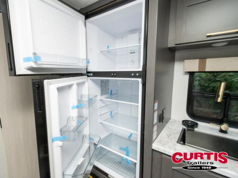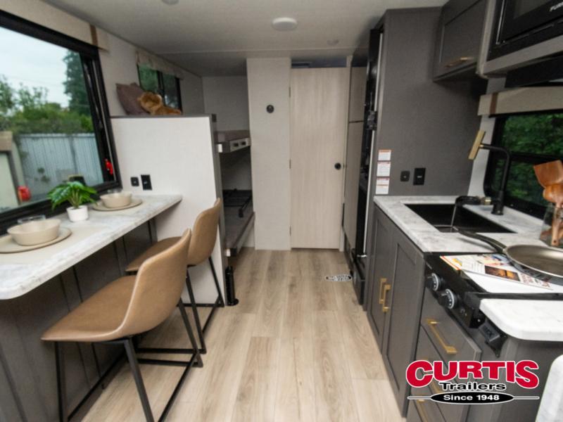 Grab your hiking gear and hit the road in this no-slide travel trailer! The front queen bed will provide a comfortable place to rest your head each night, and the rear corner full bath will let you freshen up without having to use the camp's facilities. There are also 30" x 74" bunk beds for the little ones or your guests to sleep on. The full kitchen includes an air fryer microwave plus a refrigerator to keep food stocked, although you might just find yourselves using the outside kitchen with a grill more! There is also a patio awning outside, along with slam latch cargo doors with pass-thru lighting!