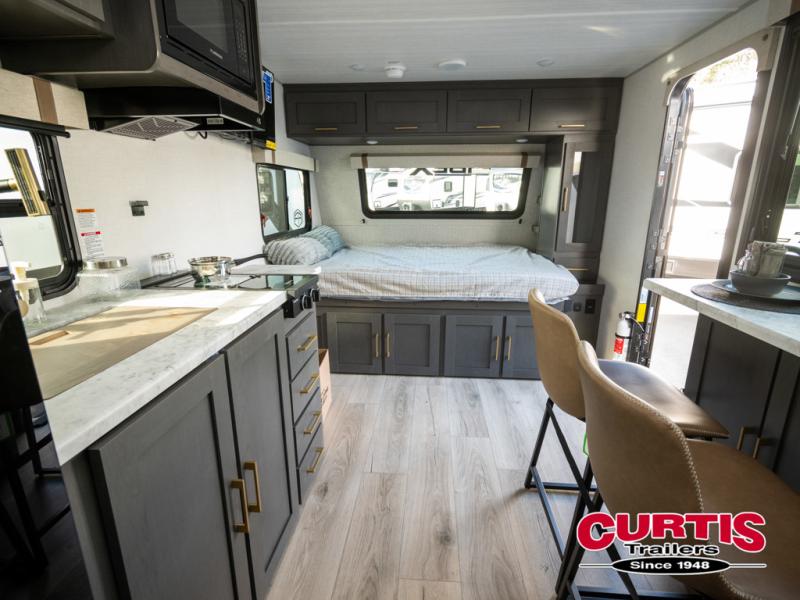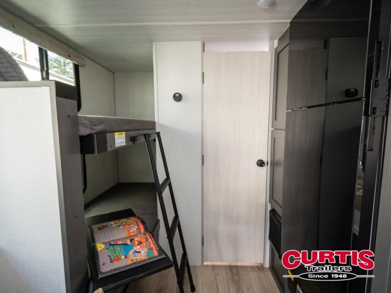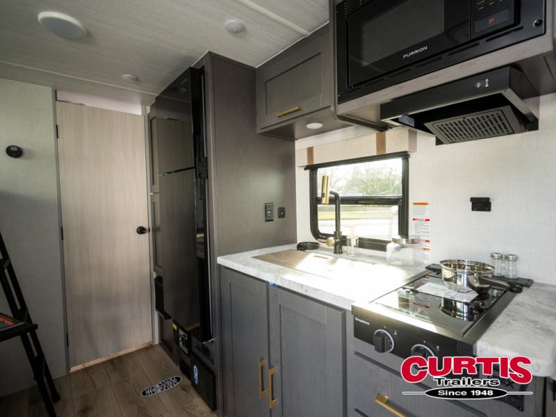 Grab your hiking gear and hit the road in this no-slide travel trailer! The front queen bed will provide a comfortable place to rest your head each night, and the rear corner full bath will let you freshen up without having to use the camp's facilities. There are also 30" x 74" bunk beds for the little ones or your guests to sleep on. The full kitchen includes an air fryer microwave plus a 12V refrigerator to keep food stocked, although you might just find yourselves using the outside kitchen with a grill more! There is also a patio awning outside, along with slam latch cargo doors with pass-thru lighting!