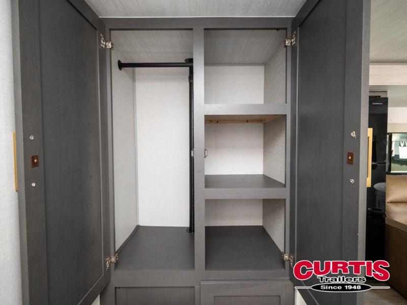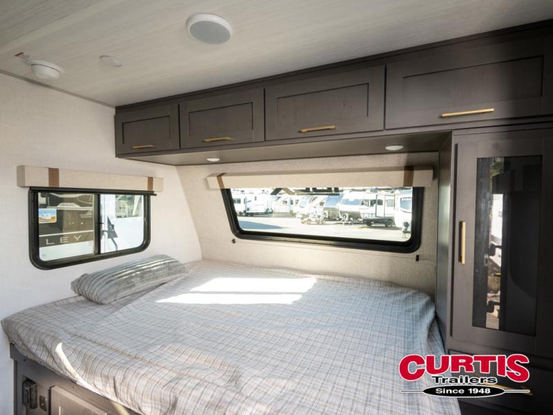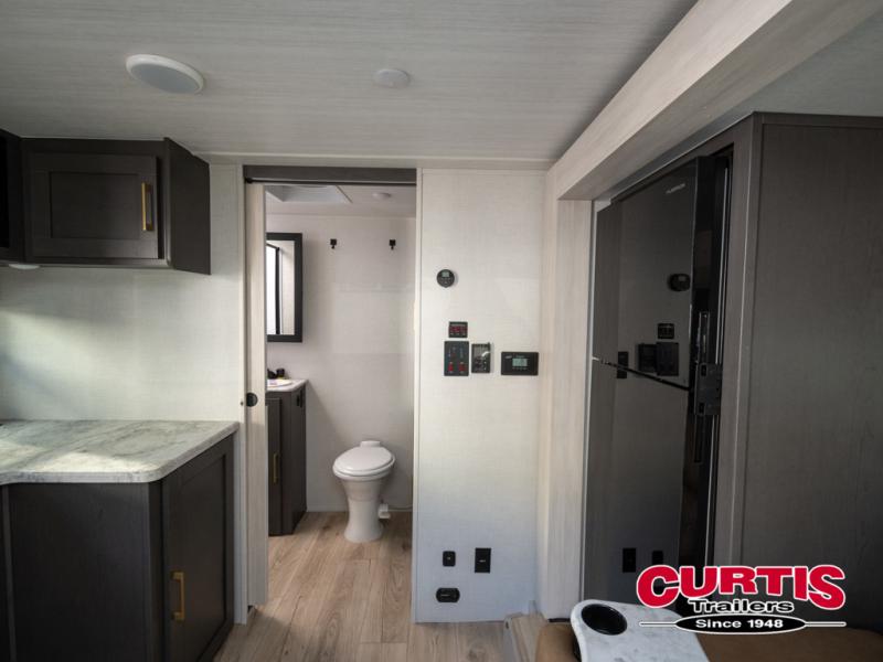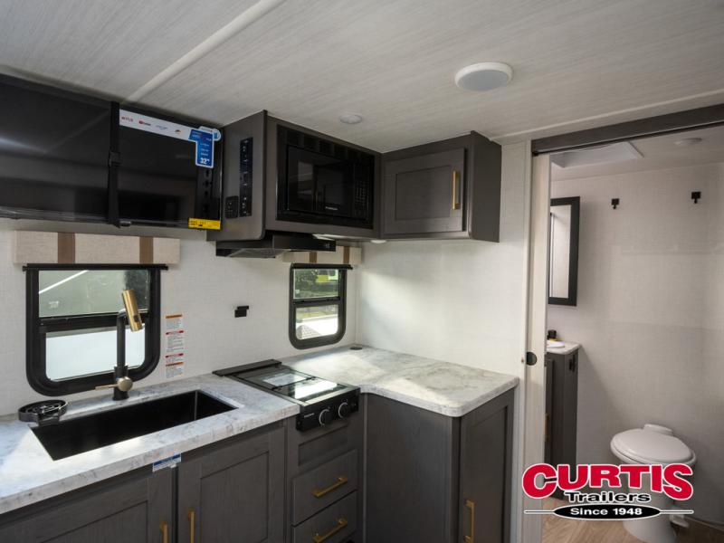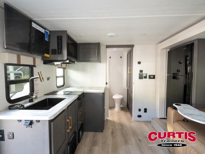 Grab your hiking gear and hit the road in this single slide out travel trailer! The front queen bed will provide a comfortable place to rest your head each night, and the full rear bath will let you freshen up without having to use the camp's facilities. The full kitchen includes a microwave air fryer plus a refrigerator to keep food stocked. You'll be able to relax on the sofa slide out that sits across from the entertainment center, and when you're ready for bed, the front queen bed will be waiting for you. There is also a wardrobe and overhead cabinet to keep your things tidy!