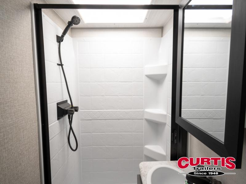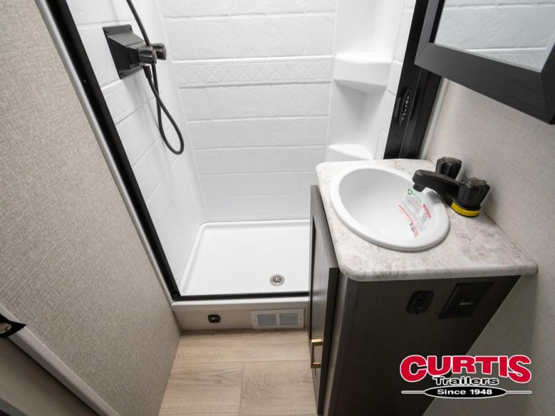 The Forest River IBEX travel trailers are extended season ready, and adventure approved! They are built with a sealed underbelly with forced heat and radiant foil barrier, along with an aluminum framed floor and 12V tank heaters. There are also all-terrain tires with TPMS, a 200-watt solar panel, a power tongue jack, and roof ladder prep. Inside, you'll love the Surf(X) seamless countertops and the large kitchen sink with a cup washer, plus there is Bluetooth audio with marine grade speakers so you can listen to your favorite tunes. The optional Black Canyon Beast Mode Package is available with an independent suspension, 400 watts of solar, a fresh water filter, and a Maxxair roof vent cover.