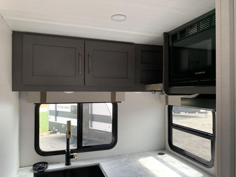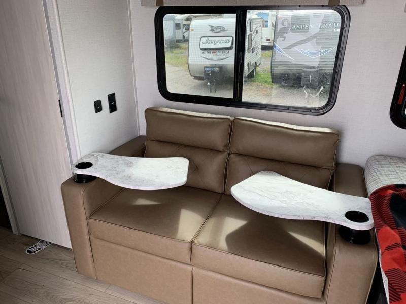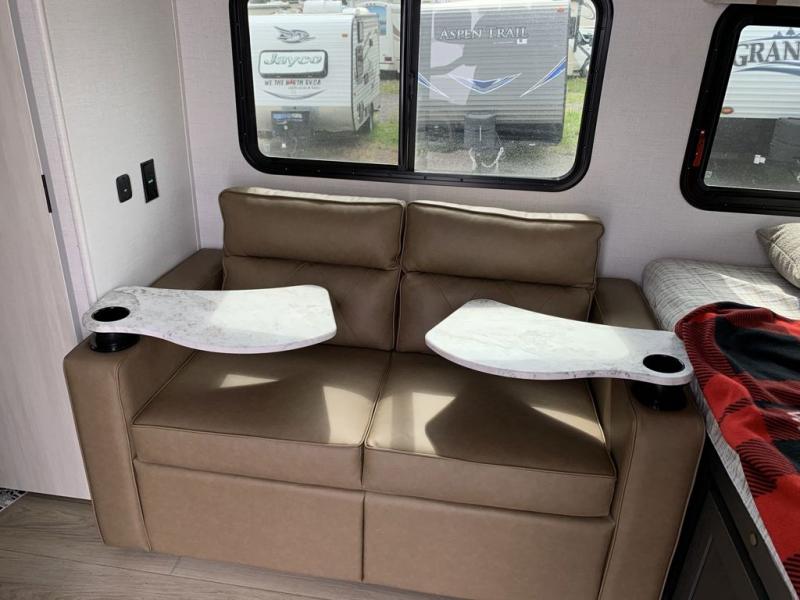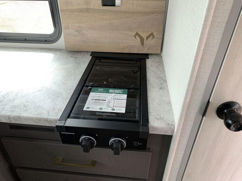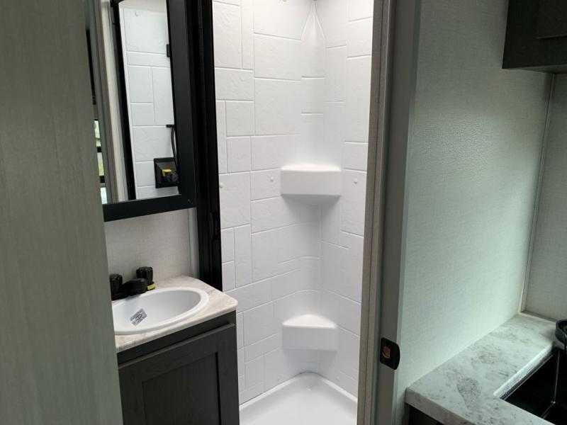 Grab your hiking gear and hit the road in this no-slide travel trailer! The front queen bed will provide a comfortable place to rest your head each night, and the rear corner full bath will let you freshen up without having to use the camp's facilities. The full kitchen includes an all-in-one microwave and air fryer plus a refrigerator to keep food stocked. You'll find comfortable seating space on the jackknife sofa, or you can sit outside under the awning! This unit also includes an outside kitchen with a grill to keep the fish fry odors outside!