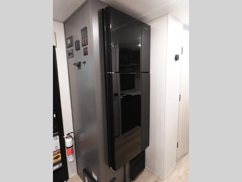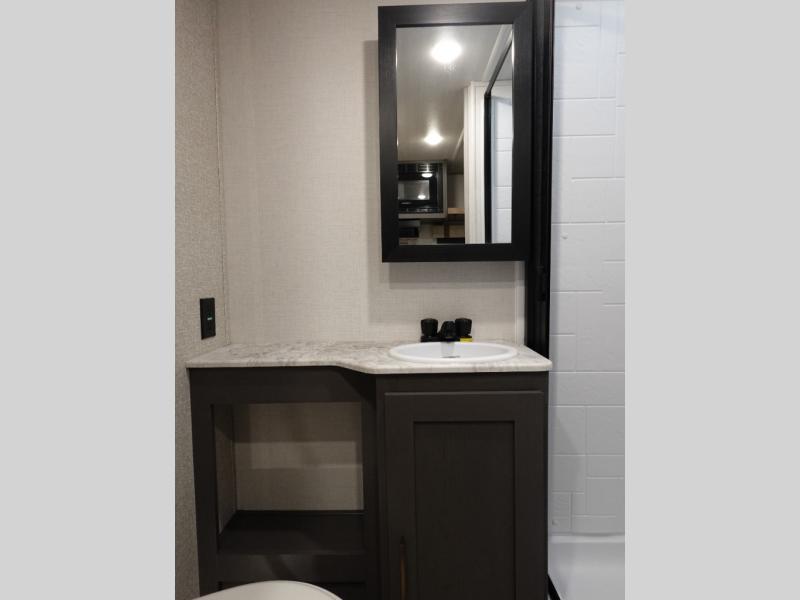 Grab your hiking gear and hit the road in this no-slide travel trailer! The front queen bed will provide a comfortable place to rest your head each night, and the rear corner full bath will let you freshen up without having to use the camp's facilities. The full kitchen includes a microwave air fryer plus a refrigerator to keep food stocked. You'll find comfortable seating space on the theater sofa, or you can sit outside under the awning! This unit also includes an outside kitchen with a grill to keep the fish fry odors outside!