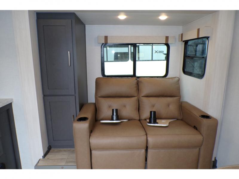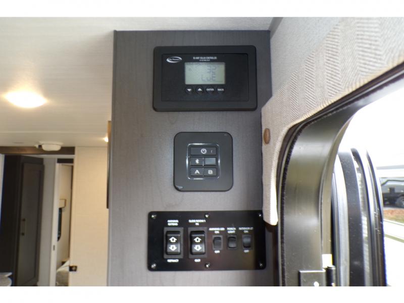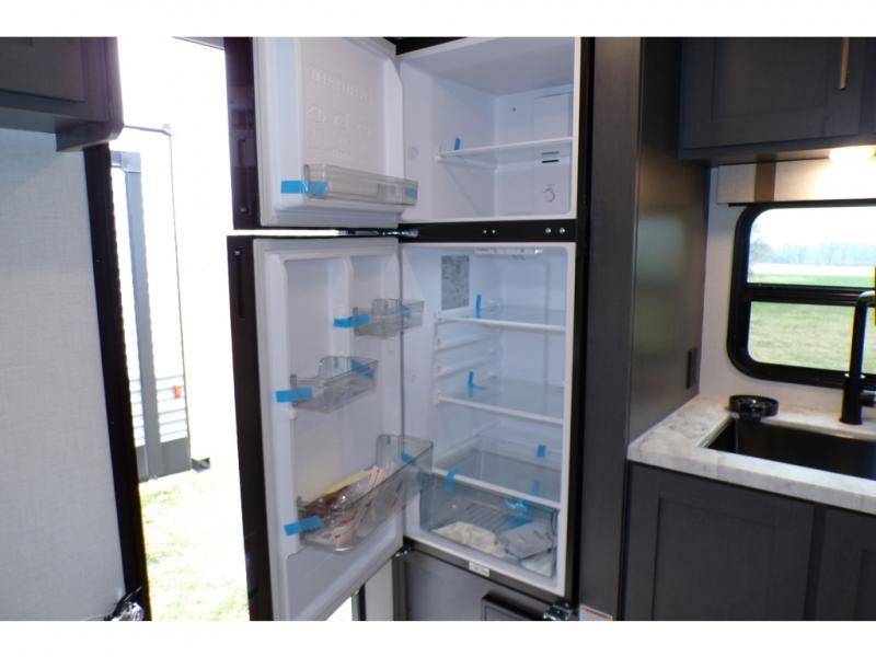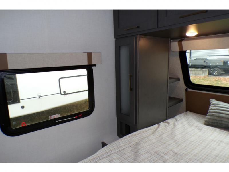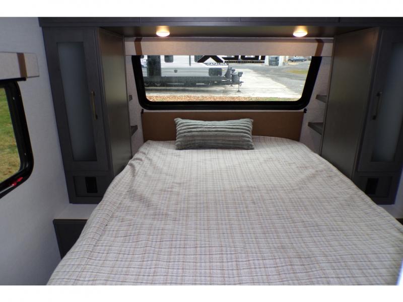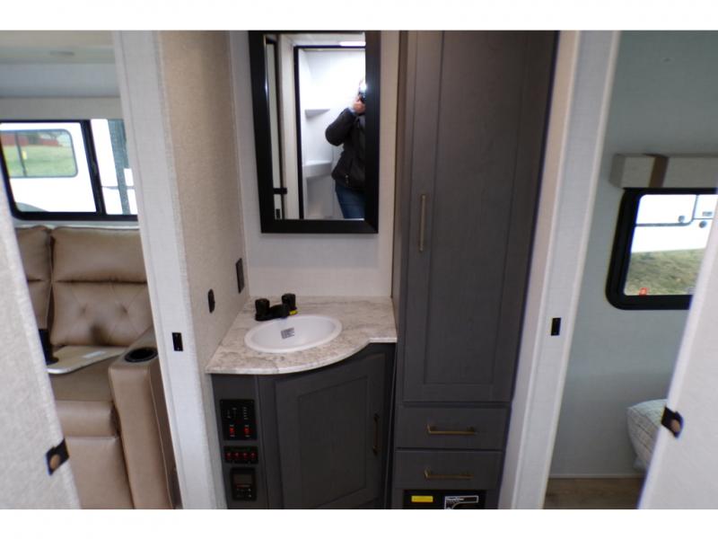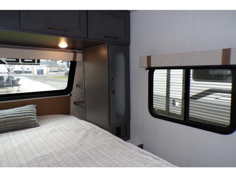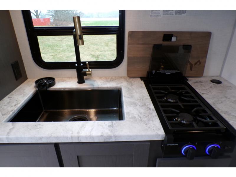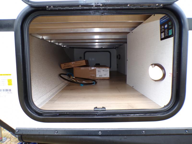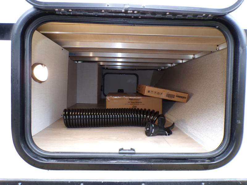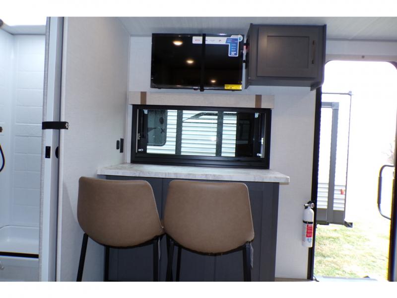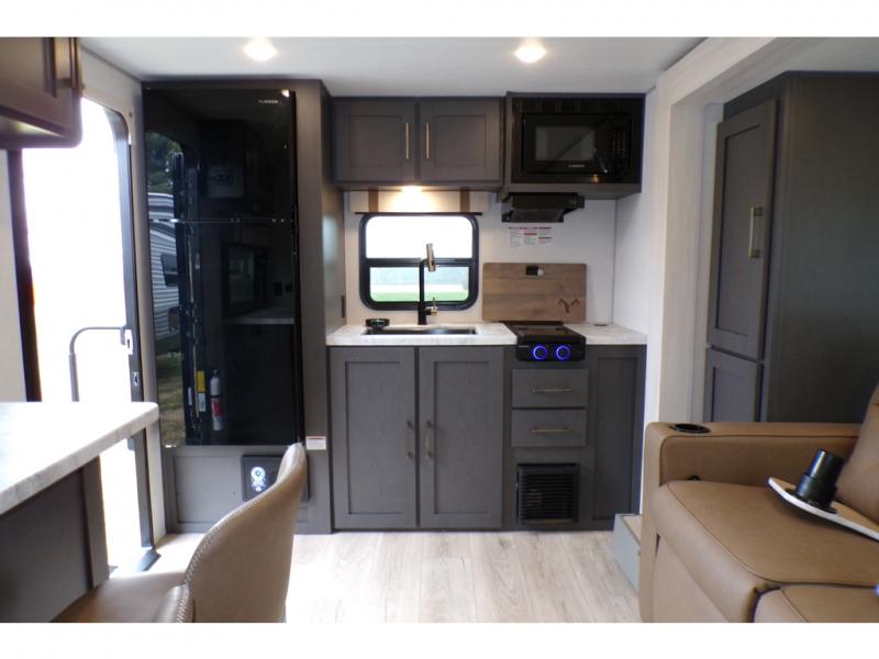 If you're looking for a couple's or solo travel trailer, this is the one! Once you arrive at the campground, you can unload the pass-thru storage, put out the 16' awning, and start lunch on the outside kitchen. The walk-thru bath is spacious and includes a spacious linen closet to keep dry towels close by. There is a theater seating slide out where you can relax each day, plus a bar top with two stools and a flip-up window for dining space. And the rear kitchen includes everything you need to cook meals when the weather isn't cooperating outside.