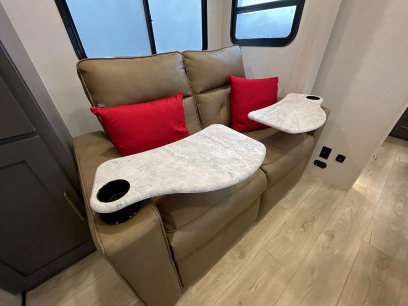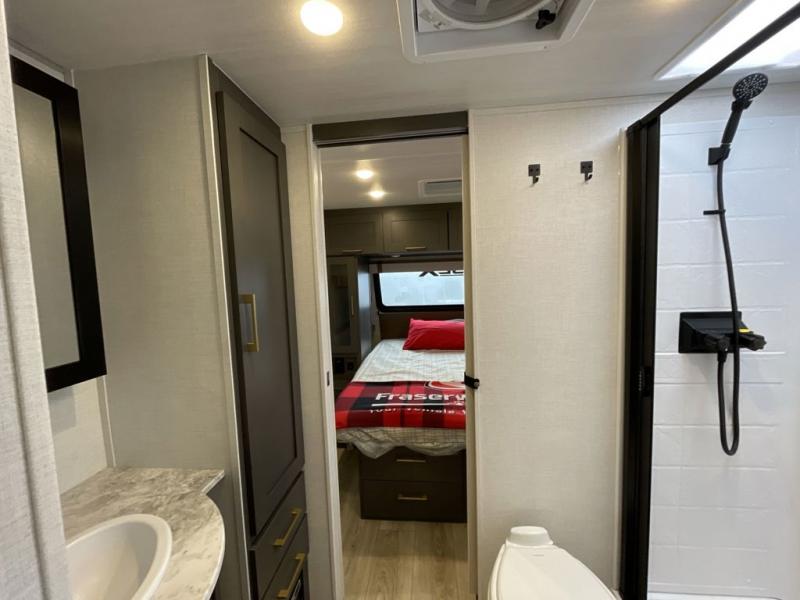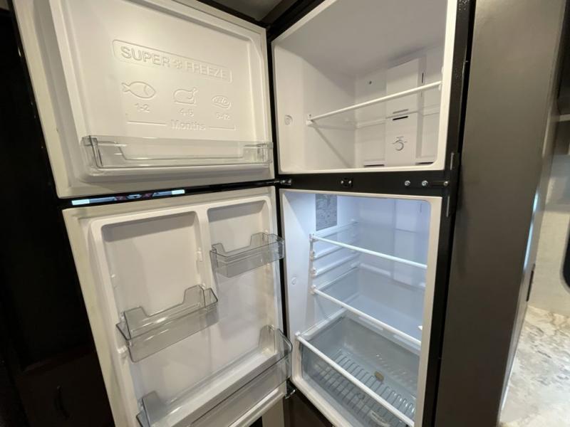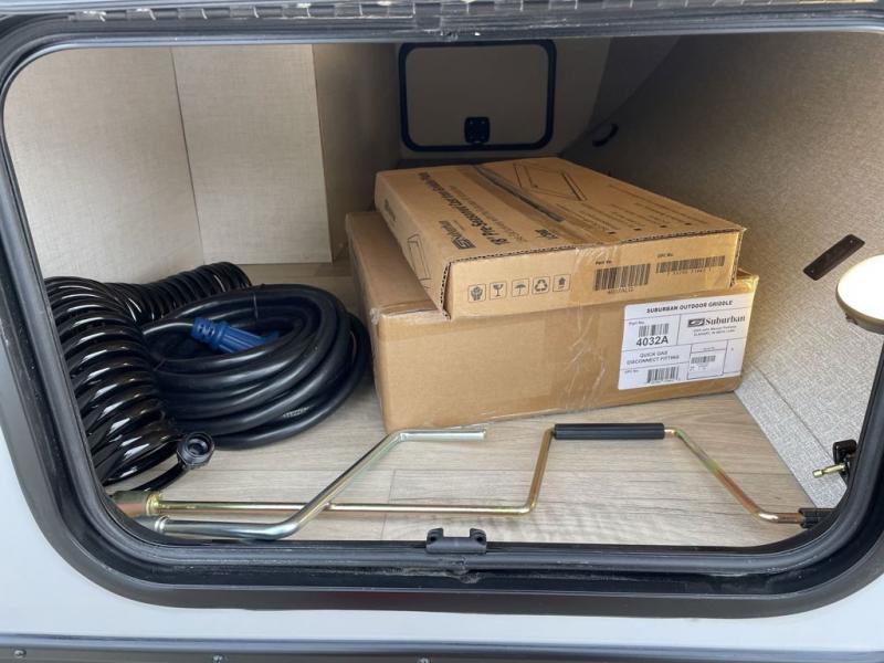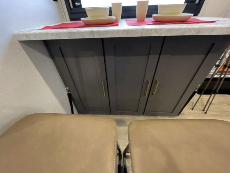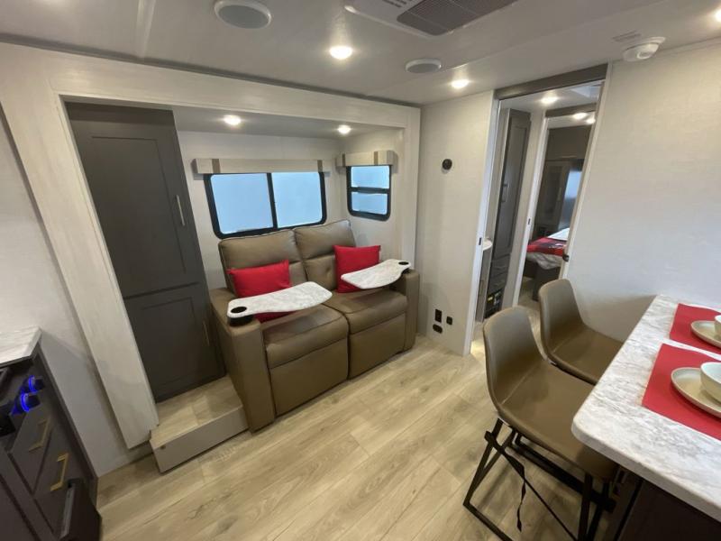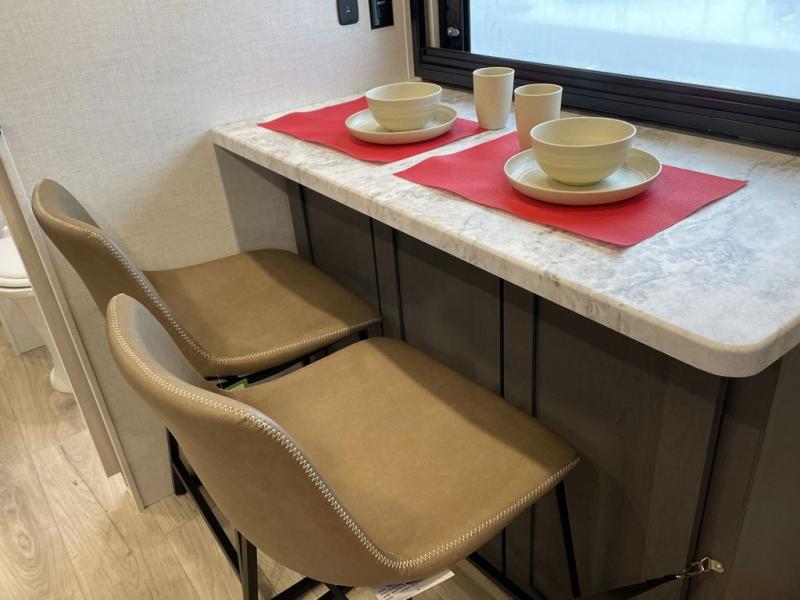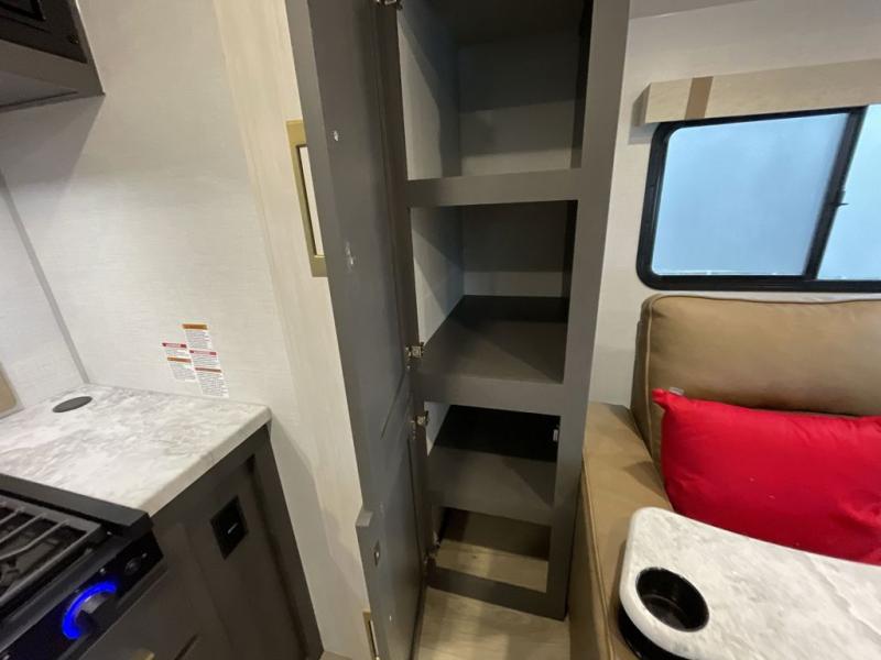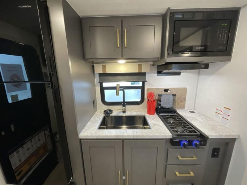 If you're looking for a couple's or solo travel trailer, this is the one! Once you arrive at the campground, you can unload the pass-thru storage, put out the 16' awning, and start lunch on the outside kitchen. The walk-thru bath is spacious and includes a spacious linen closet to keep dry towels close by. There is a theater seating slide out where you can relax each day, plus a bar top with two stools and a flip-up window for dining space. And the rear kitchen includes everything you need to cook meals when the weather isn't cooperating outside.