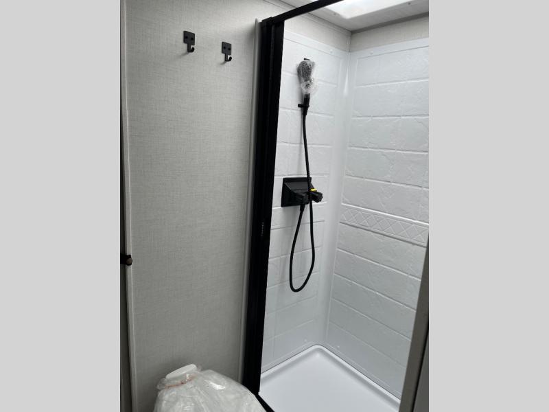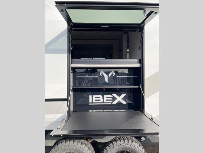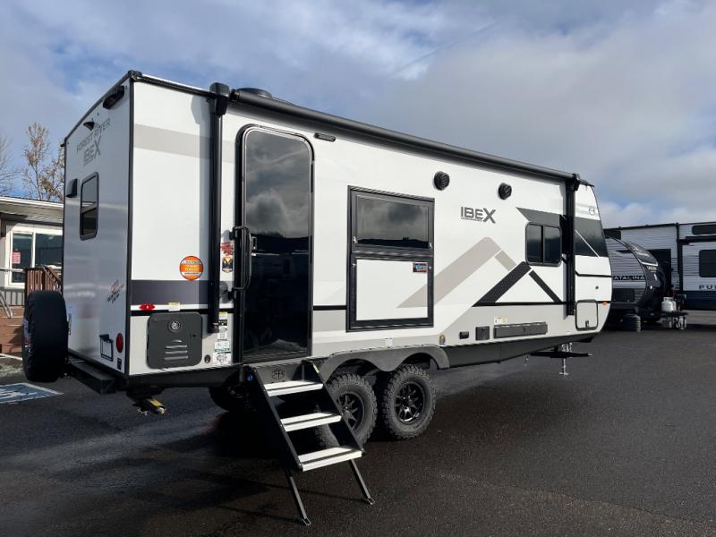 The Forest River IBEX travel trailers are extended season ready, and adventure approved! They are built with a fully walkable PVC roof, a welded aluminum structure, and laminated walls and slide outs with Azdel composite panels. There are also all-terrain tires with TPMS, a hot and cold exterior spray port, and large holding tanks for added convenience when you're set up off-grid. The USB-C ports inside and out will help you keep your electronics charged, and the premium window treatments will make your trailer feel more like home. The optional Black Canyon Beast Mode Package is available with an independent suspension, a 400-watt solar package, a fresh water filter, and a Maxxair roof vent cover.