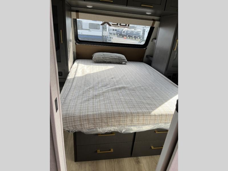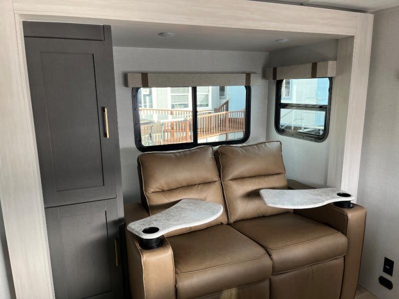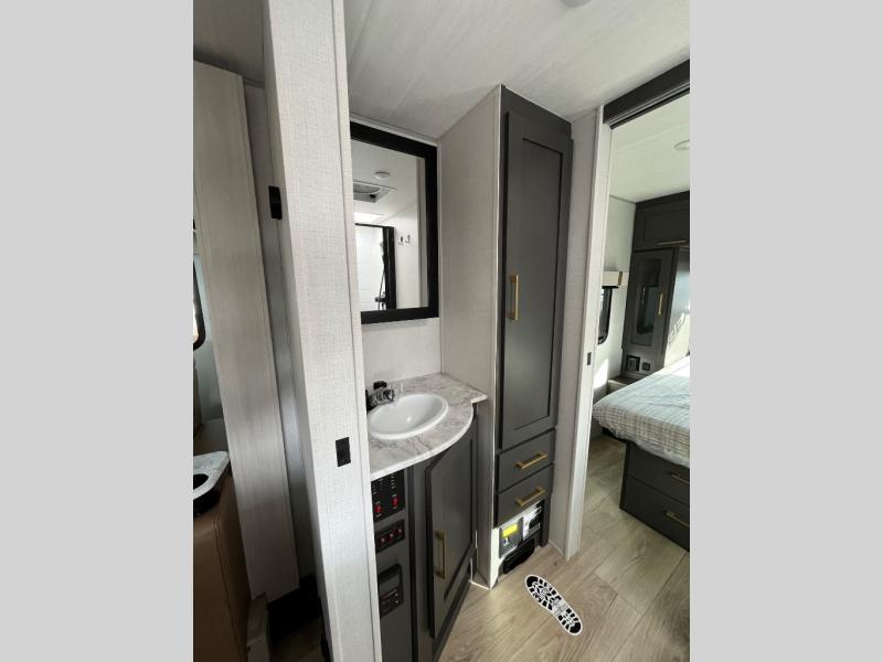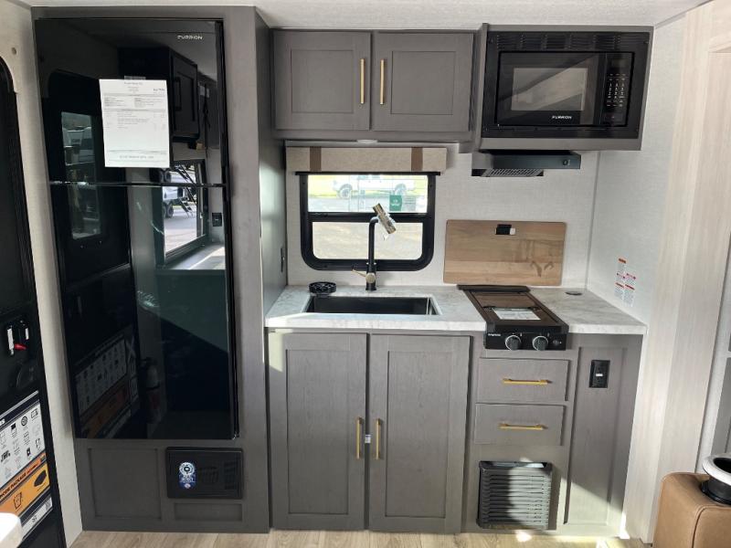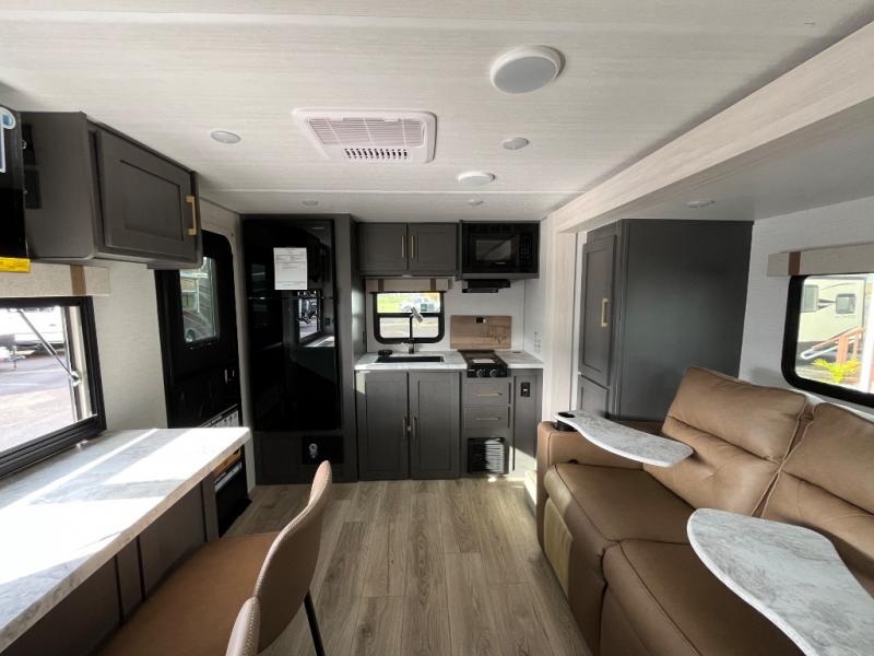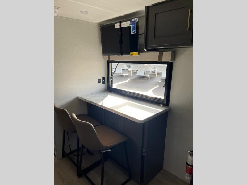 If you're looking for a couple's or solo travel trailer, this is the one! Once you arrive at the campground, you can unload the pass-thru storage, put out the 16' awning, and start lunch on the outside kitchen. The walk-thru bath is spacious and includes a spacious linen closet to keep dry towels close by. There is a theater seating slide out where you can relax each day, plus a bar top with two stools and a flip-up window for dining space. And the rear kitchen includes everything you need to cook meals when the weather isn't cooperating outside.