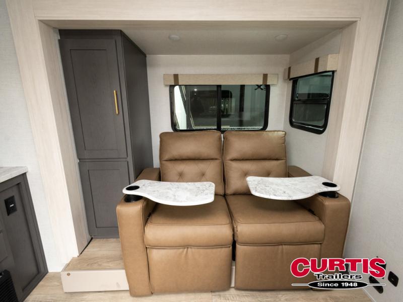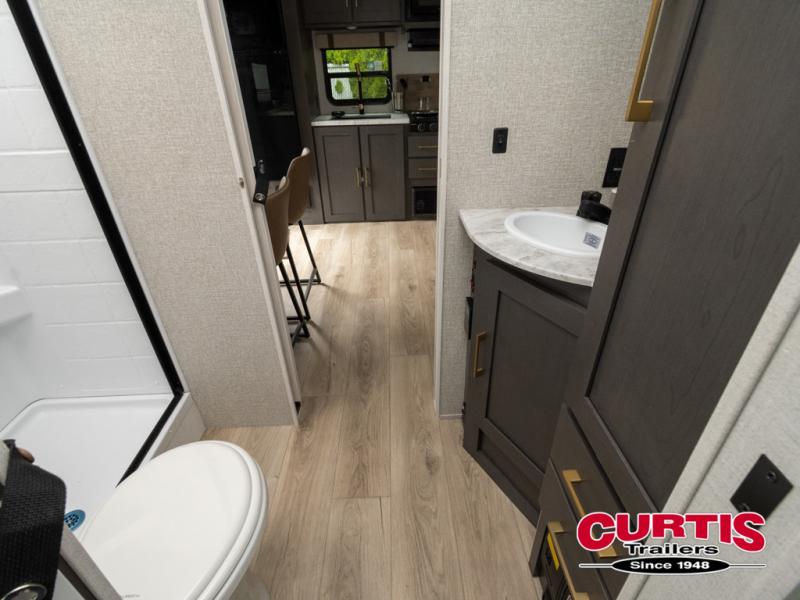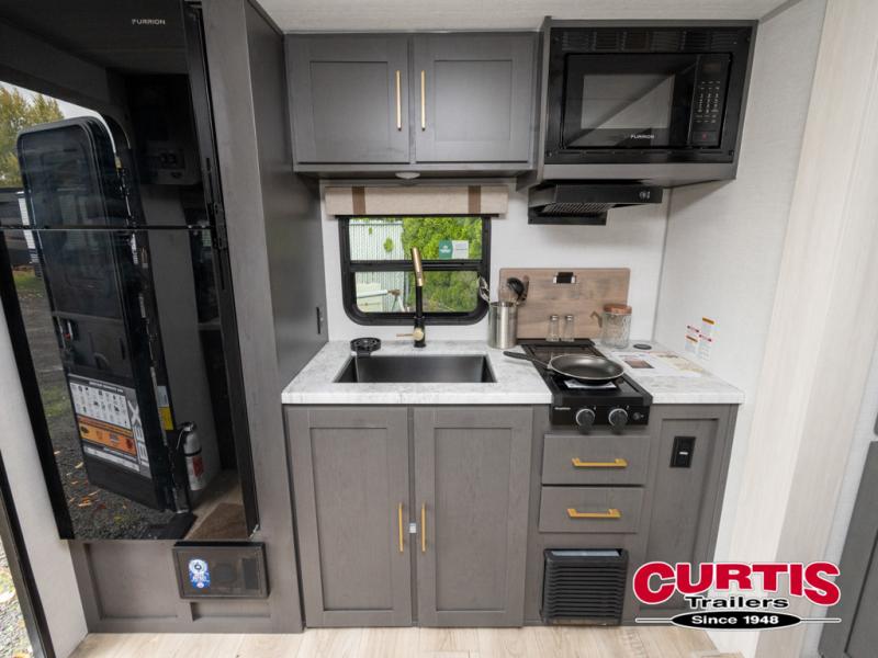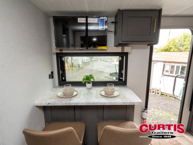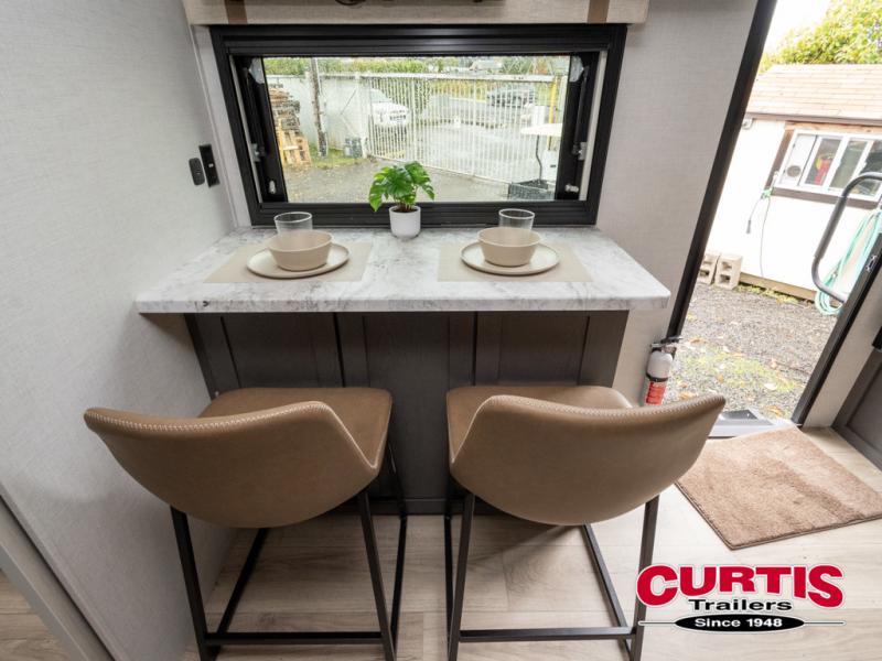 If you're looking for a couple's or solo travel trailer, this is the one! Once you arrive at the campground, you can unload the pass-thru storage, put out the 16' awning, and start lunch on the outside kitchen. The walk-thru bath is spacious and includes a spacious linen closet to keep dry towels close by. There is a theater seating slide out where you can relax each day, plus a bar top with two stools and a flip-up window for dining space. And the rear kitchen includes everything you need to cook meals when the weather isn't cooperating outside.