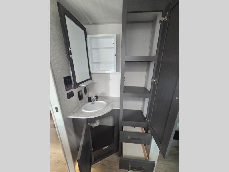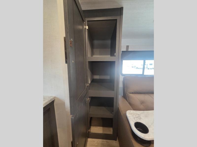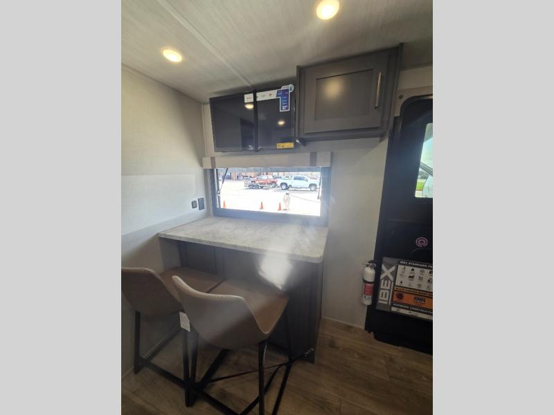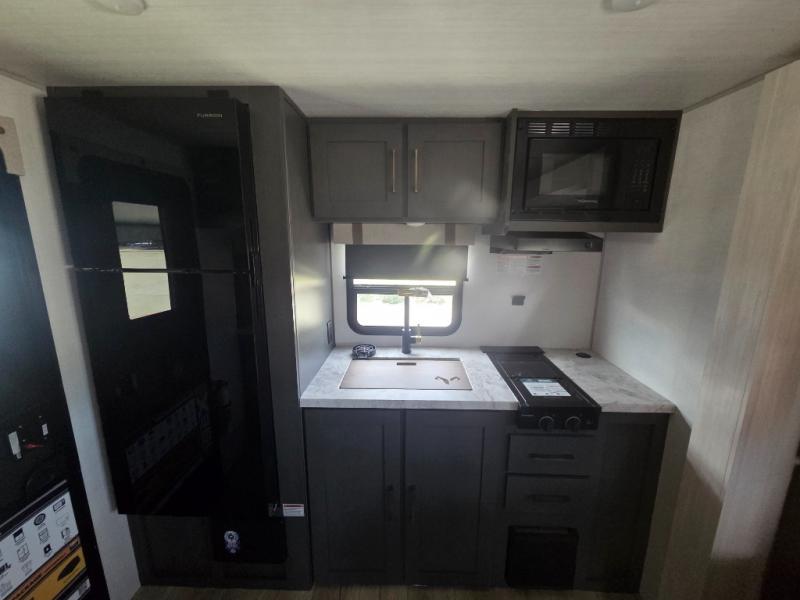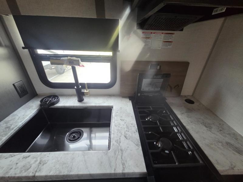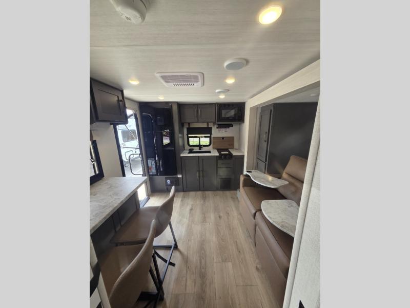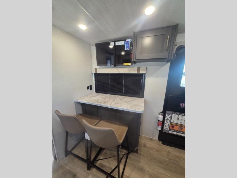 If you're looking for a couple's or solo travel trailer, this is the one! Once you arrive at the campground, you can unload the pass-thru storage, put out the 16' awning, and start lunch on the outside kitchen with a grill. The walk-thru bath is spacious and includes a spacious linen closet to keep dry towels close by. There is a theater seating slide out where you can relax each day, plus a bar top with two stools and a flip-up window for dining space. And the rear kitchen includes everything you need to cook meals when the weather isn't cooperating outside.
