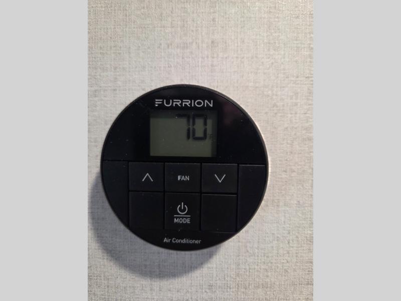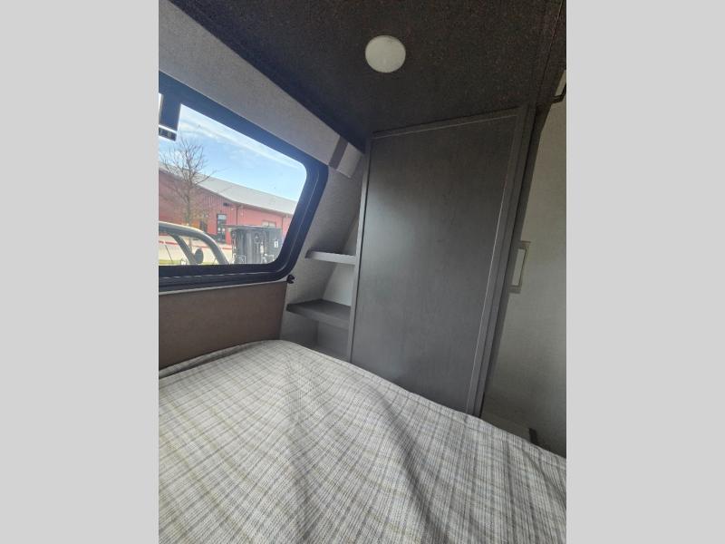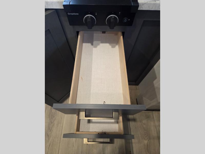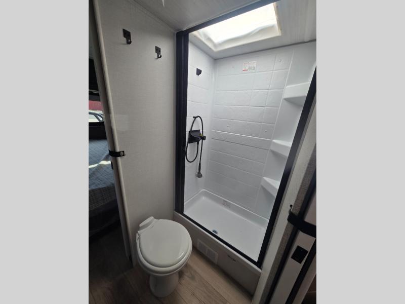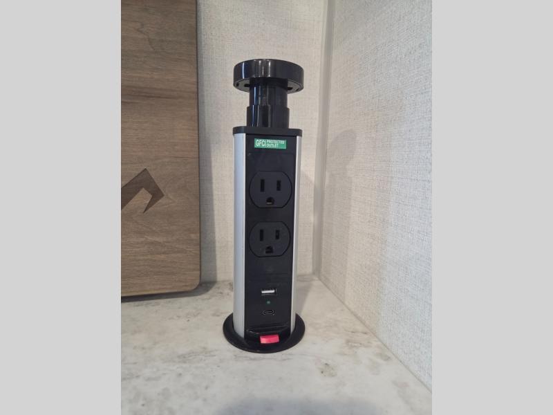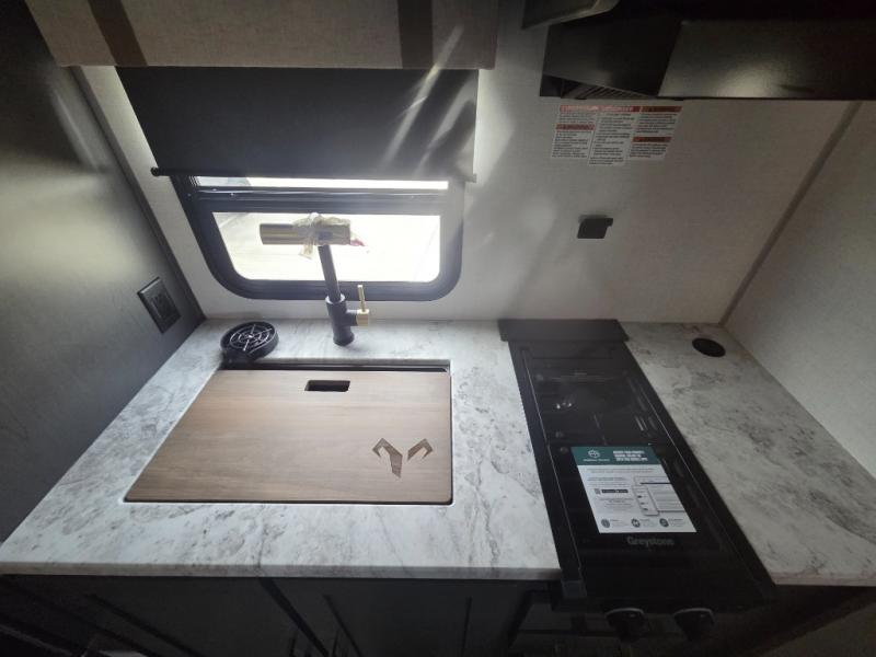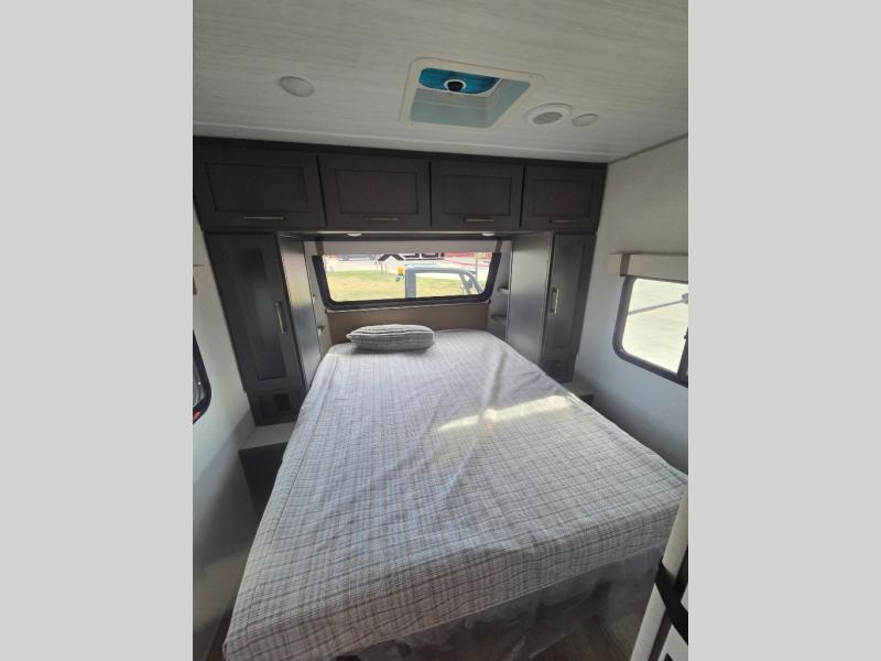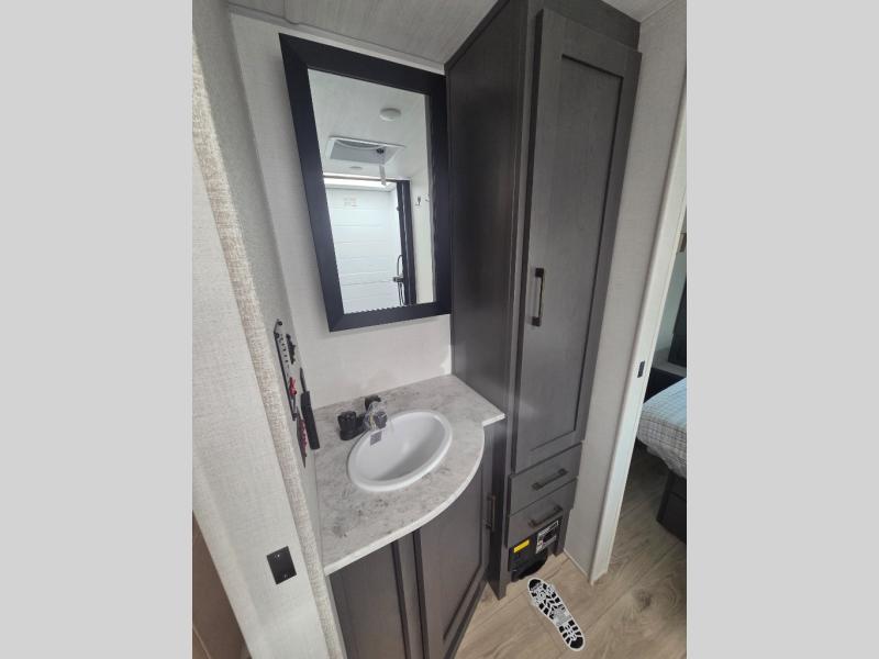 If you're looking for a couple's or solo travel trailer, this is the one! Once you arrive at the campground, you can unload the pass-thru storage, put out the 16' awning, and start lunch on the outside kitchen with a grill. The walk-thru bath is spacious and includes a spacious linen closet to keep dry towels close by. There is a theater seating slide out where you can relax each day, plus a bar top with two stools and a flip-up window for dining space. And the rear kitchen includes everything you need to cook meals when the weather isn't cooperating outside.