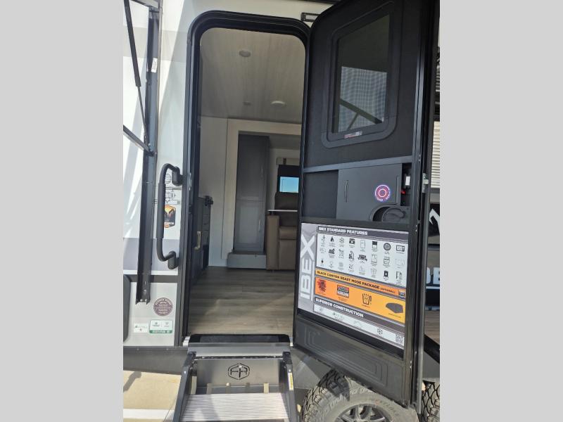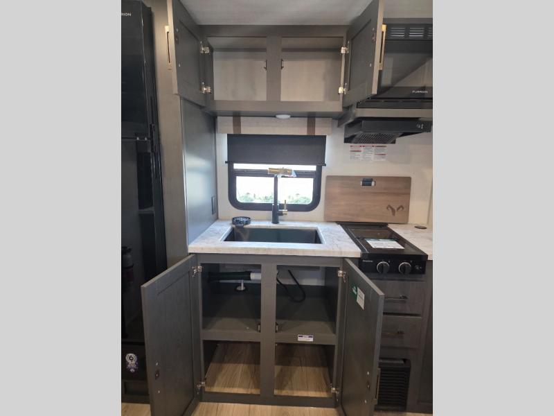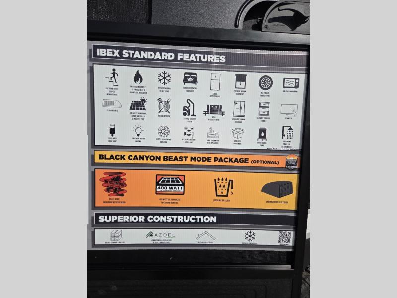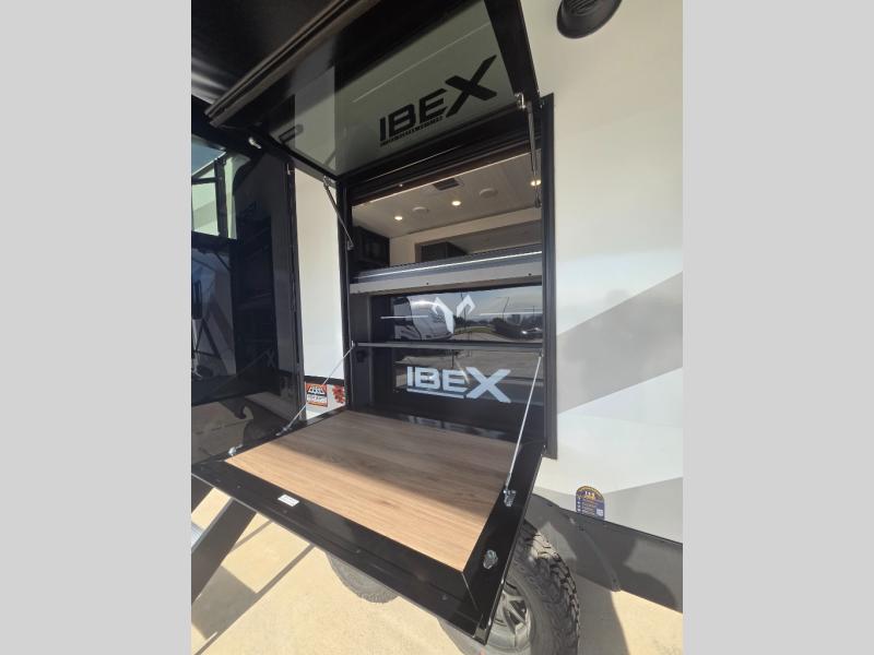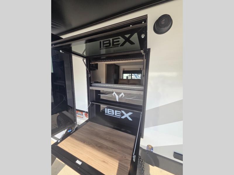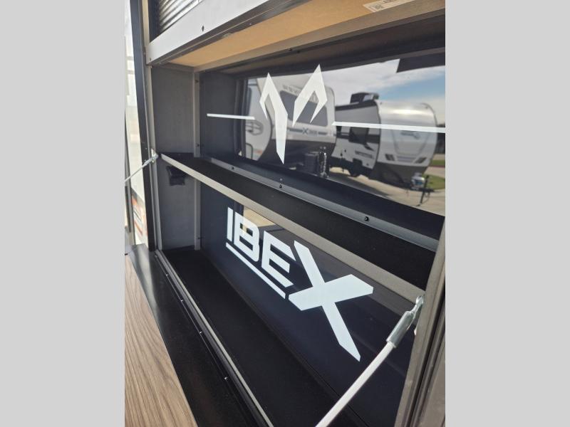 The Forest River IBEX travel trailers are extended season ready, and adventure approved! They are built with a sealed underbelly with forced heat and radiant foil barrier, along with an aluminum framed floor and 12V tank heaters. There are also all-terrain tires with TPMS, a 200-watt solar panel, a power tongue jack, and roof ladder prep. Inside, you'll love the Surf(X) seamless countertops and the large kitchen sink with a cup washer, plus there is Bluetooth audio with marine grade speakers so you can listen to your favorite tunes. The optional Black Canyon Beast Mode Package is available with an independent suspension, 400 watts of solar, a fresh water filter, and a Maxxair roof vent cover.