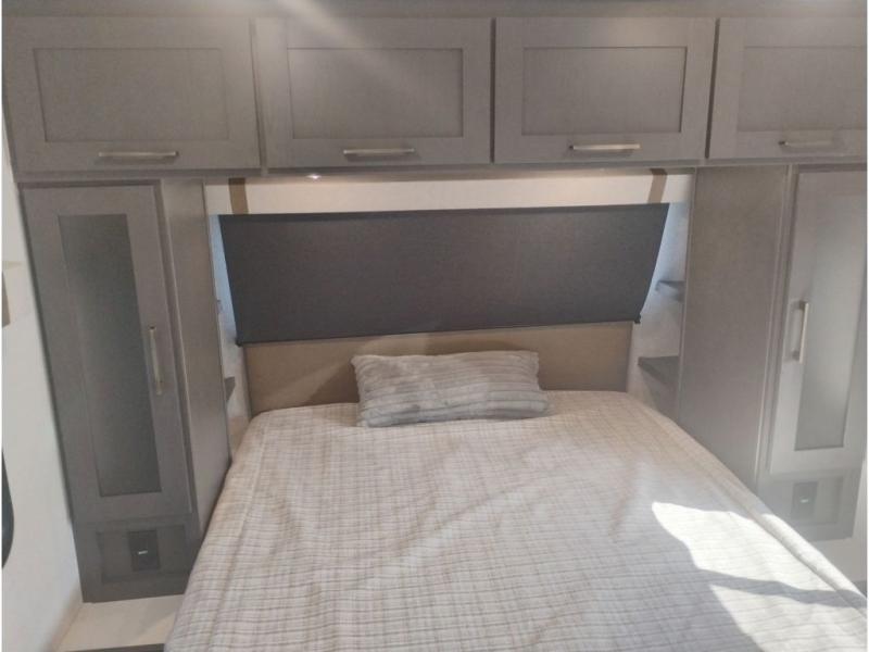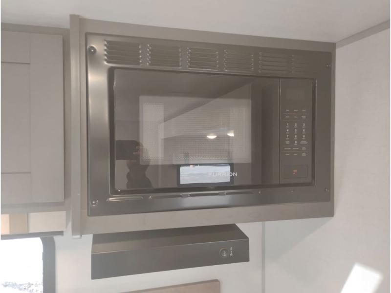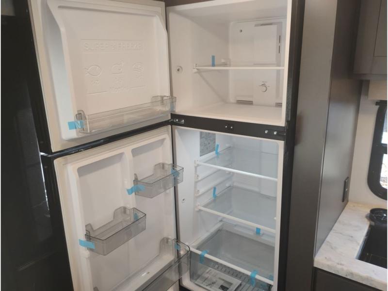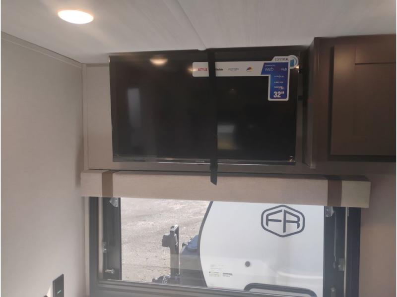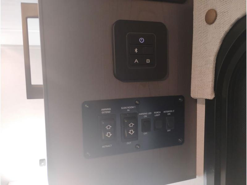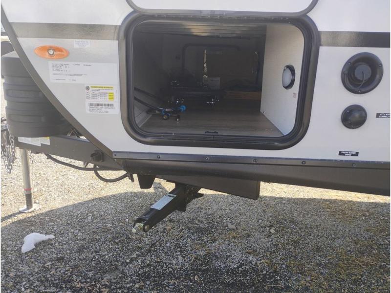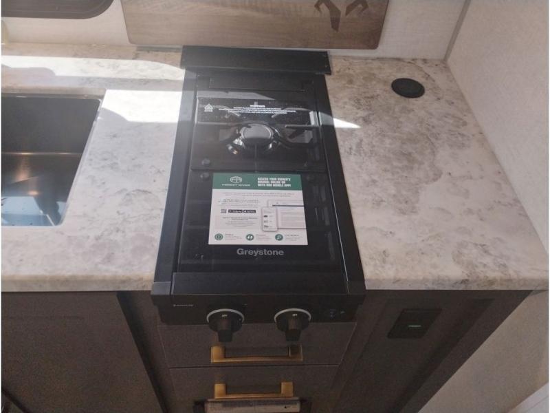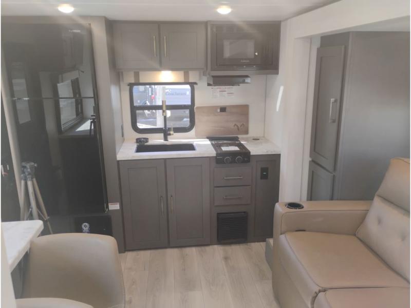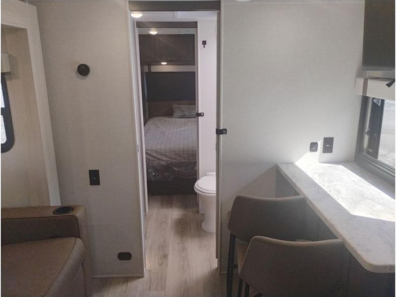 If you're looking for a couple's or solo travel trailer, this is the one! Once you arrive at the campground, you can unload the pass-thru storage, put out the 16' awning, and start lunch on the outside kitchen with a grill. The walk-thru bath is spacious and includes a spacious linen closet to keep dry towels close by. There is a theater seating slide out where you can relax each day, plus a bar top with two stools and a flip-up window for dining space. And the rear kitchen includes everything you need to cook meals when the weather isn't cooperating outside.