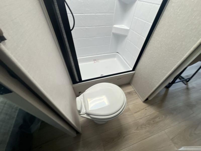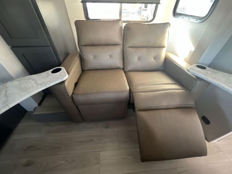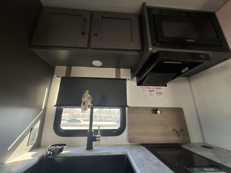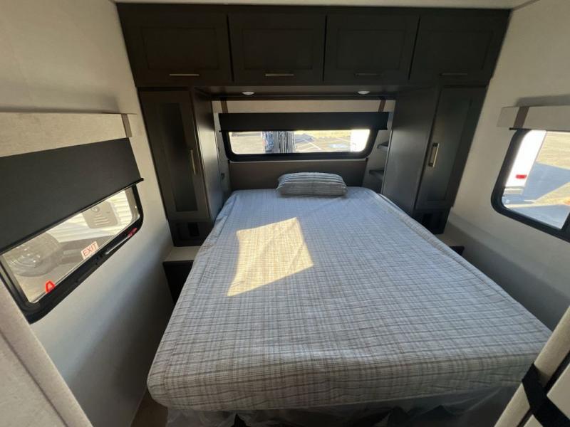 If you're looking for a couple's or solo travel trailer, this is the one! Once you arrive at the campground, you can unload the pass-thru storage, put out the 16' awning, and start lunch on the outside kitchen with a grill. The walk-thru bath is spacious and includes a spacious linen closet to keep dry towels close by. There is a theater seating slide out where you can relax each day, plus a bar top with two stools and a flip-up window for dining space. And the rear kitchen includes everything you need to cook meals when the weather isn't cooperating outside. When the optional Black Canyon Beast Mode Package is chosen on this model, you'll find an independent suspension, an additional 200-watt solar panel, totaling 400 watts of solar, a Maxxair vent cover and more!