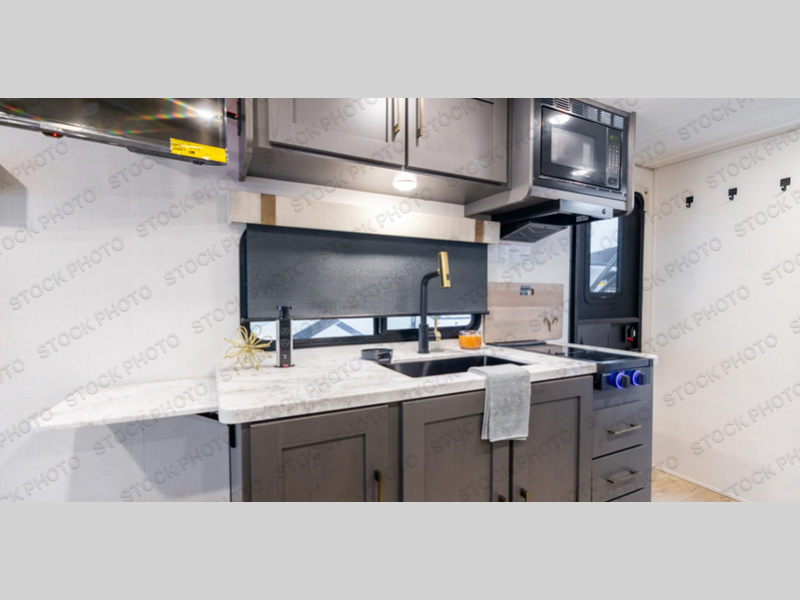 This travel trailer is sure to make each camping trip comfortable and hassle-free. There's a 60" x 80" queen bed up front, along with dual bedside wardrobes to keep your clothes organized. The sofa slide will provide a place to relax in the evenings and let a guest stay over. And the chef of your group will love cooking in the full kitchen with its microwave air fryer, and there is a 12V refrigerator to keep cold items fresh. At the rear you'll find a full bath with a shower, toilet, sink, and a linen closet plus shelves for plenty of storage space. When the optional Black Canyon Beast Mode Package is chosen on this model, you'll find an independent suspension, an additional 200-watt solar panel, totaling 400 watts of solar, a fresh water filter and more!