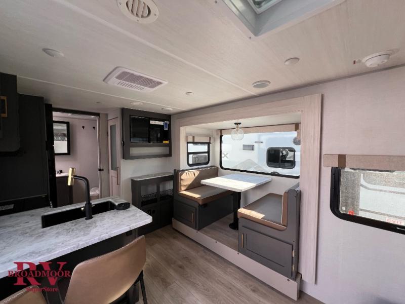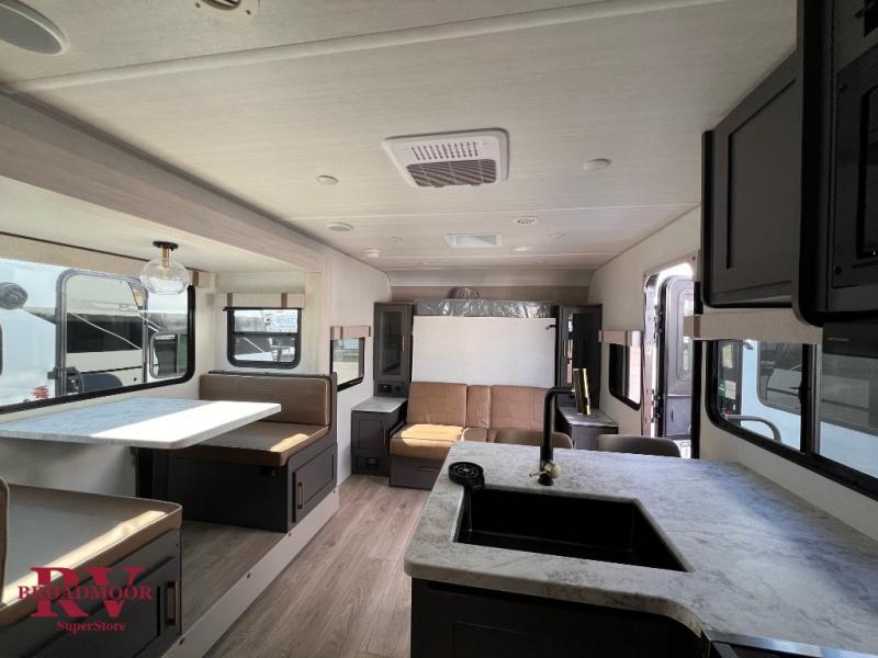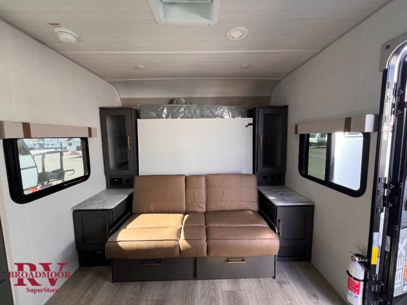 This Forest River IBEX travel trailer has a clever use of space that gives you a lot of options. The kitchen features an L-shaped countertop with bar stool seats, or you can eat at the booth dinette that is tucked into its own slide out so there's plenty of floor space. The sofa is across from the entertainment center and fireplace so you can relax in the evenings. When it's time for bed, there's a 60" x 80" Murphy bed which will be super comfortable for a good night's sleep! The rear bath has a roomy shower plus a wardrobe and linen closet to store all your things.