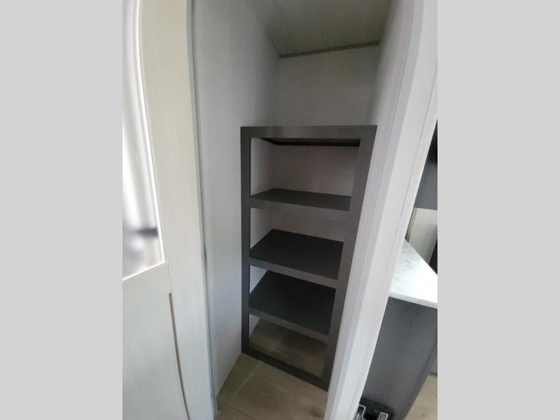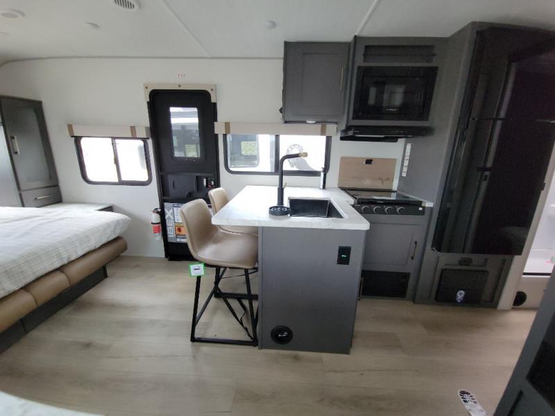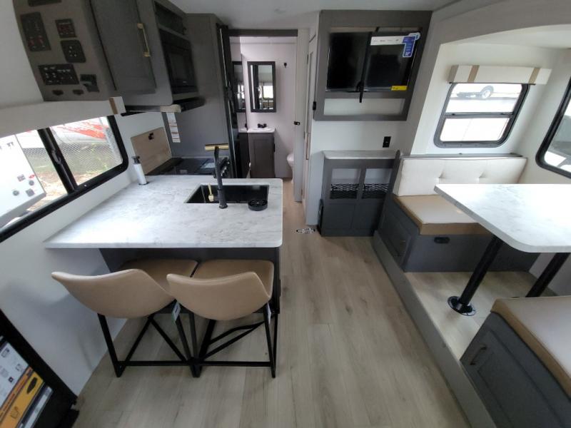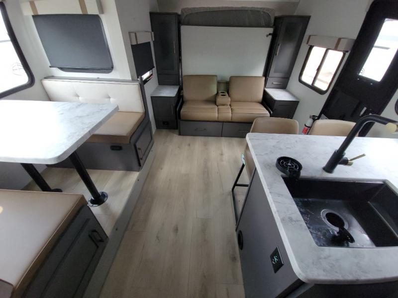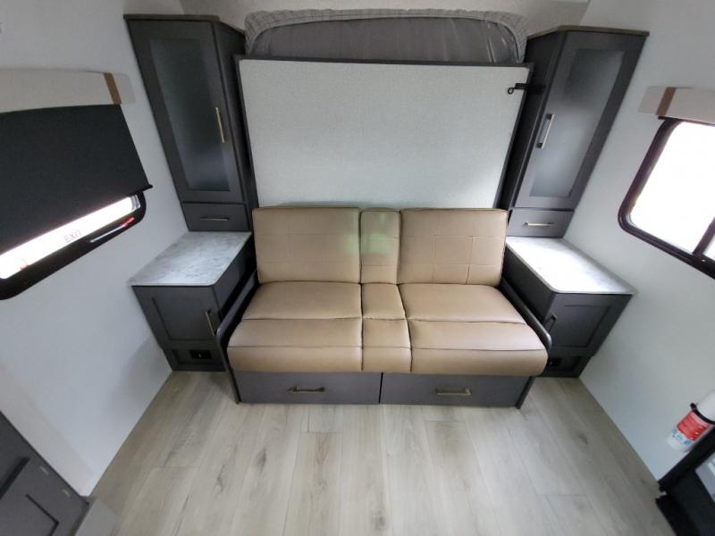 This Forest River IBEX travel trailer has a clever use of space that gives you a lot of options. The kitchen features an L-shaped countertop with bar stool seats, or you can eat at the booth dinette that is tucked into its own slide out so there's plenty of floor space. The sofa is across from the entertainment center and fireplace so you can relax in the evenings. When it's time for bed, there's a 60" x 80" Murphy bed which will be super comfortable for a good night's sleep! The rear bath has a roomy shower plus a wardrobe and linen closet to store all your things.
