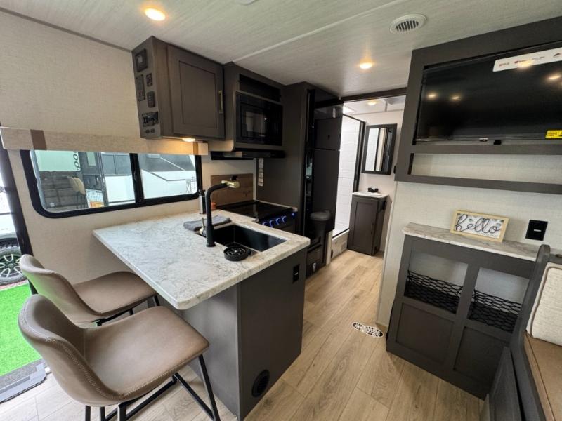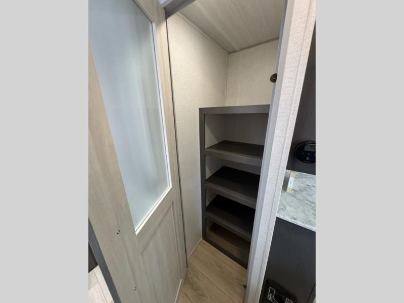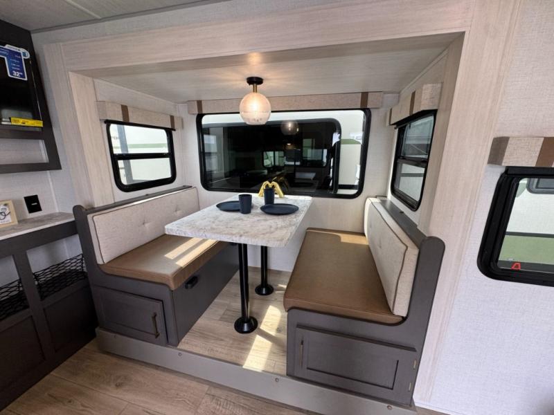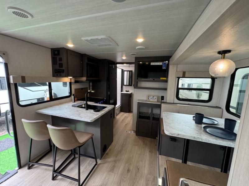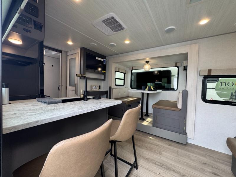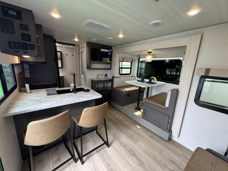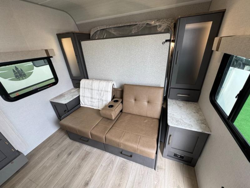 This Forest River IBEX travel trailer has a clever use of space that gives you a lot of options. The kitchen features a countertop with bar stool seats, or you can eat at the booth dinette that is tucked into its own slide out so there's plenty of floor space. The sofa is across from the entertainment center so you can relax in the evenings. When it's time for bed, there's a 60" x 80" Murphy bed which will be super comfortable for a good night's sleep! The rear bath has a roomy shower plus a wardrobe and linen closet to store all your things.