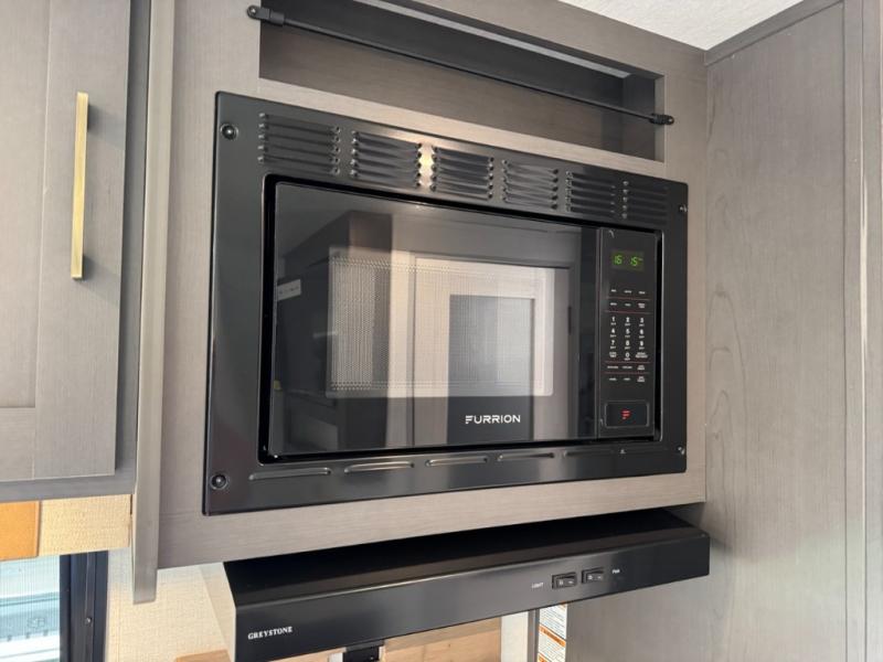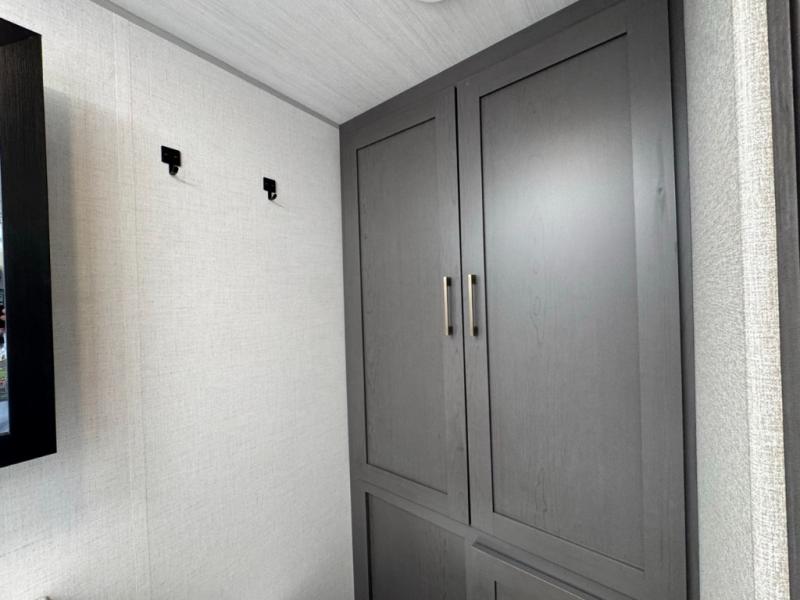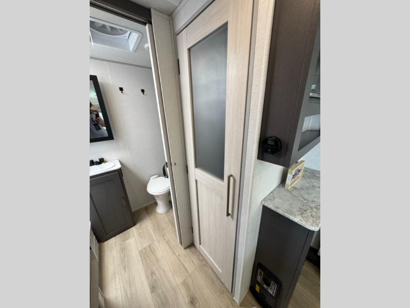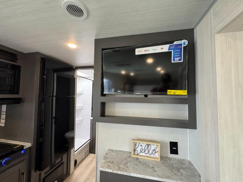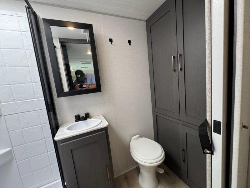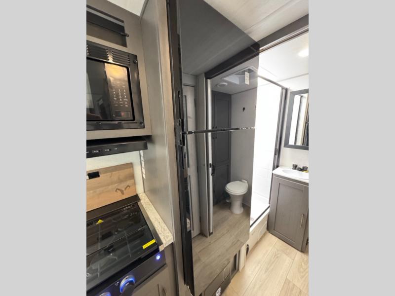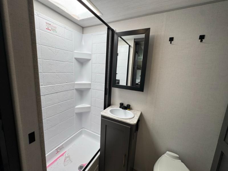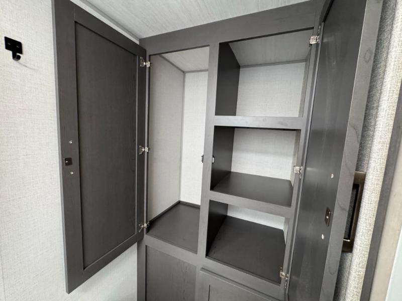 This Forest River IBEX travel trailer has a clever use of space that gives you a lot of options. The kitchen features a countertop with bar stool seats, or you can eat at the booth dinette that is tucked into its own slide out so there's plenty of floor space. The sofa is across from the entertainment center so you can relax in the evenings. When it's time for bed, there's a 60" x 80" Murphy bed which will be super comfortable for a good night's sleep! The rear bath has a roomy shower plus a wardrobe and linen closet to store all your things.