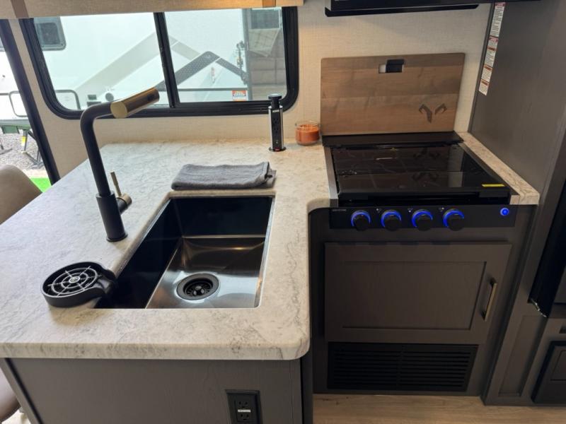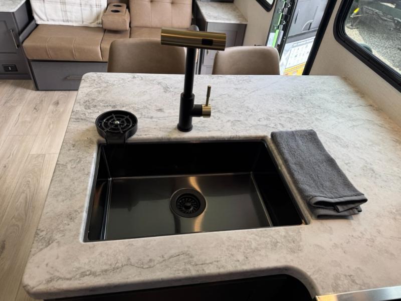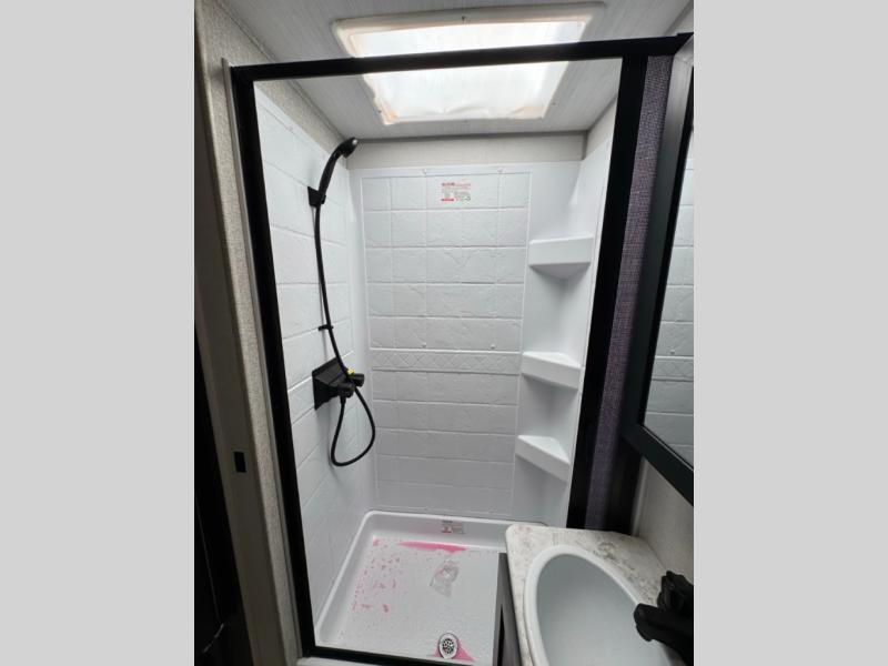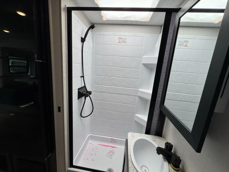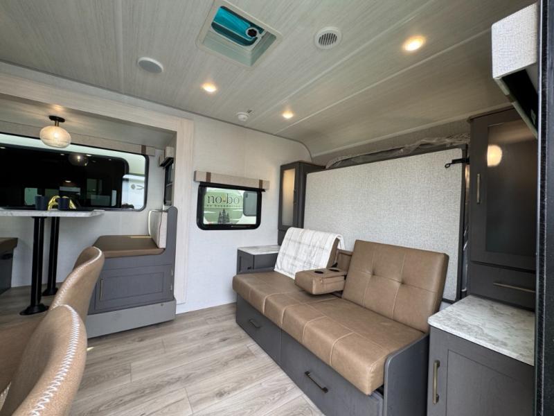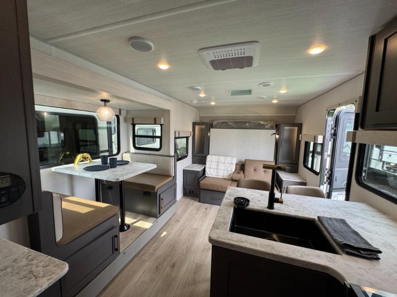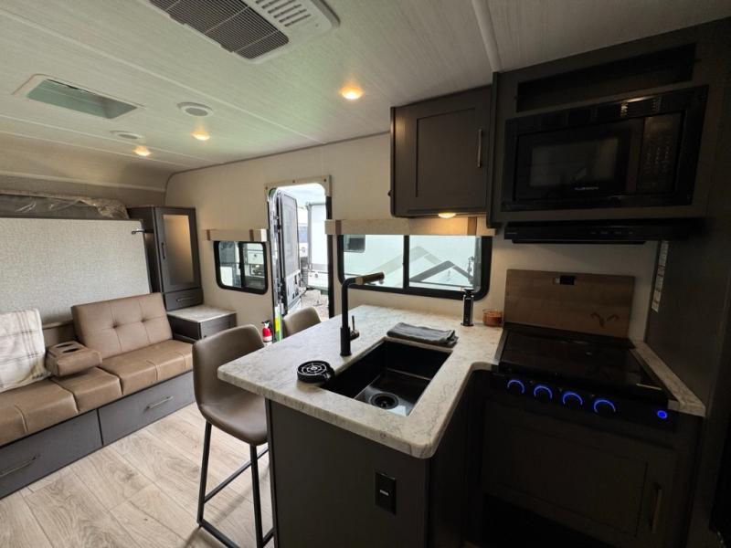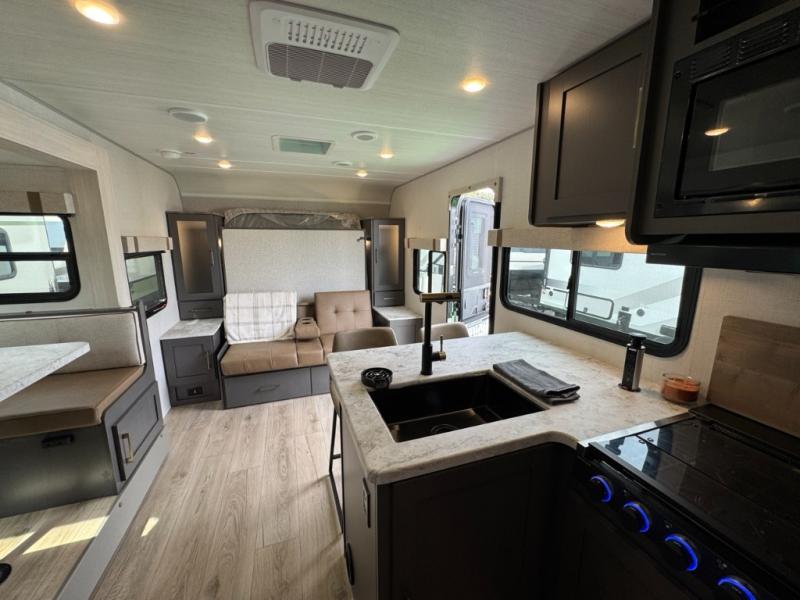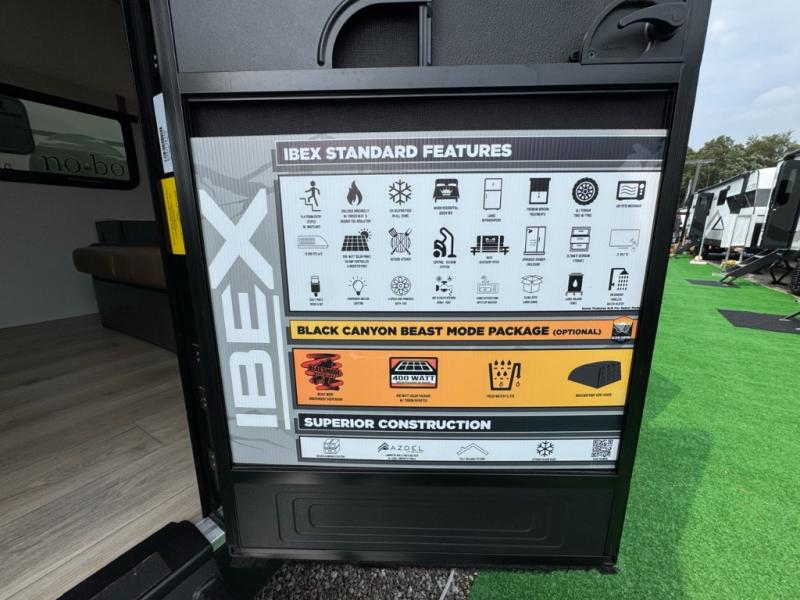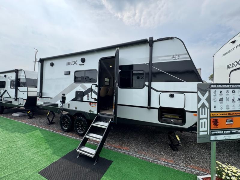 The Forest River IBEX travel trailers are extended season ready, and adventure approved! They are built with a fully walkable PVC roof, a welded aluminum structure, and laminated walls and slide outs with Azdel composite panels. There are also all-terrain tires with TPMS, a hot and cold exterior spray port, and large holding tanks for added convenience when you're set up off-grid. The USB-C ports inside and out will help you keep your electronics charged, and the premium window treatments will make your trailer feel more like home. Black Canyon Beast Mode Package is equipped on this unit with an independent suspension, a 400-watt solar package, a fresh water filter, and a Maxxair roof vent cover.