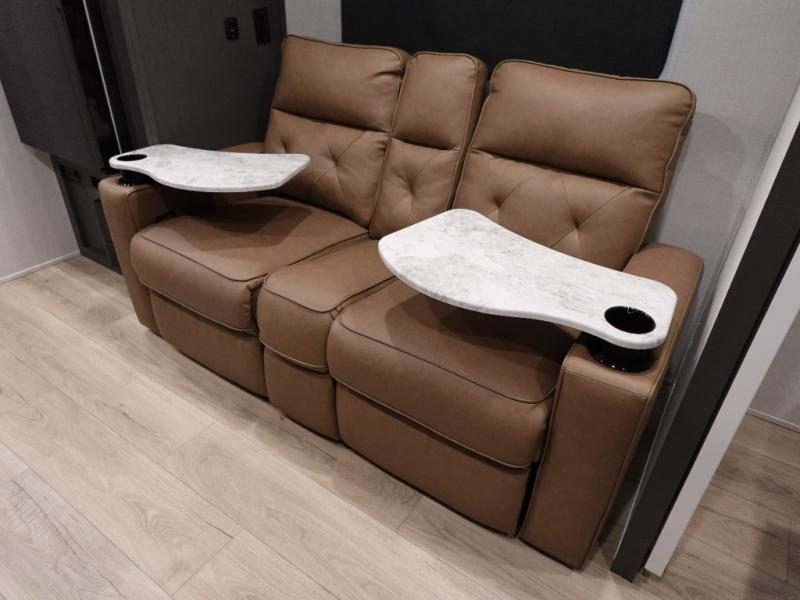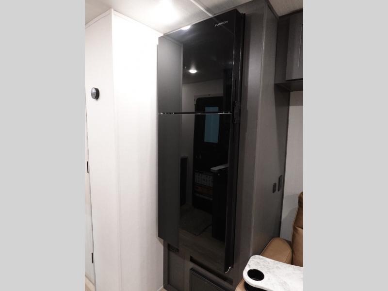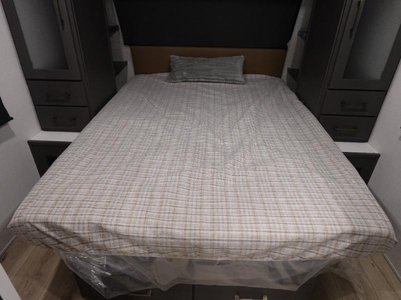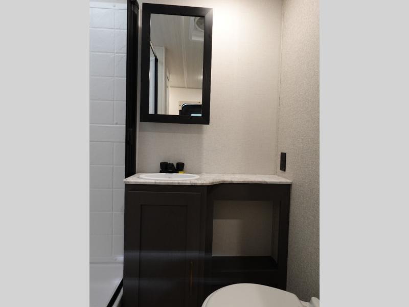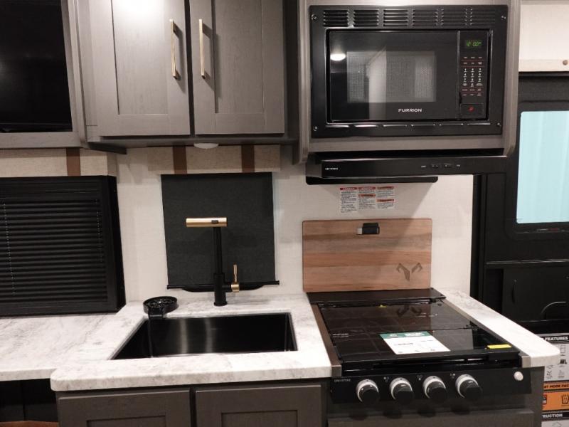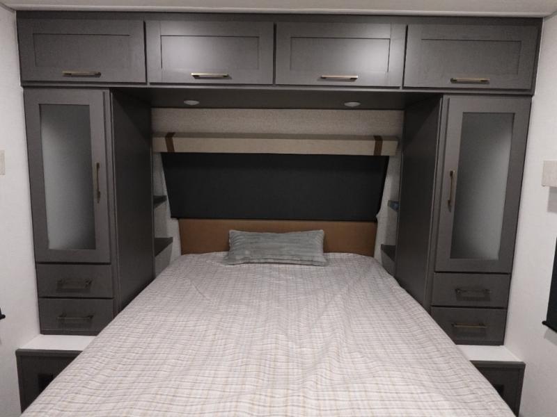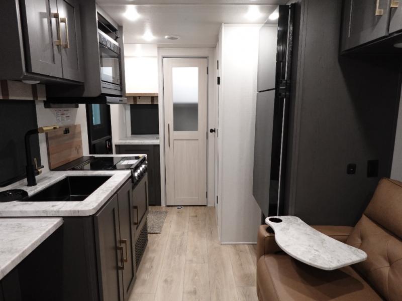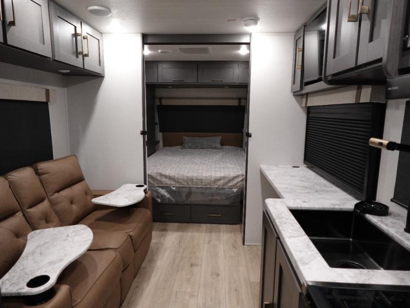 Wherever you decide to camp, you can be sure to have a great time in this cozy travel trailer. A front private bedroom will make you feel right at home, and there are dual bedroom wardrobes to keep your things organized. Once you've made breakfast on the interior cooktop or outside kitchen, you can enjoy your coffee on the theater seating or under the 16' awning. This unit also includes a walk-in pantry, a hutch with a shelf and overhead cabinets so nothing gets left behind!